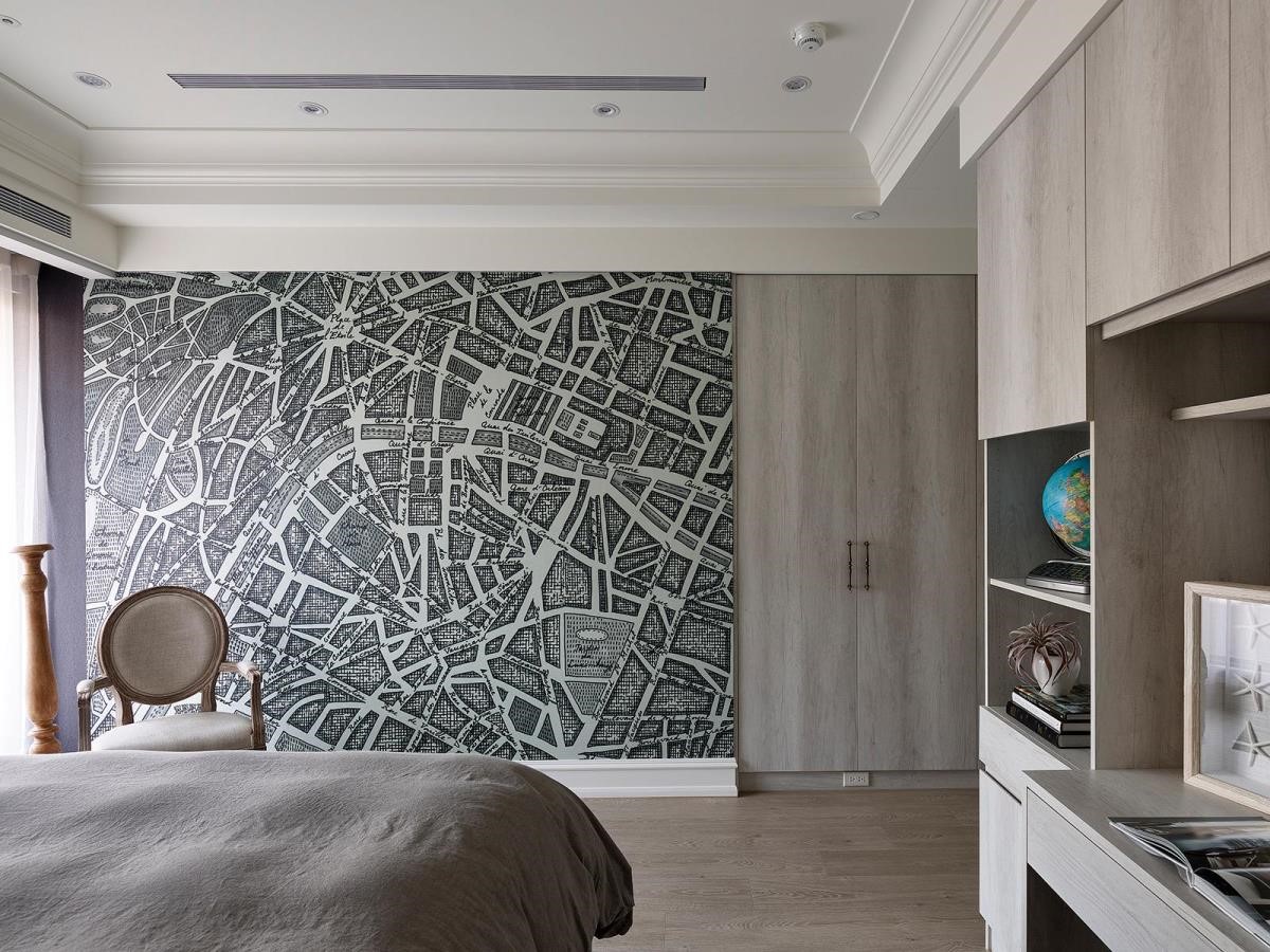 CASE 01 与加拿大无缝接轨,复制海外居家布置 尽量减少木工施工、简化不必要的装修手法,天花板以大器线条作重点装饰,并选用优质如 "伊森•艾伦"、"STICKLEY" 等历久弥新的家具品牌,以软件作为聚焦的主角,而开放书房的书墙,则一体成型内镶于墙里,并摆放珍藏精装书,搭衬保养得宜的旧书桌,重现美式古典的风雅灵魂。客房预留给还在国外念大学的儿女,则透过墙纸带出巴黎地图视野,诠释年轻人对远方的情怀,搭配地球仪收藏品,让整间卧房充满着旅行韵味。