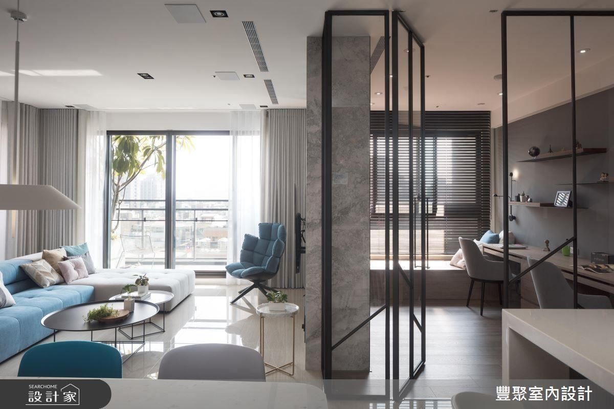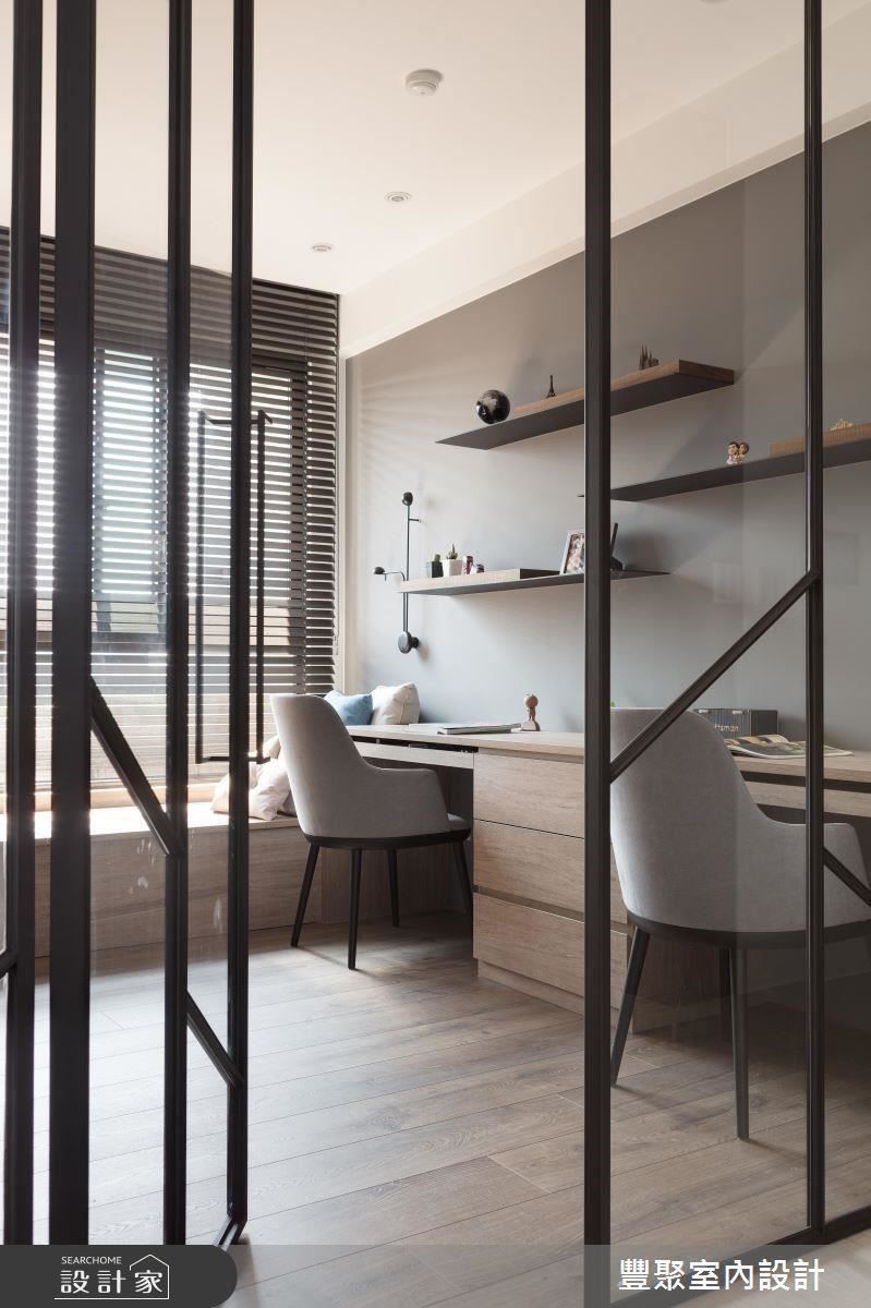Tips 02 收纳融入空间,成为令人惊艳的视觉焦点 从玄关进入,入门区地面与室内以仿清水模地砖,区隔出一处落尘区,令人感受到沈稳的家居样态。格局在预售房时即规划好,将客餐厅作为凝聚家庭的重心,因此客厅与书房虽然隔着一道墙,但书房以铁件结合玻璃的穿透设计,既能保有所属空间,又能带来零距离的互动。书房的飘窗区,让女主人能在一旁休憩、陪伴,并且兼具收纳功能。客厅沙发背墙,原本是封闭的空间,设计师将此处作为展示端景区,利用推拉门设计,让每扇门板后面都能有丰富的收纳展示空间。
