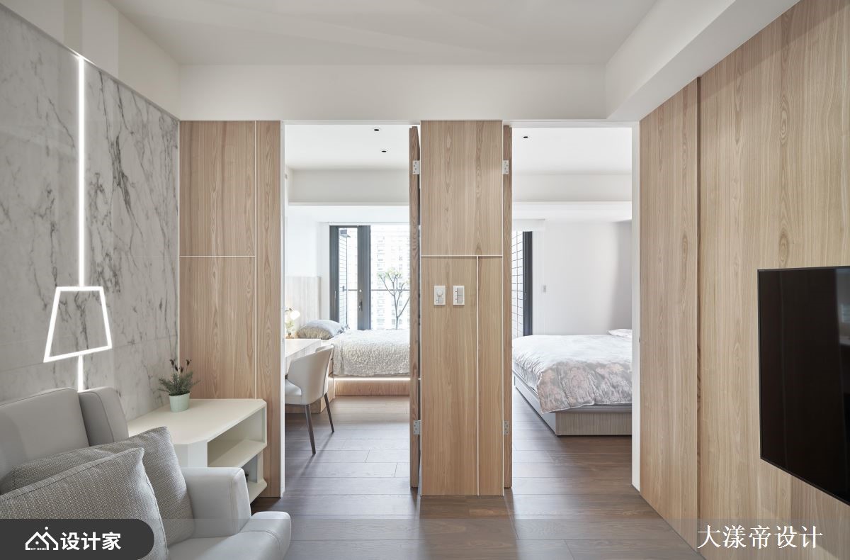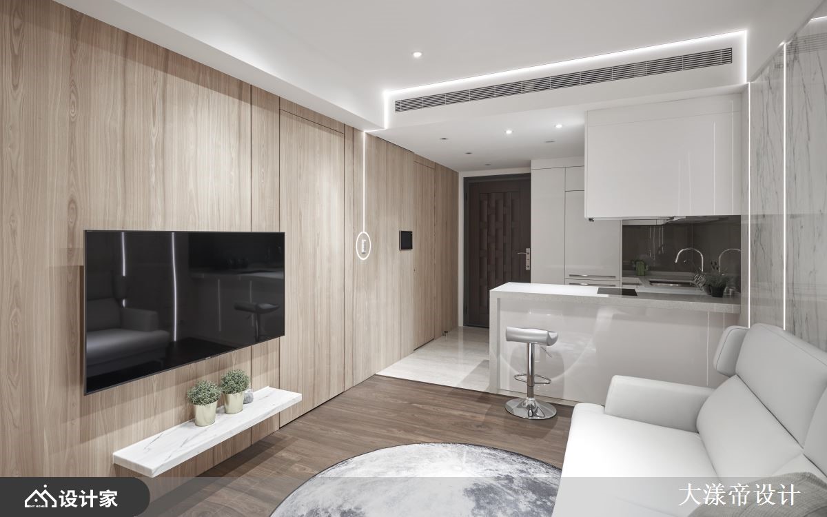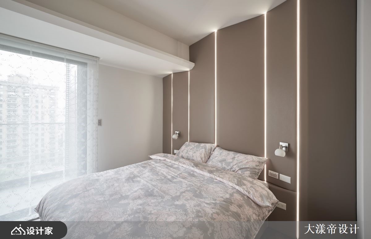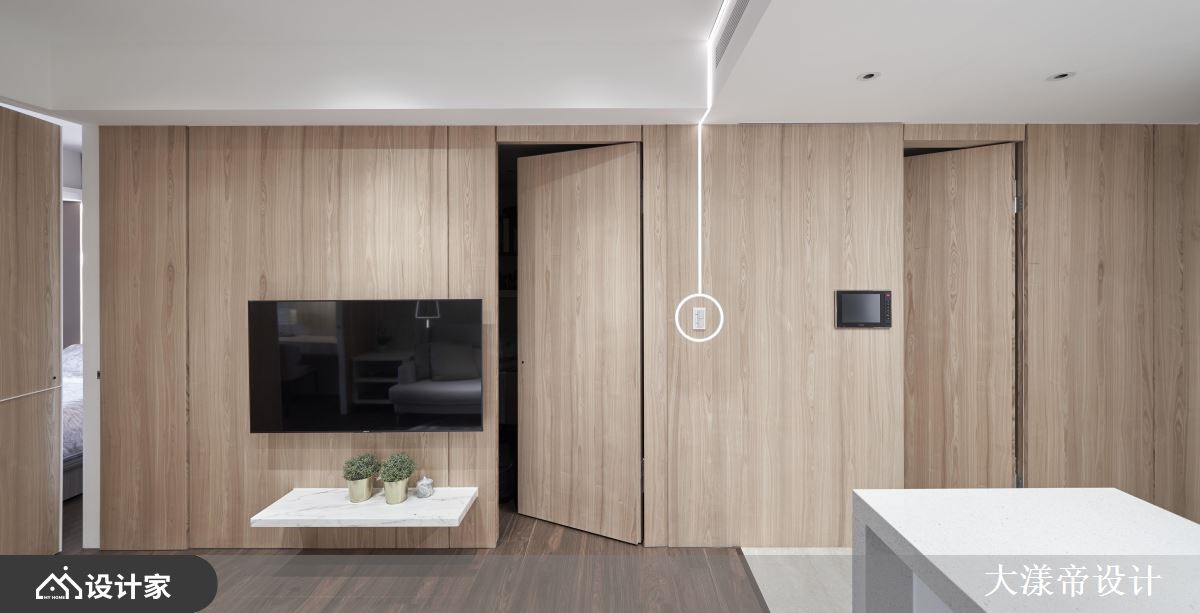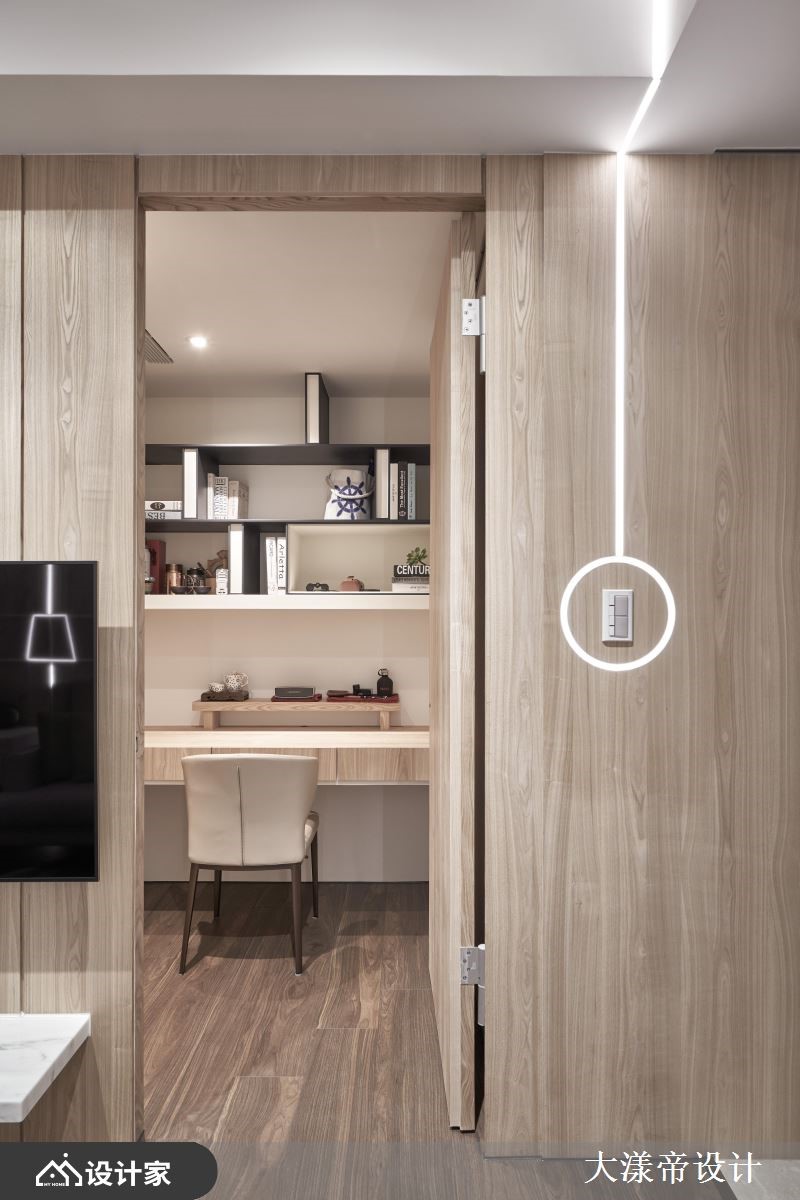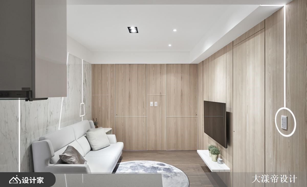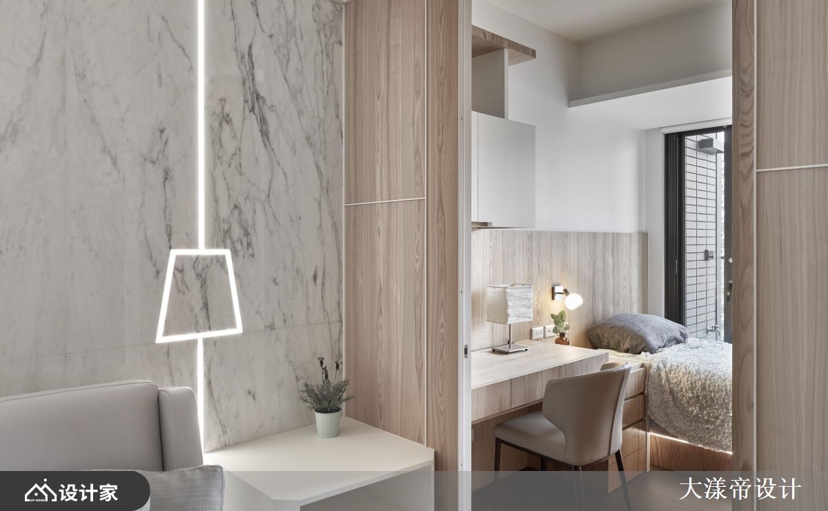 灯光开启时,游走整室的光束替 43 平米空间挹注圣光般意象,完美传递「上帝之手」的设计主轴。风格上以现代风衬托,并重塑格局打造完备机能,提供 4 人舒适的共享生活。【好格局立大功,让「好窄」变「好宅」】如何在 43 坪米空间规划客、餐厅、主卧外,还打造客卧、书房及更衣室,为此案设计重点!入室后,首先迎接ㄇ字型的餐厨空间,设备及风格简练,以保留客厅场域的宽敞,中岛吧檯作为客餐之间的中枢地带,串起两个区域的交流,并透过深色木皮地坪分野场域;来到客厅区,沙发背牆以浪漫带点奢华的整面大理石转换风格,再让光束从电视牆一路延伸至大理石,映衬出空间的明亮及新颖设计,也为冷调石材注入些温度。主卧、客卧、书房、浴室的牆面及门片,採以同色系木质隐身于公共空间的立面,化解门片过多的视觉感,再透过切割设计配合垂直的灯光装饰,连贯立面整体性。 小编的最爱 主卧同样以光为装饰主角,床头背板巧思崁入垂直状光束,沟缝处微微透出的光影反而凸显了光的视觉强度,而略为倾斜的造型柔化樑线的位置,一同加乘设计感。设计师克服重重难关,从开关的圆型框线光、大理石牆带有折射意象的光束、主卧床头背板的崁灯,颠复居家打灯的营造手法,以满足 1 家 4 口的梦幻生活样貌。