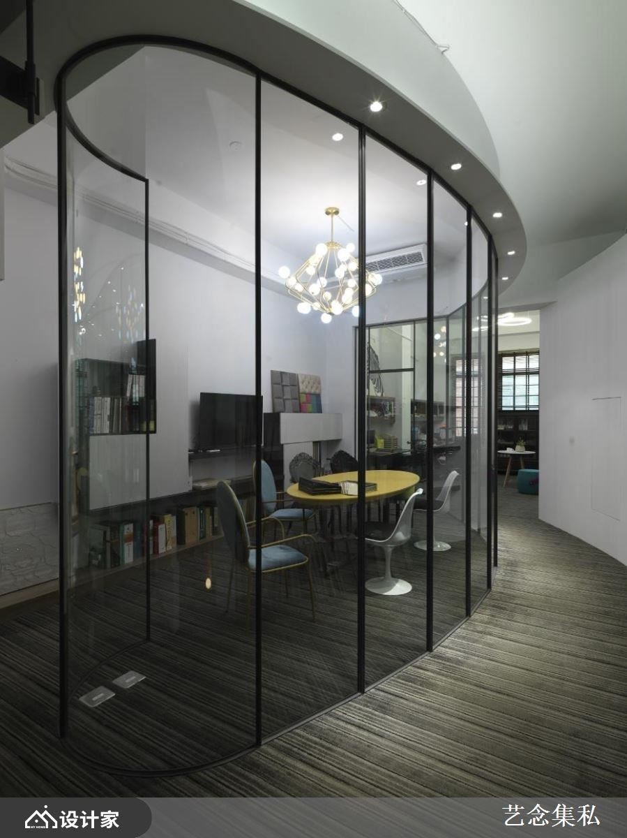 室内设计师的办公空间会是何种样貌?缓步上楼,便是艺念集私的办公空间,除了一般办公区、铁框玻璃隔断座位区之外,中间还有一处椭圆 "玻璃会议室",一方面能将面街处窗户光线自然延伸至屋内,解决长屋户型中段采光不足的问题;二方面也能让空间有了更加宽广通透的视觉成效,且椭圆造型巧妙留下了廊道宽度,丝毫不影响空间动线。