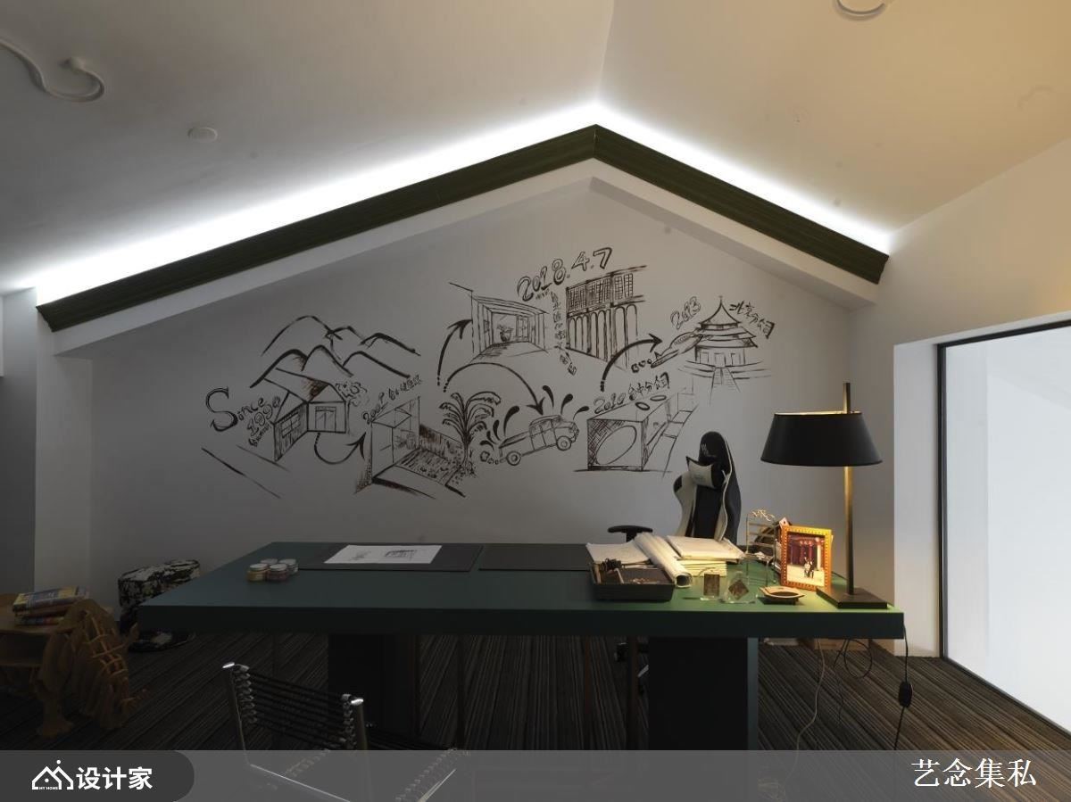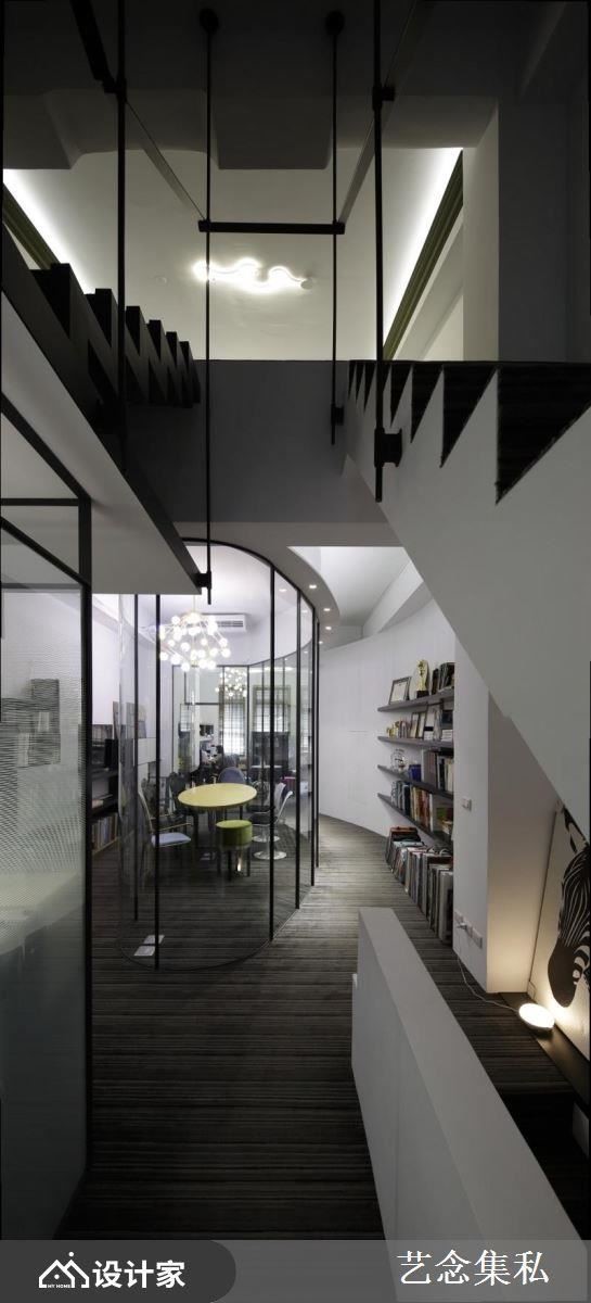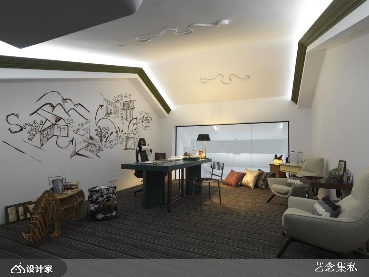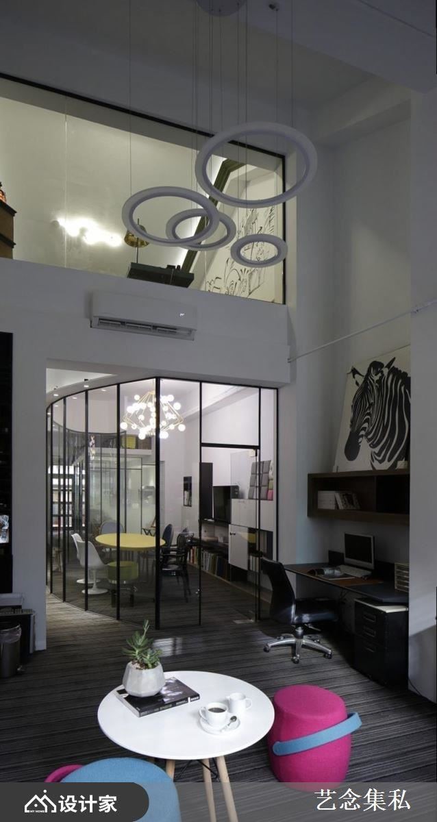 此处是以复式楼层作为二楼设计,挑高处正是总监的办公空间,设计总监张绍华、黄千祝运用工业风铁艺与玻璃呈现混搭风格,既有阁楼工业的粗犷韵味,又有现代风格的简练、利落线条,并轻缀色彩家具,优雅温润有如家居情境。