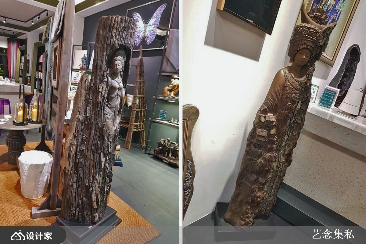 为了呈现有如 Gallery 高端艺廊和 Select Shop 选品店的调性,设计师以擅长的混搭风装修,将轨道灯、不规则隔层的铁艺展示柜,在台湾味十足的大稻埕长户老房里,辅以新中式底蕴的灯具、西洋的工业 Loft 风格空间,再搭配精致细腻的珐琅水晶画、颓倾旧靡而庄重朴实的古沈木雕像等商品,设计师在挑选艺术文物之际,同时也塑造出专属于艺念集私的品牌形象:中西合璧、新旧层迭且多元混搭。