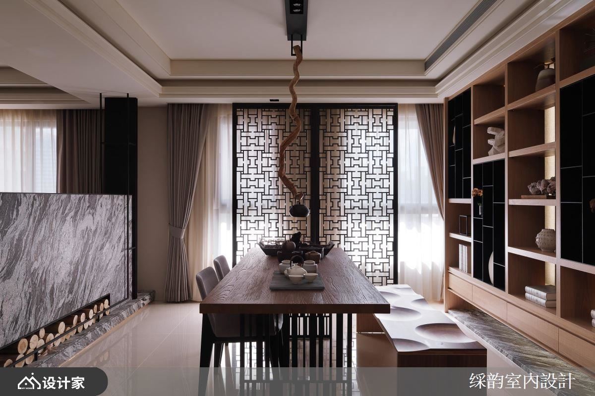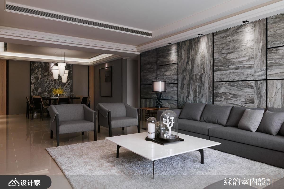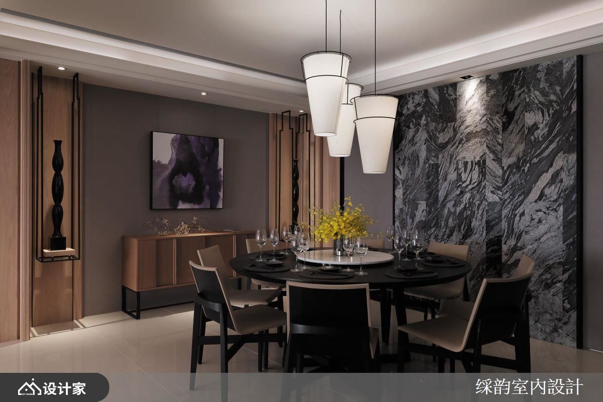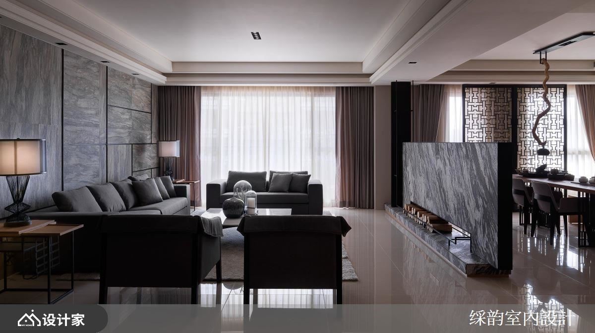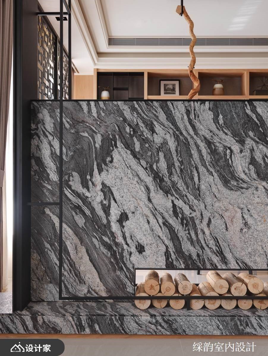 石材妆点豪宅大器风范!此案在公共空间大量使用天然石材作为视觉主轴,藉由大理石的层迭、排列,形塑中式豪宅的东方意象,像是客厅主墙深底浅纹的灰阶石材,与电视墙、餐厅主墙上奔放不羁的泼墨云纹遥相呼应。