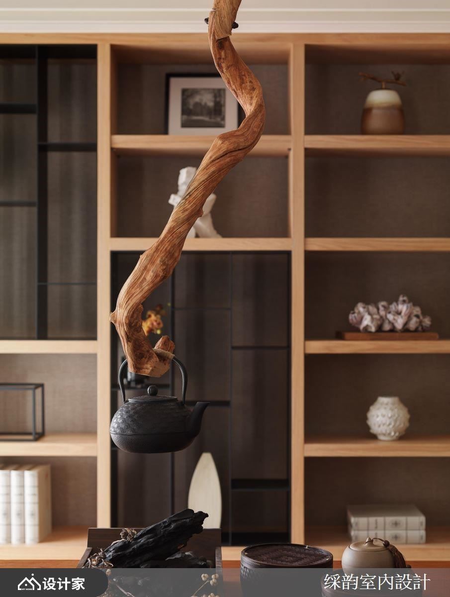 至于电视墙其后便是开放型茶房,悬于其室的漂流木枝除了有吊挂茶壶的实用机能,更是空间里的软装亮点,朴拙语汇与茶室清香,为中式人文豪宅注入云水禅心的深沉韵味。