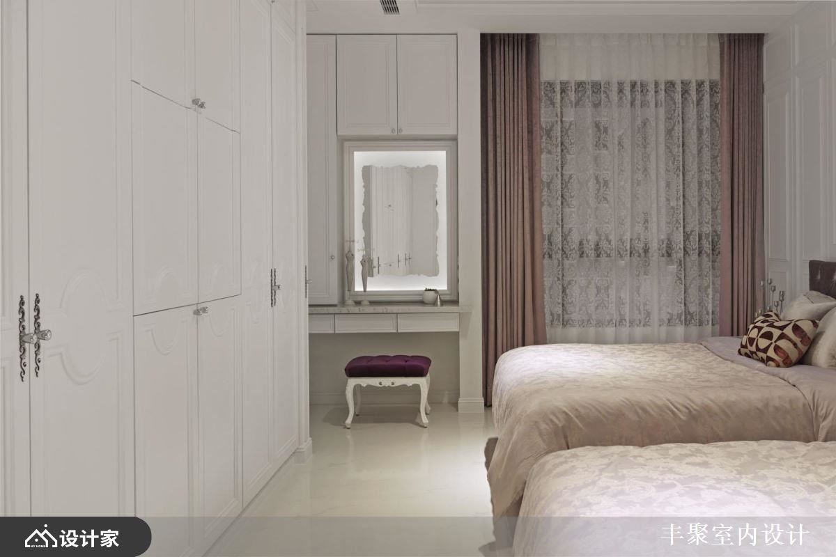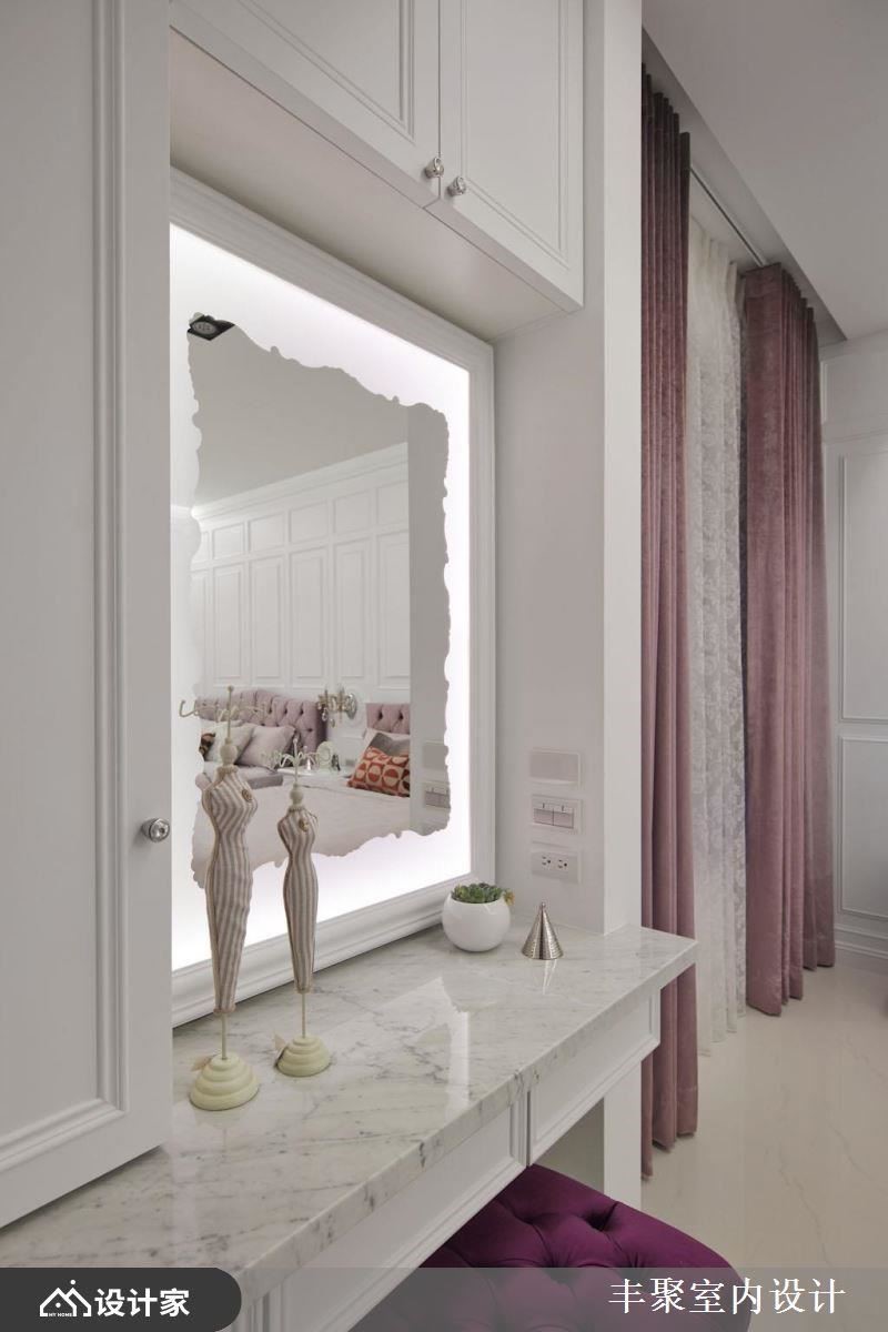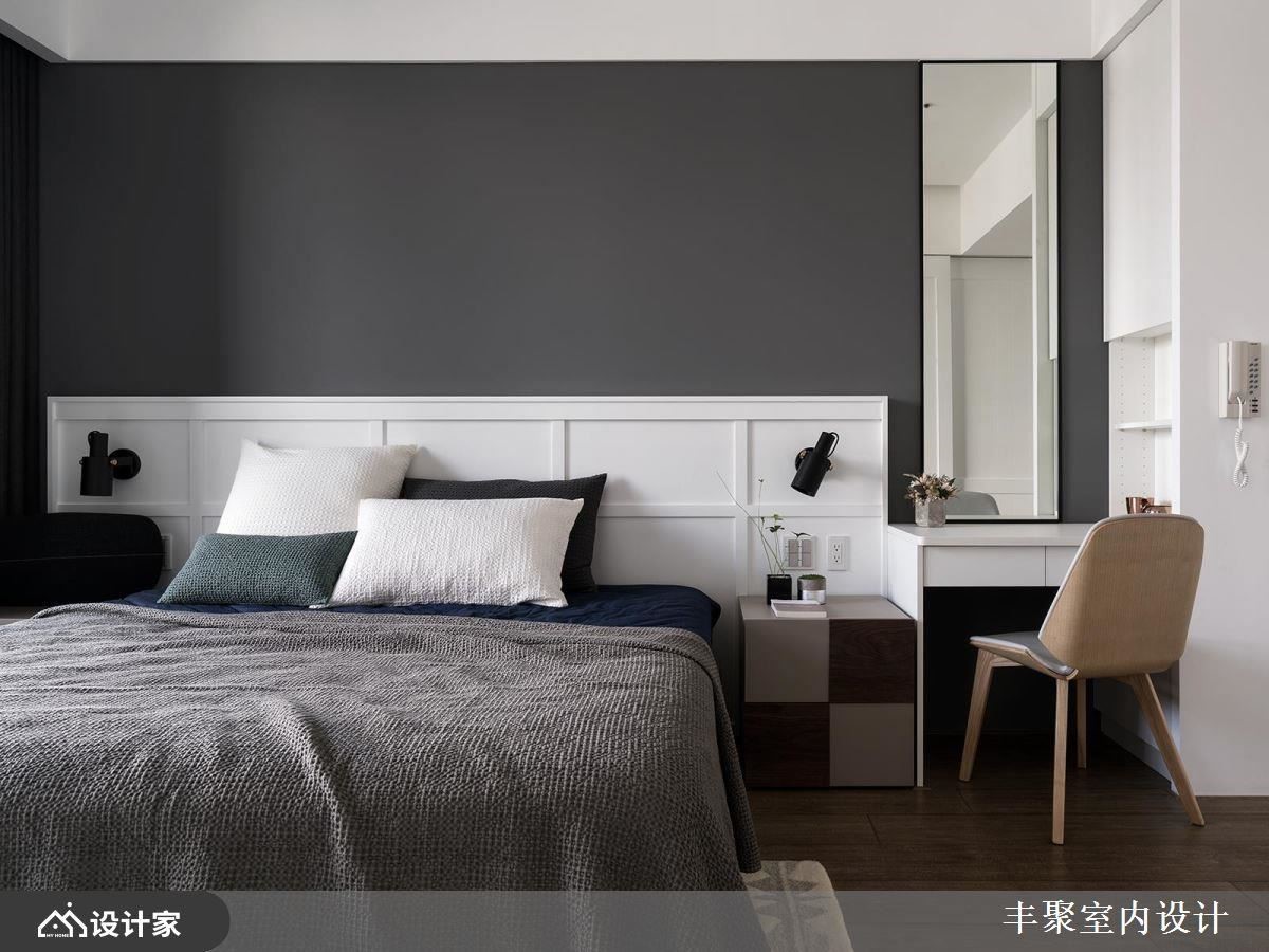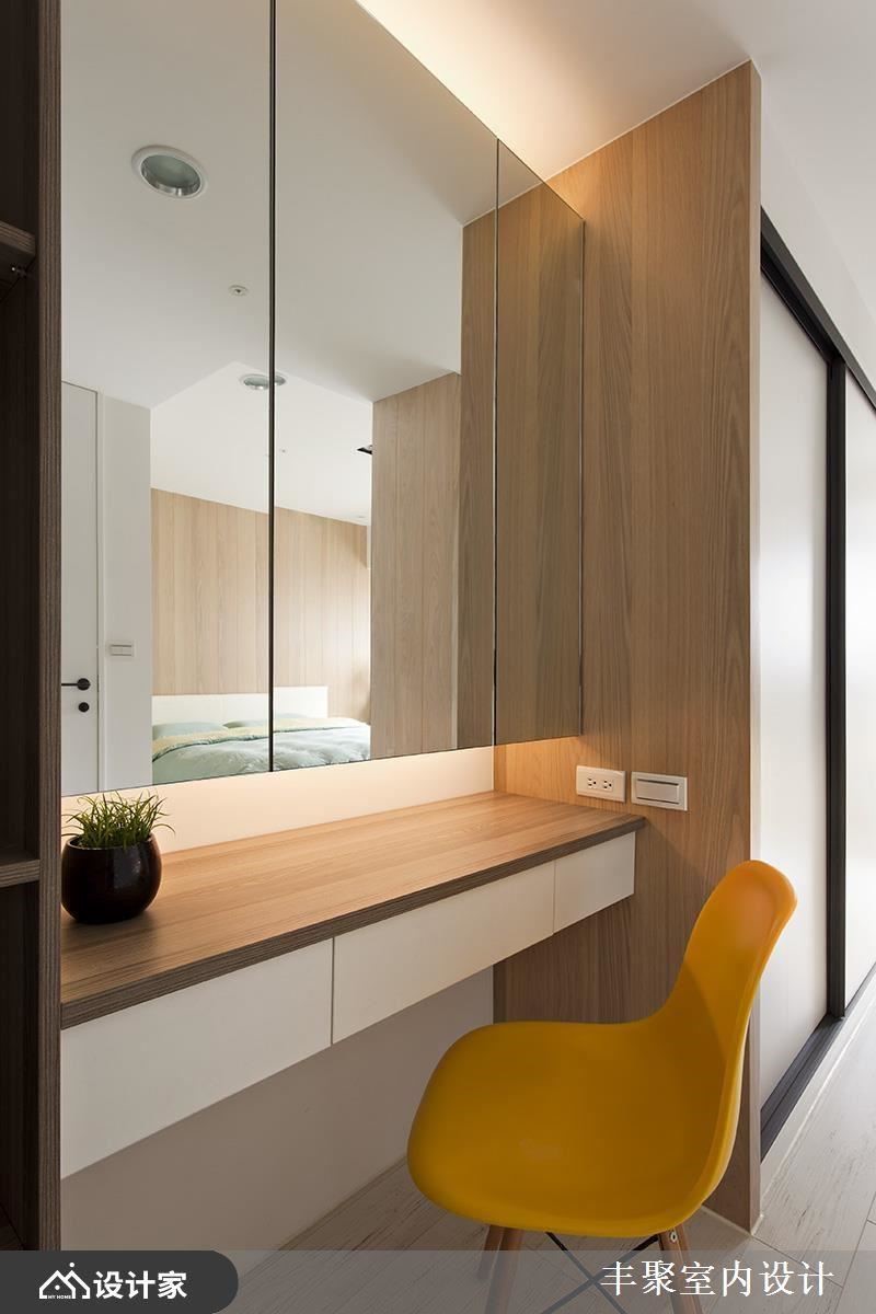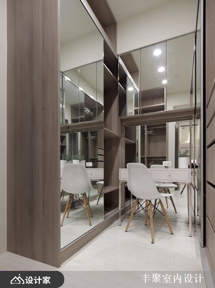把梳妆柜和衣柜组合在一起,镶嵌于整组家具之中,不只整体感强,也更合乎使用习惯,将日常化妆、整理仪容的需求都汇整在此,一大一小的镜面除了兼顾妆容与衣着搭配,无形中也达到放大空间感的作用。