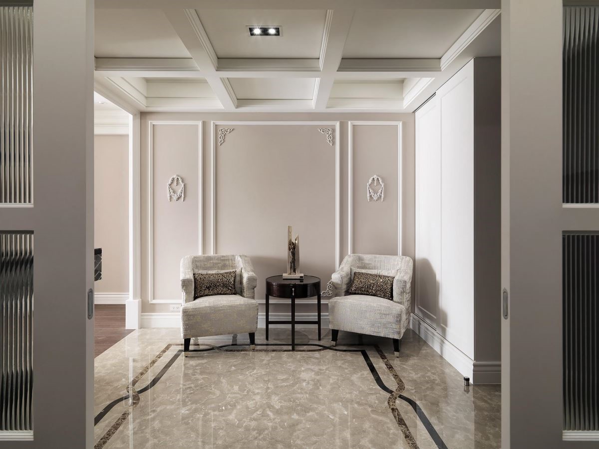 对称是新古典最常见的设计语汇,设计师刻意扩大独立玄关,打开拉门入眼的是完美对称的线板墙面,搭配宛如对话般的沙发坐椅,谁说玄关只是作为鞋柜储藏区?这是悠闲感独具的起居室。