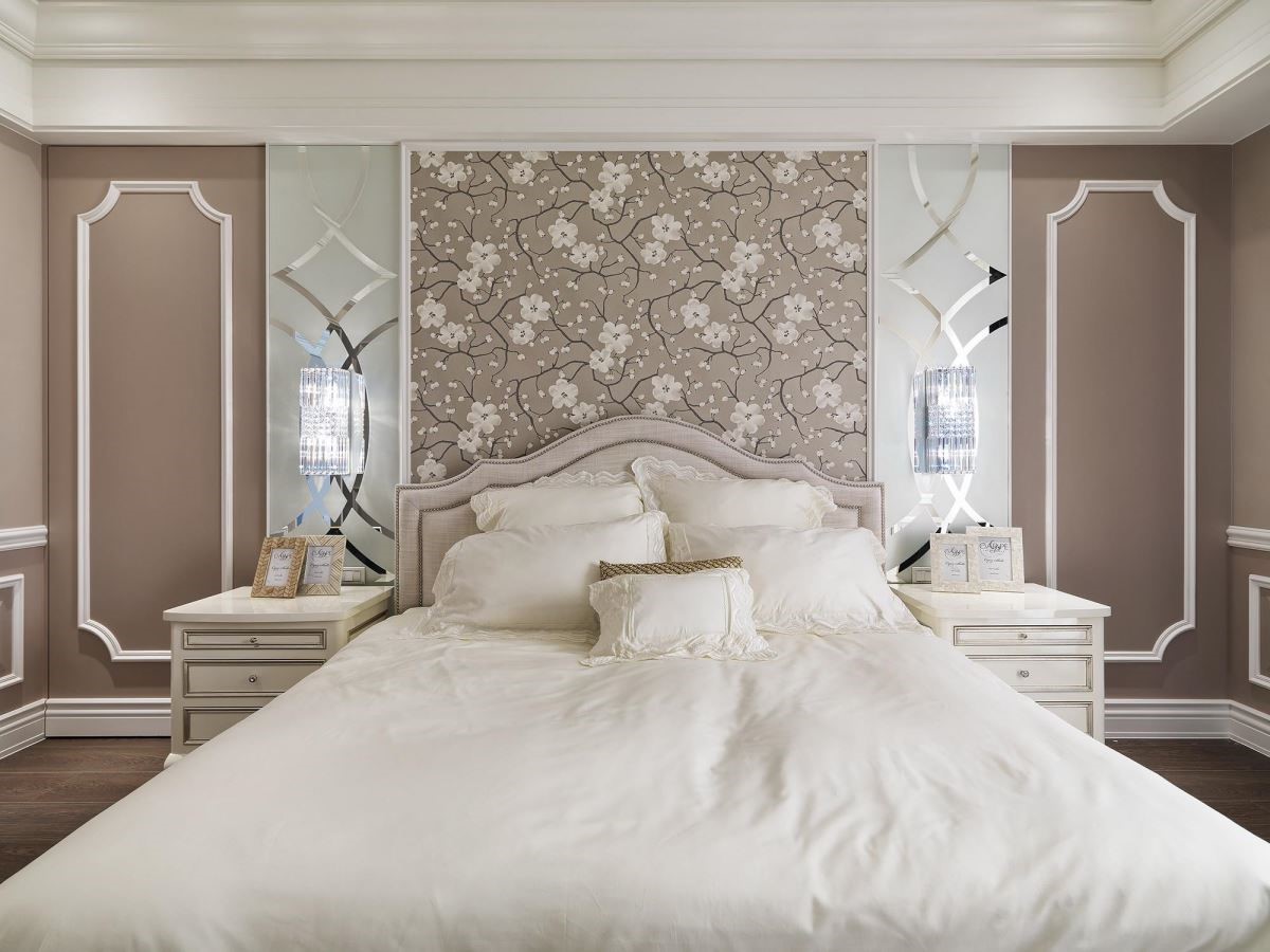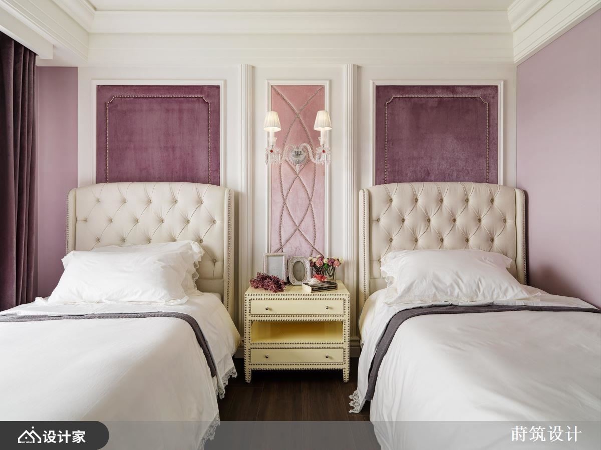 同样是卧室的床头,却利用图腾及床组家具,呈现出不同的对称美感。色彩典雅的主卧以大双人床居中,线板墙、图腾饰面分立两侧,材质多元温润大器;女儿房则以深浅有层次的浪漫紫丰富背墙色彩,藉矮桌各自独立,合并又美不胜收。