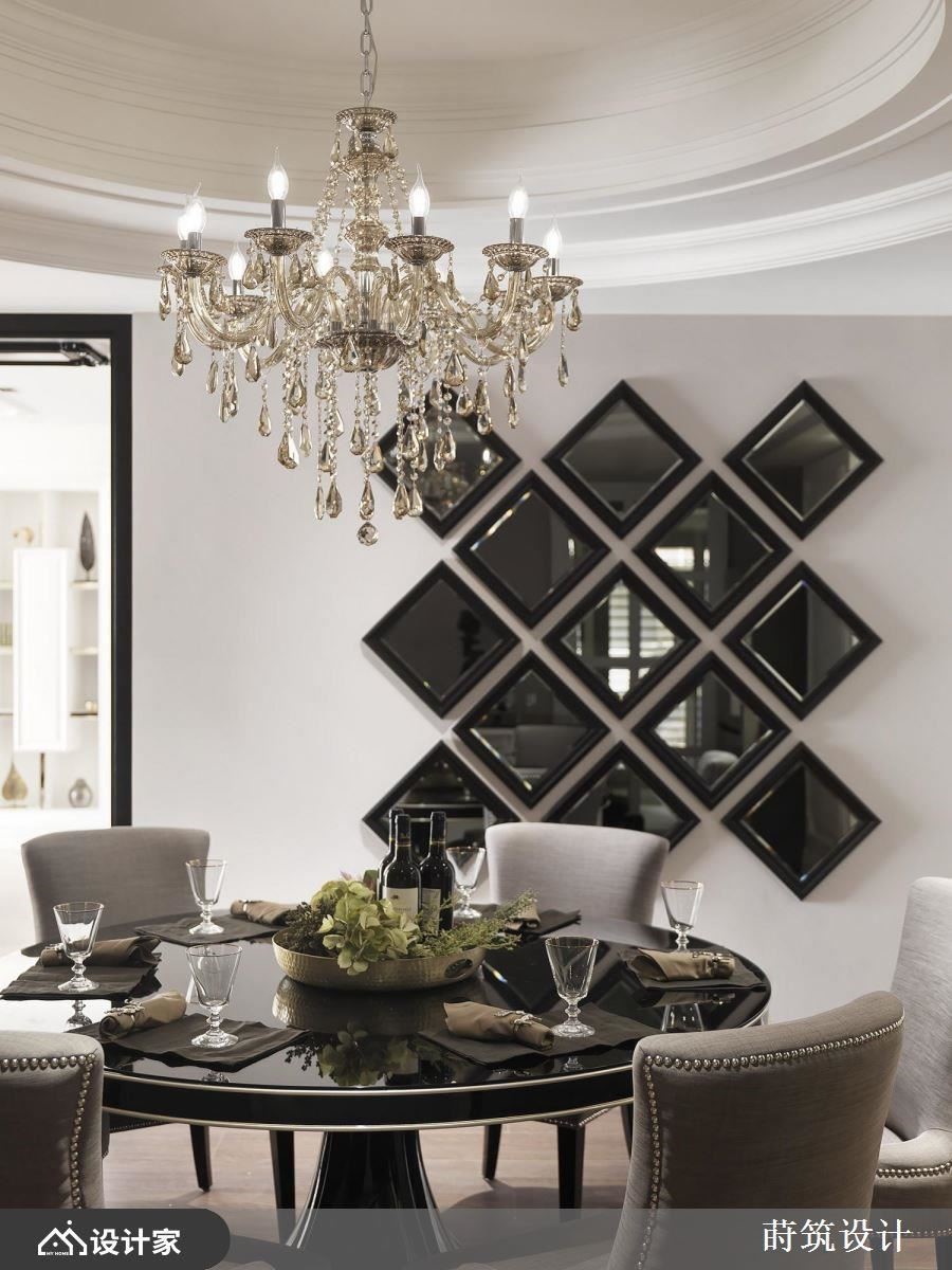 餐厅最常使用镜面设计,以加框菱型灰镜拼出造型,在水晶灯映照下,既有华丽的美感质量,又有反射光影放大空间的效果。