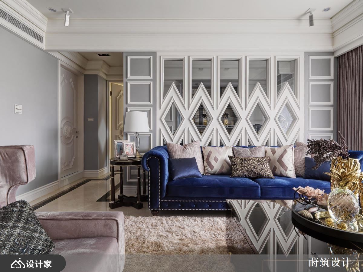 设计师将女主人最爱的经典菱型格纹融入沙发背墙的设计,明显的线条切割,以镜面为底衬出立体质感,客制化量身打造的图腾,让这个家独一无二。