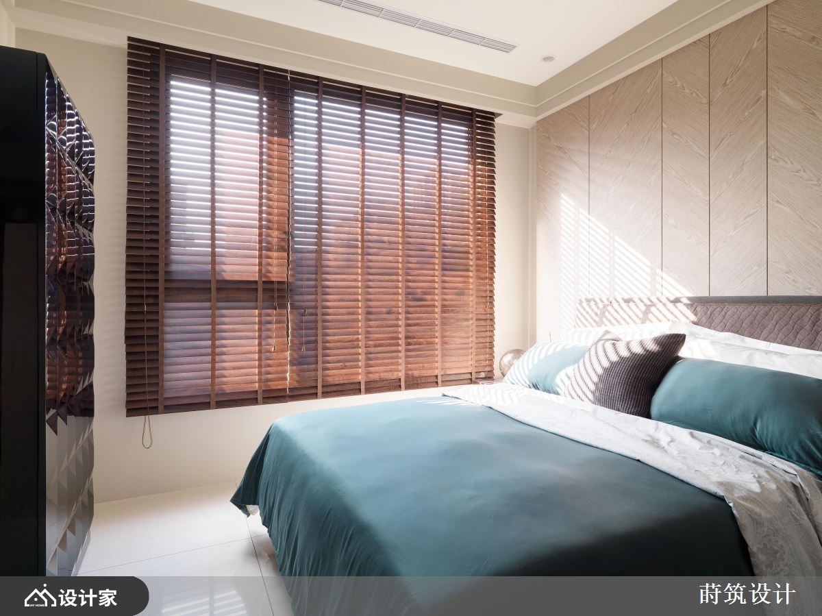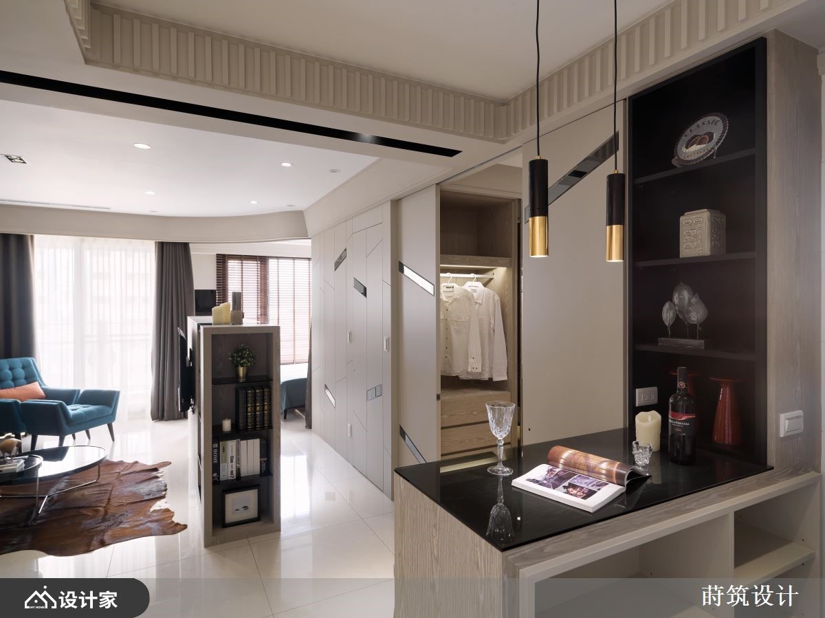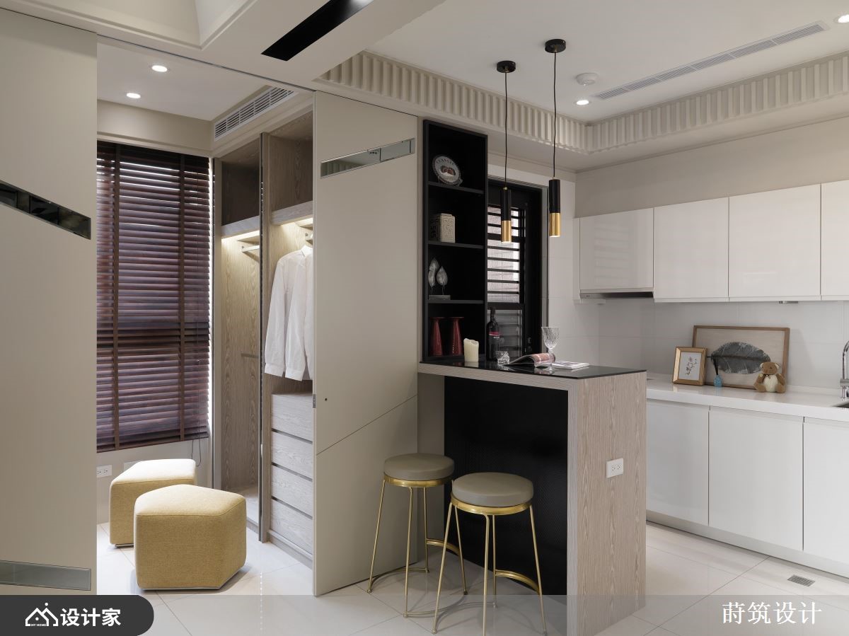 设计师依据使用者需求、挹注空间机能,并借着线条、格局与动线的擘画拓大视觉感受,让居家每个角度都充满令人惊喜的风景,快跟着小编一起来看看吧!厅区规划放低的电视墙,成为界定场域的隔间墙,保有光线与视觉的串连,并形塑空间放大感,电视墙则结合展示与收纳功能,成为一物多用的机能量体,而天花更加入了流畅的圆弧流线、串起视觉动向,展现挑高的视野场景,同时加入跳色手法,藉由家具的轻盈点缀,增添居家中的朝气活力,尤其沙发墙的一整面壁纸背景,更在光线烘托之下,营造出大自然般的田野风情;循着流畅动线,卧室床头,承袭与客厅电视墙的相同木纹,定调出自然温润的魅力,并搭配木百叶筛落光线,营造不同时序的光影之美!小编的最爱 厨区配置了小巧精致的吧台,局部饰以金属建材呈现精致时尚感,并额外规画专属更衣间,让小小的居家机能与美感俱全!