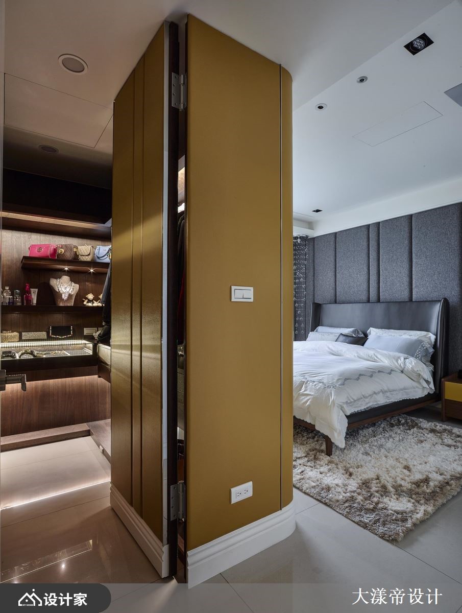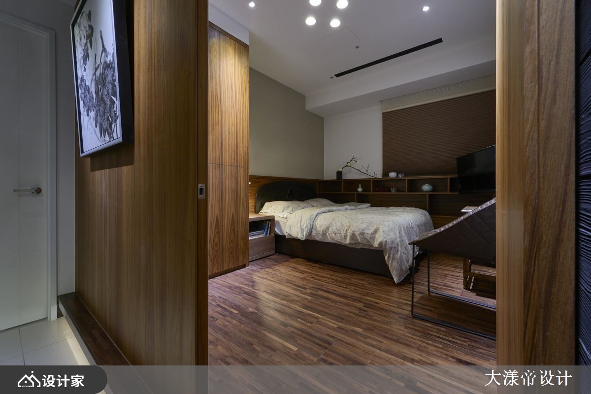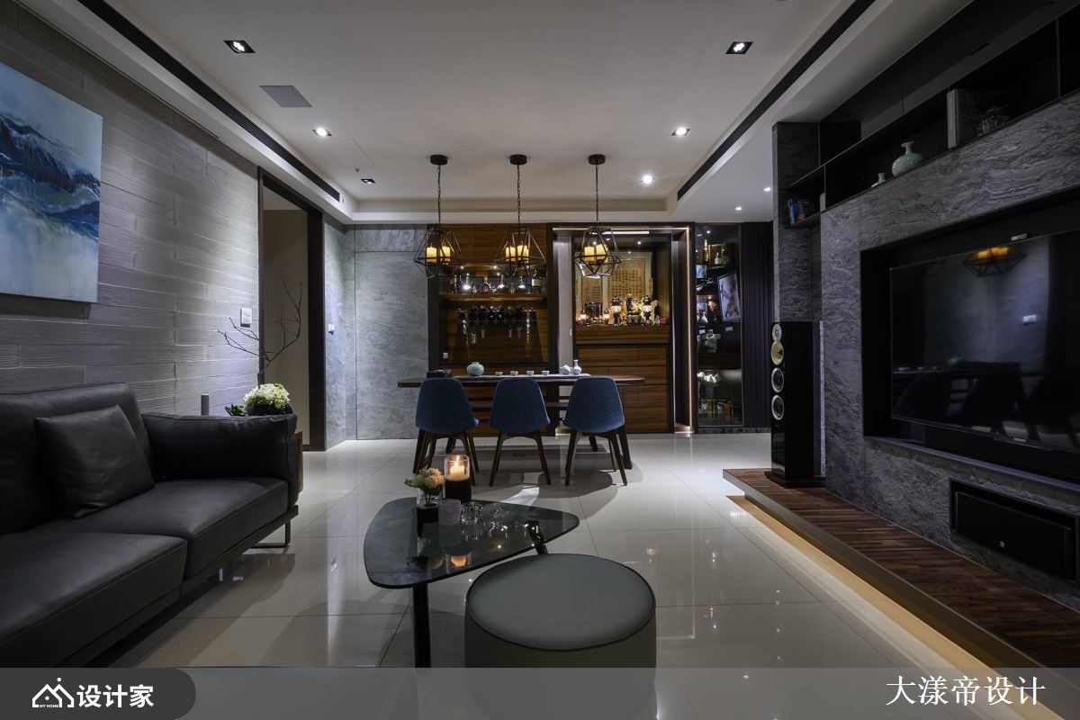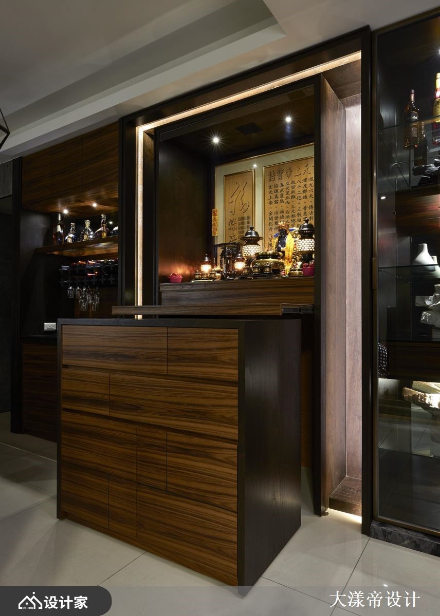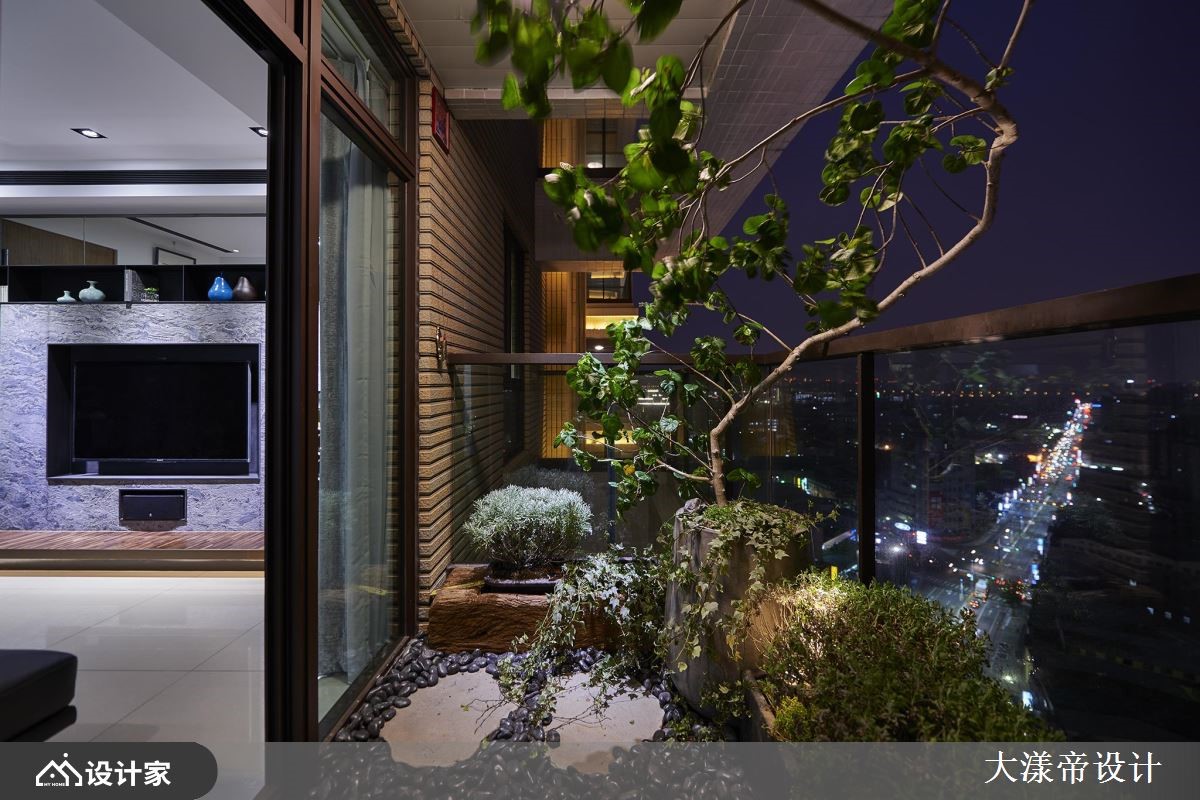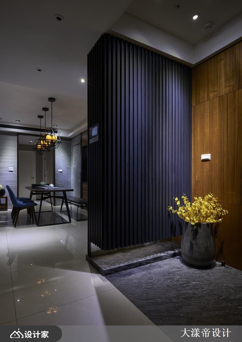132平米的新中式风宅邸原先是三居室的格局,由于家有长辈的关系,所以特别再隔出一间孝亲房,并于餐厅位置规划佛龛,在满足长辈需求的同时,又将西方元素融入家居中,营造时尚又沉着的空间气息。【高级灰大理石,创造低调大气感】玄关运用黑色木格栅与木质饰面墙,及地面的深色石纹,让人一入门就感受低调内敛的家居韵味。客厅采用高级灰大理石妆点电视墙,并利用格栅柜体收纳视听设备,使立面大气又具有机能性。沙发背墙选择清水混凝土涂料装饰,使空间呈现一致的沉稳调性,又能拥有不同的纹路层次。餐厅于墙面依序安排格栅鞋柜、佛龛、展示酒柜以及隐藏门,多维建材的转换凸显出同面墙的不同机能。主卧透过灰色裱布墙延伸整体的淡雅品味,且于芥末黄电视墙后方,规划摆放精品、珠宝的更衣空间,创造时尚有机能的睡眠环境。孝亲房铺设海岛型木地板,避免长辈起床时滑倒,且双脚不会直接碰触冰凉地面。小编的最爱阳台藉由植栽与鹅卵石的搭配,营造带有禅味的空中花园,让人可以在此眺望城市夜景,沉淀内心的纷乱情绪。