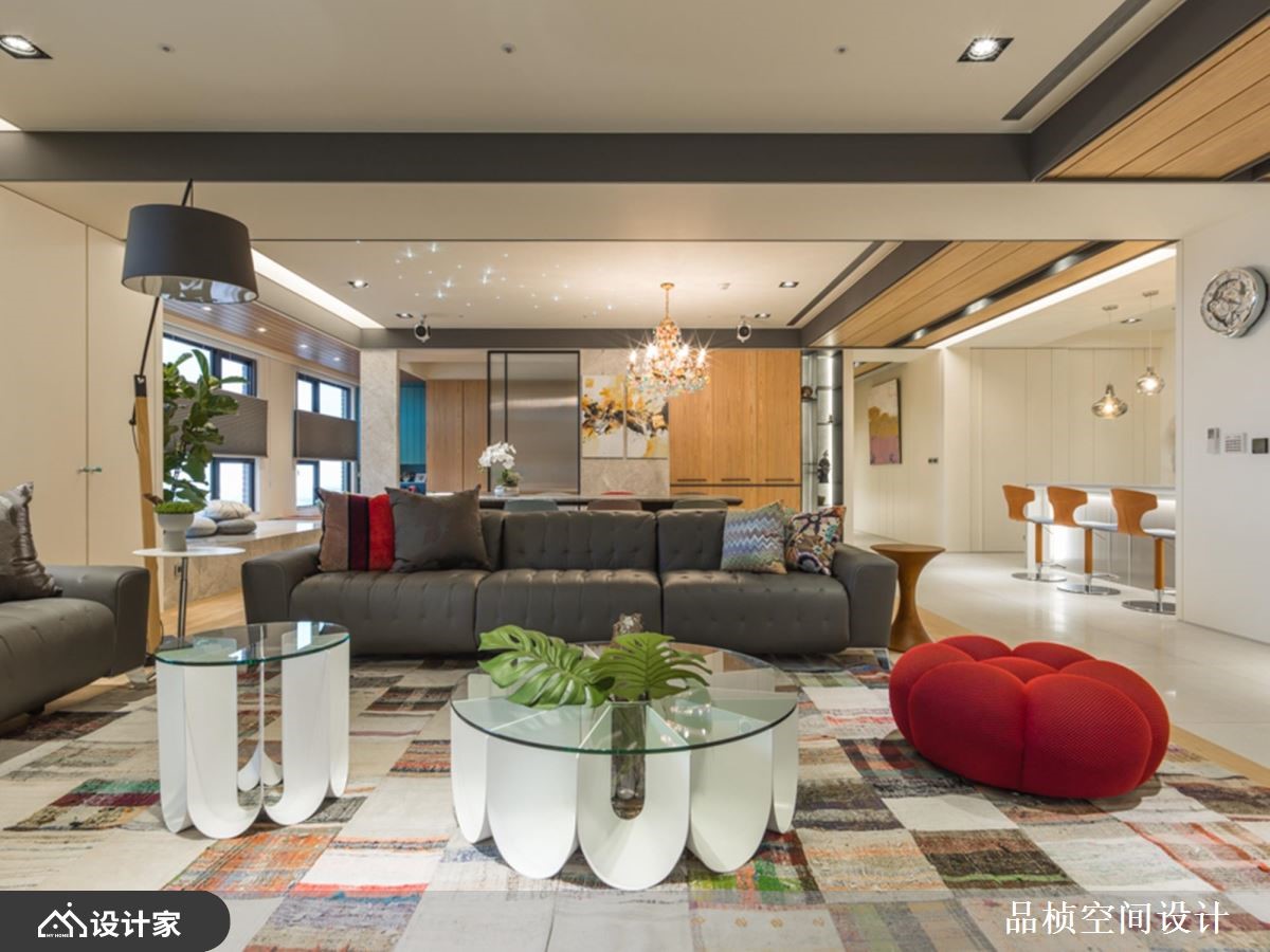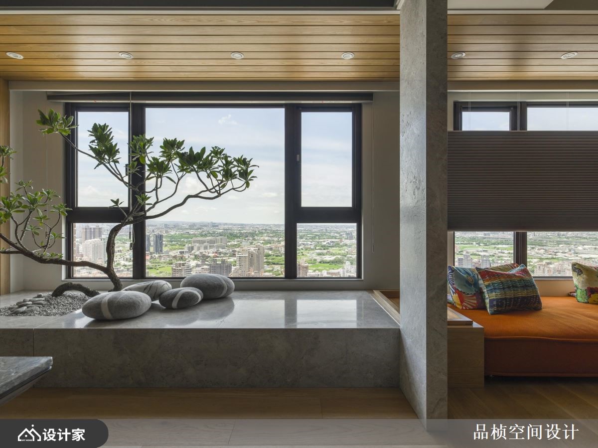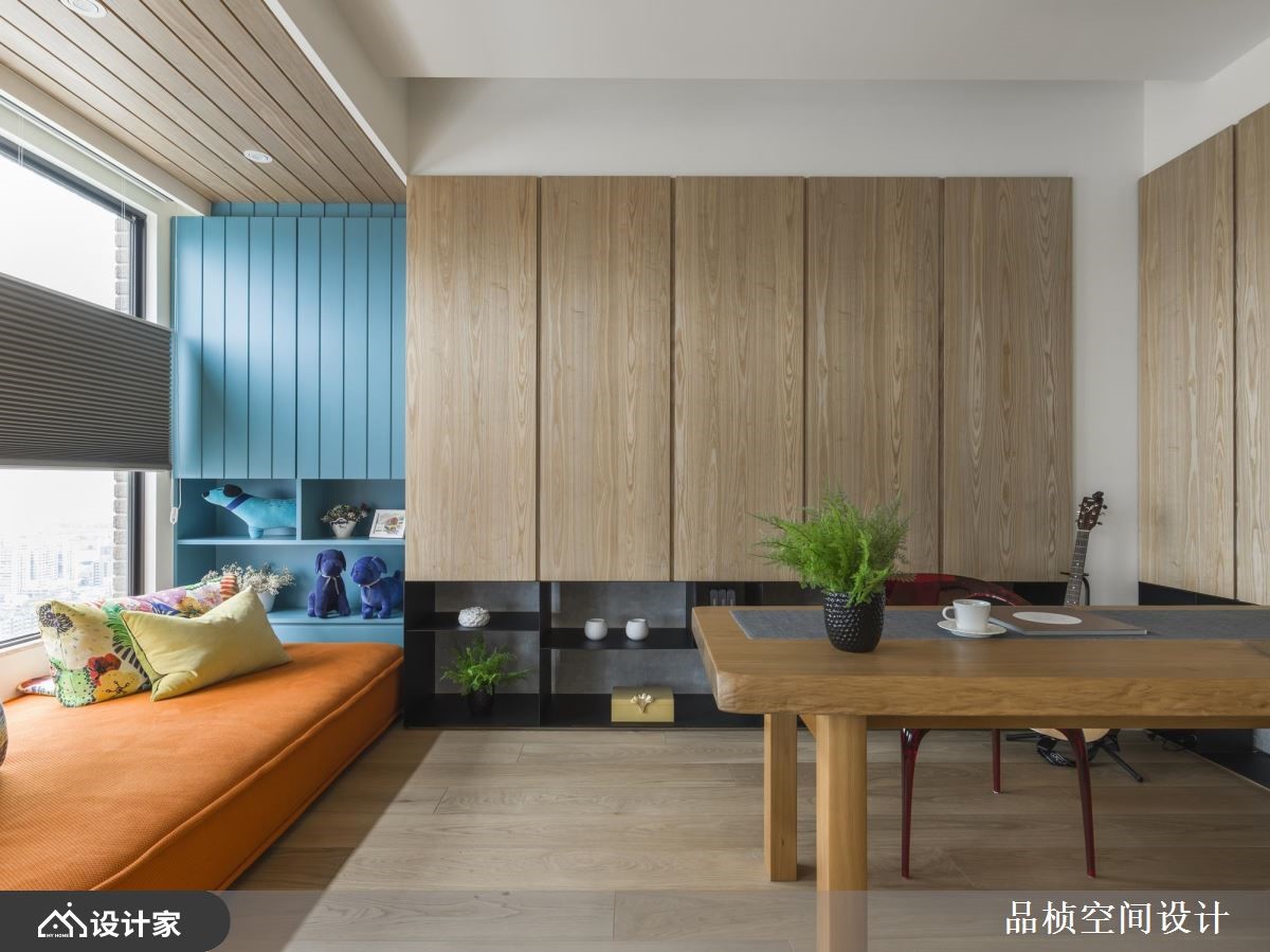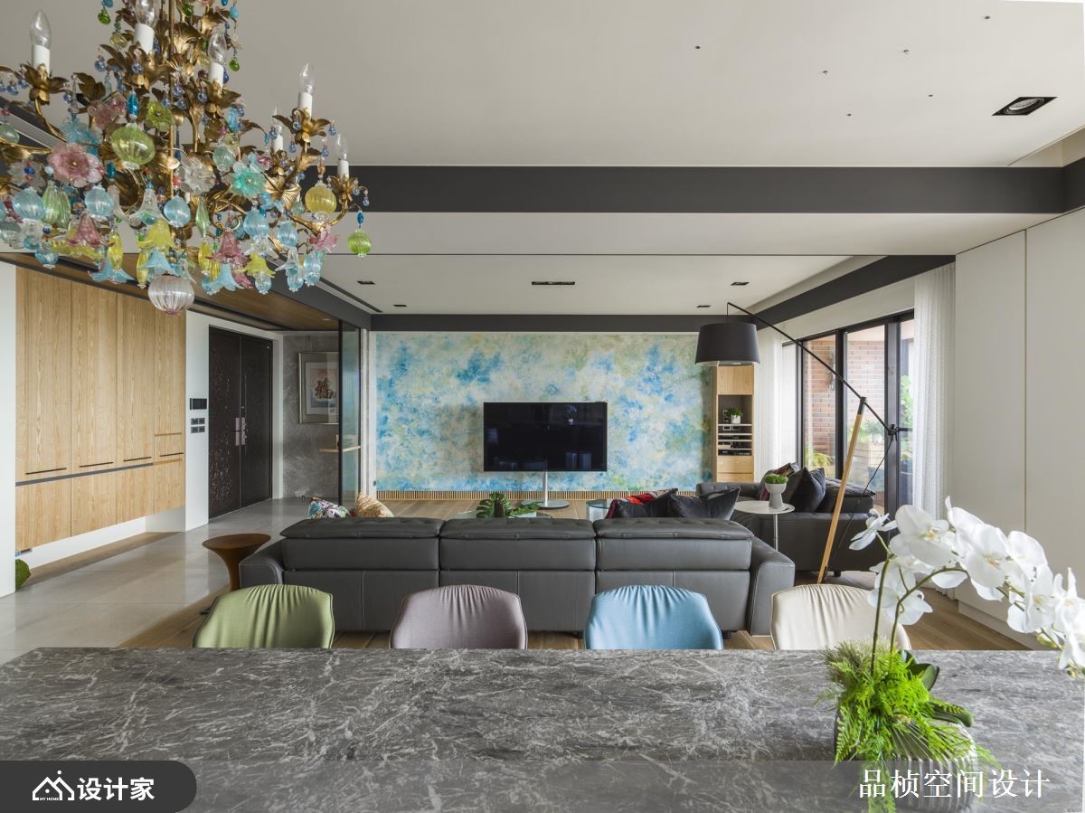 在工作岗位退休,不等于也该从人生中退休!热爱大自然的屋主夫妇,与设计师有过多次合作的经验,因此设计师以自身细微观察,在 264 平米休閒风宅邸多处设计植栽、花卉端景,让屋主能伴随着喜欢的环境,做着喜欢的事,过上惬意但充实的退休日常。 【植栽花卉端景,打造自然感家居】客厅将电视主牆当作大型画布,运用天然质感的硅藻土及手工漆挥洒,打造一幅抽象水彩画,蓝绿相互渲染的色彩铺排,呼应佈满花草的空间意象。餐厅区同样围绕着花草主题,座椅选用上搭配吊灯色系,传达清新优雅气息,天花板灯光设计以男屋主的星座铺排,为两夫妻的用餐时光,营造甜蜜浪漫氛围。私领域,将屋主喜爱的桧木一起带入空间,藉由自然减压的木质香气,加乘夫妻俩的睡眠品质。 小编的最爱 空间中最吸睛的飘窗区,将平日常见于庭院的植株造景带进客厅,为退休生活注入满满活力,打造室内最纾压的端景角落!另外,与半开放设计的书房飘窗串联,延伸惬意氛围。
