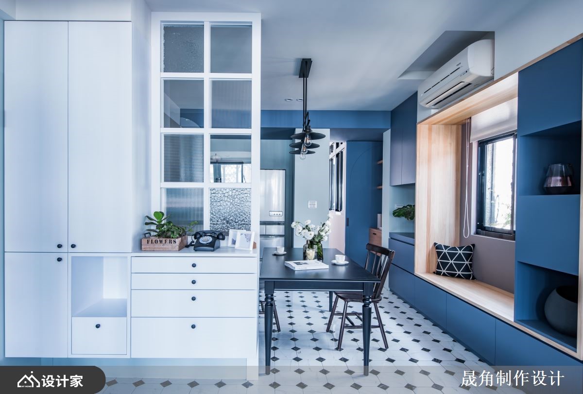 165平米的老房拥有长形屋常见的阴暗问题,因此设计师重新思考空间的隔断,将自然光引入室内,使家居看起来清新辽阔,创造业主夫妻共有的蓝白天空。 【打开天窗,迎接日光与夜空】 业主是一名音乐老师,为了教学方便,所以整体空间依照需求区分为楼上的公领域和楼下的私领域。设计师利用住宅处于边间的位置,在公共空间开设天窗引进阳光,夜幕低垂时还能仰望星空。楼下则保留大面积的窗户,并利用双边推拉门的方式,让主卧能够引入光线、空气对流,营造轻盈的睡眠时光。 厨房铺设抛光石英砖,黑白的简约与一旁蓝色的圆拱隔断,巧妙融合出优雅的英式风情。与私领域不同,楼上的公共空间留下一片纯白,而且规划出小吧台区,方便屋主招待宾客和学生一些茶水与点心,同时还在各个角落用小盆栽妆点空间,彷佛为室内开了呼吸孔,佐上和煦的阳光洒落,使心境如海洋般宽广平静。 小编的最爱 和室由两居室打通而成,承接整体的蓝色主调,加上充足的自然光使得空间窗明几净,不管是夫妻俩假日休憩、阅读,或是给未来的孩子玩耍,都十分适合。