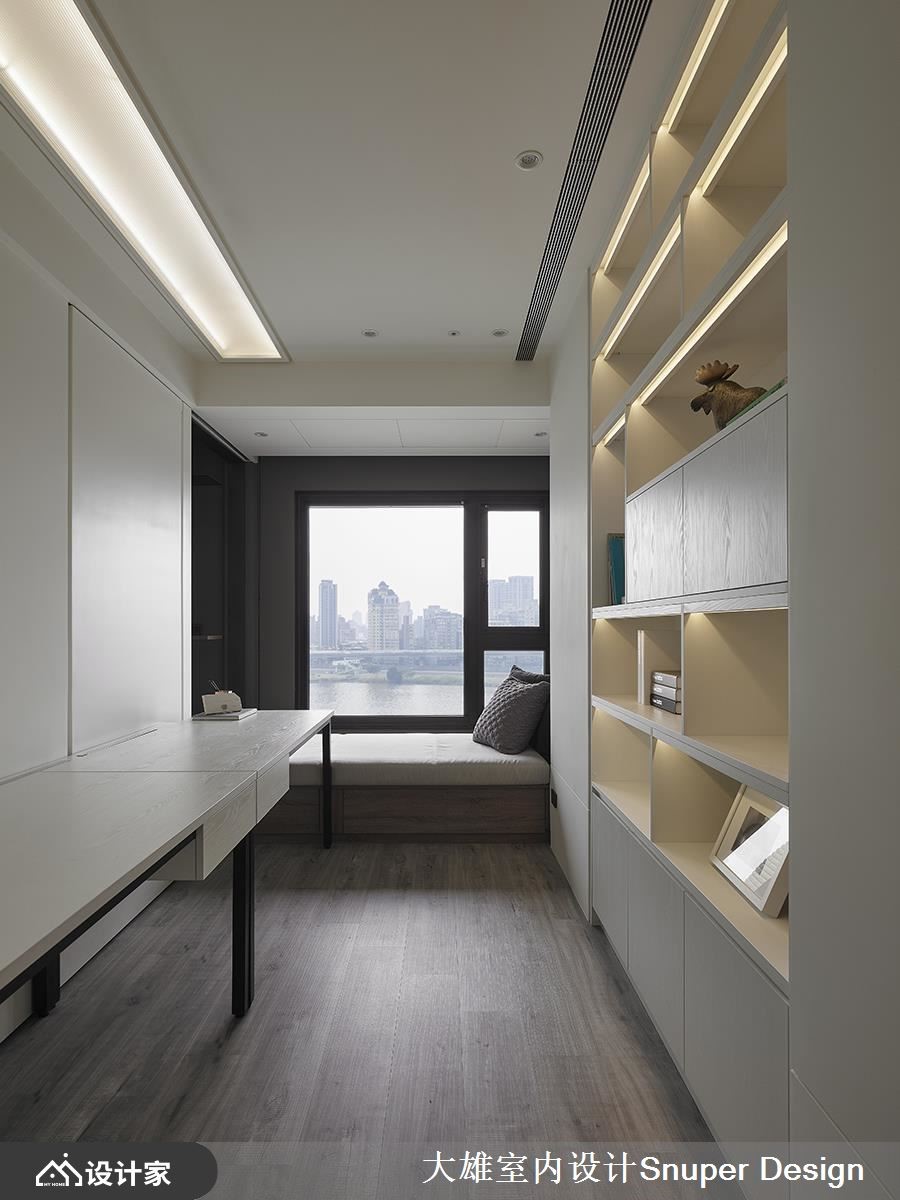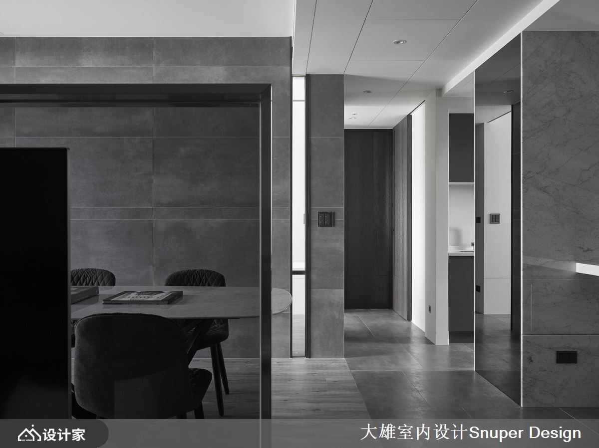 科技日益愈新的现代生活,人们渴望回到反璞归真的生活态度,隐然成为一门设计显学,越减少过度装修与视觉复杂化的空间装修当道。倚靠河岸、欣赏城市最美的景致,室内运用大量的灰色调铺陈,营造出静谧安定的日常氛围,开放的格局规划,并藉由精准的切割比例,干净、简约的材质元素,谱写出自然与现代交织的私宅典范。【城市美景与静谧空间,相互对话】入室后的玄关,以悬空感的木纹打造鞋柜,展现轻盈无压的空间气息,利用白色调的大理石墙面隔出厨房领域,避免开门见灶的疑虑。架高地板铺设出公领域,视线迎向开窗后引入的城市美景,心胸随之开阔、自在;地板利用材质的变化,天花板大梁的纵横穿梭,自然划分领域机能。局部墙面以利落的不锈钢切割,刻划出对称的轴线且创造出和谐、渐层的美学视感;电视墙以半高的高度展现,形塑流动的室内气息,电视周围以不锈钢、灰镜勾勒出深度,反射的视觉特性营造出更开阔空间感;电视墙的背面为餐桌区,用餐的同时还能欣赏户外的风光,好不惬意! 小编的最爱空间里以白、灰色调以及浅色木纹的安排下,营造出安定、干净的空间质感,金属、镜面质感的局部点缀,替领域精准定位,且描绘出细腻的视觉层次。