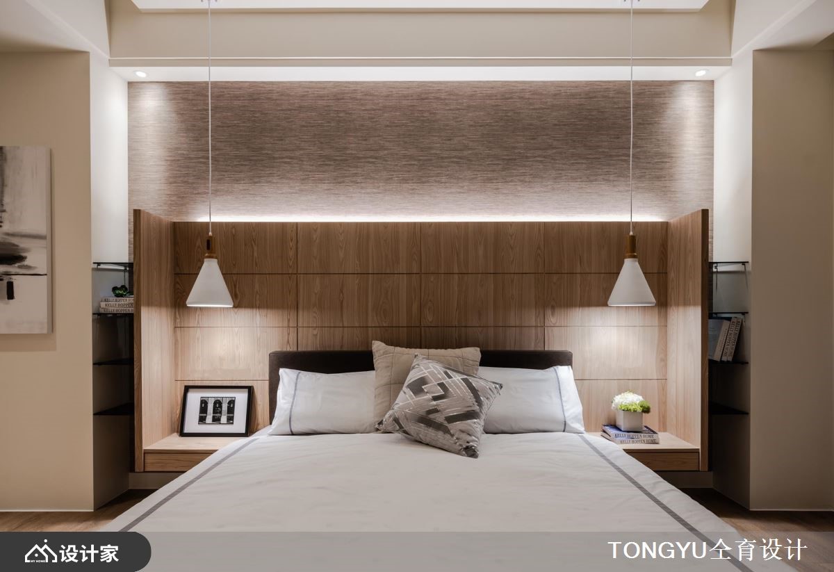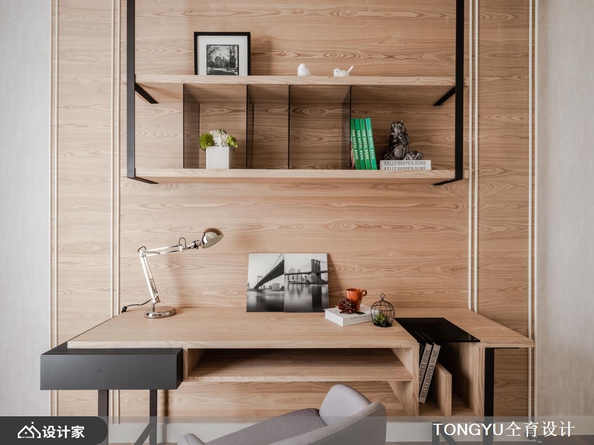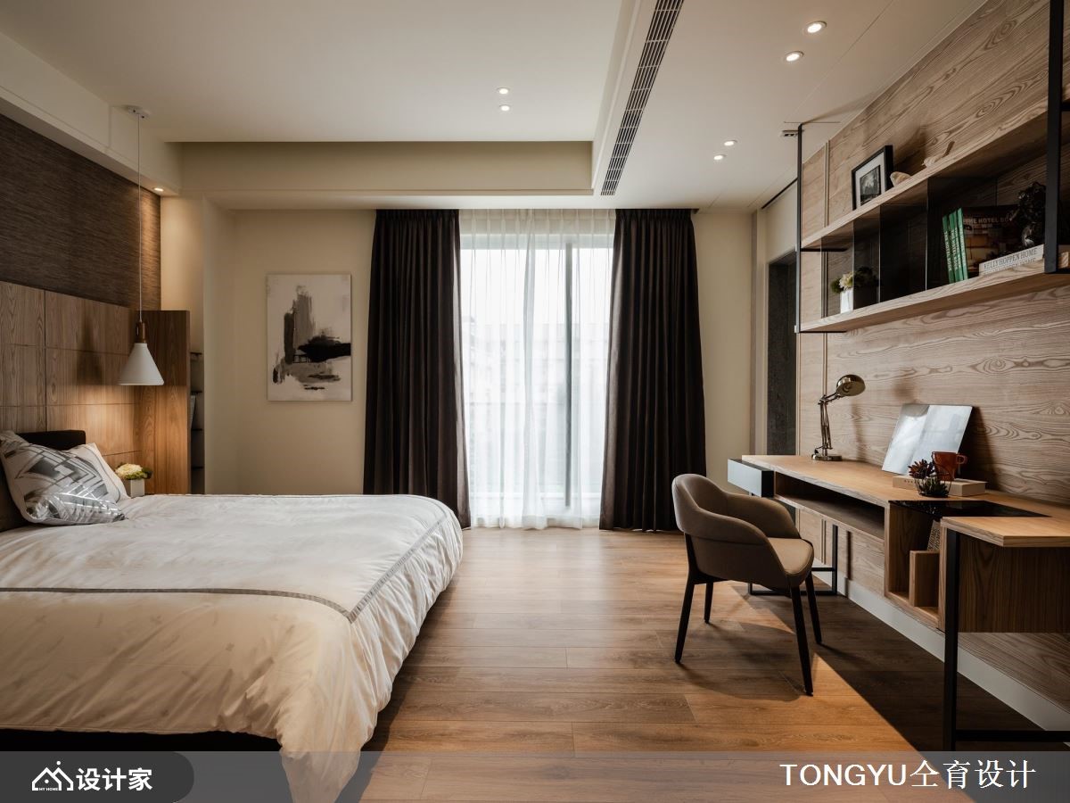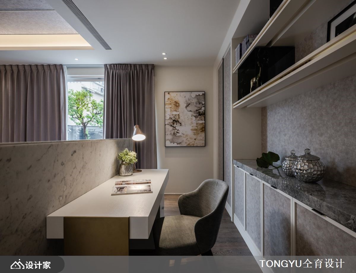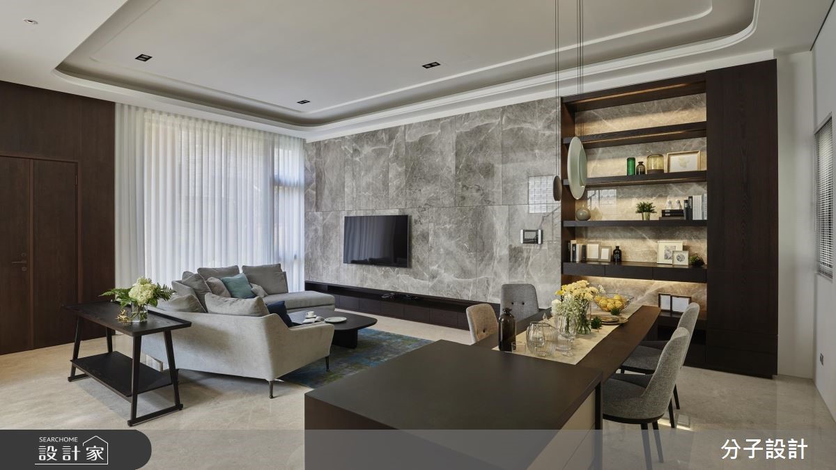 373平米的现代风独栋楼,以低彩色系为室内基调,透过各种建材的细腻搭配,展现自然优雅,却又不会过于雕饰的纯粹底蕴,并安排宾主尽欢的交谊场域,表现出屋主好客的个性。【吧台结合餐桌,创造温暖感环境】一楼规划为客餐厅所在的公领域,空间采取开放式的动线,逐步安排客厅、餐厨空间,而天花藉由建材与层次的变化,创造连贯却有起伏的格局设计。客厅的白色大理石墙和镜面镶饰的展示墙,相互照映,取得动静之间的平衡。木作天花定义了用餐环境的范围,中岛吧台与餐桌的结合拉长了视觉效果。二三楼为卧房的区块,主卧床头墙的高级灰,一路延伸到天花板,形成辽阔的空间尺度,而墨色烤漆玻璃则界定出更衣间与卫浴区域,增添室内的时尚利落感。一道电视矮墙切割出主卧的书房,塑造温馨的阅读场域。次卧利用木纹与裱布为空间纹理,床尾的书桌和铁艺书架则打造一处舒适的端景。小编的最爱四楼是客用的公共空间,木皮与铁艺等多种建材融合出吧台区域,让屋主可以跟好友在此微醺谈天,展现好人缘。