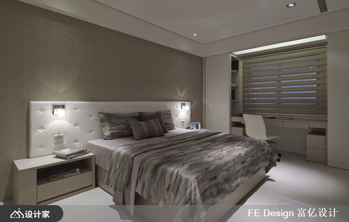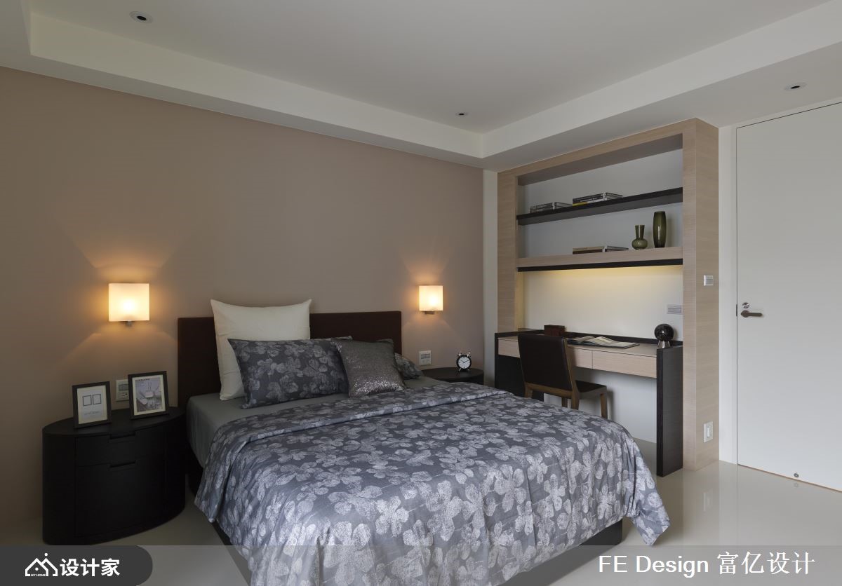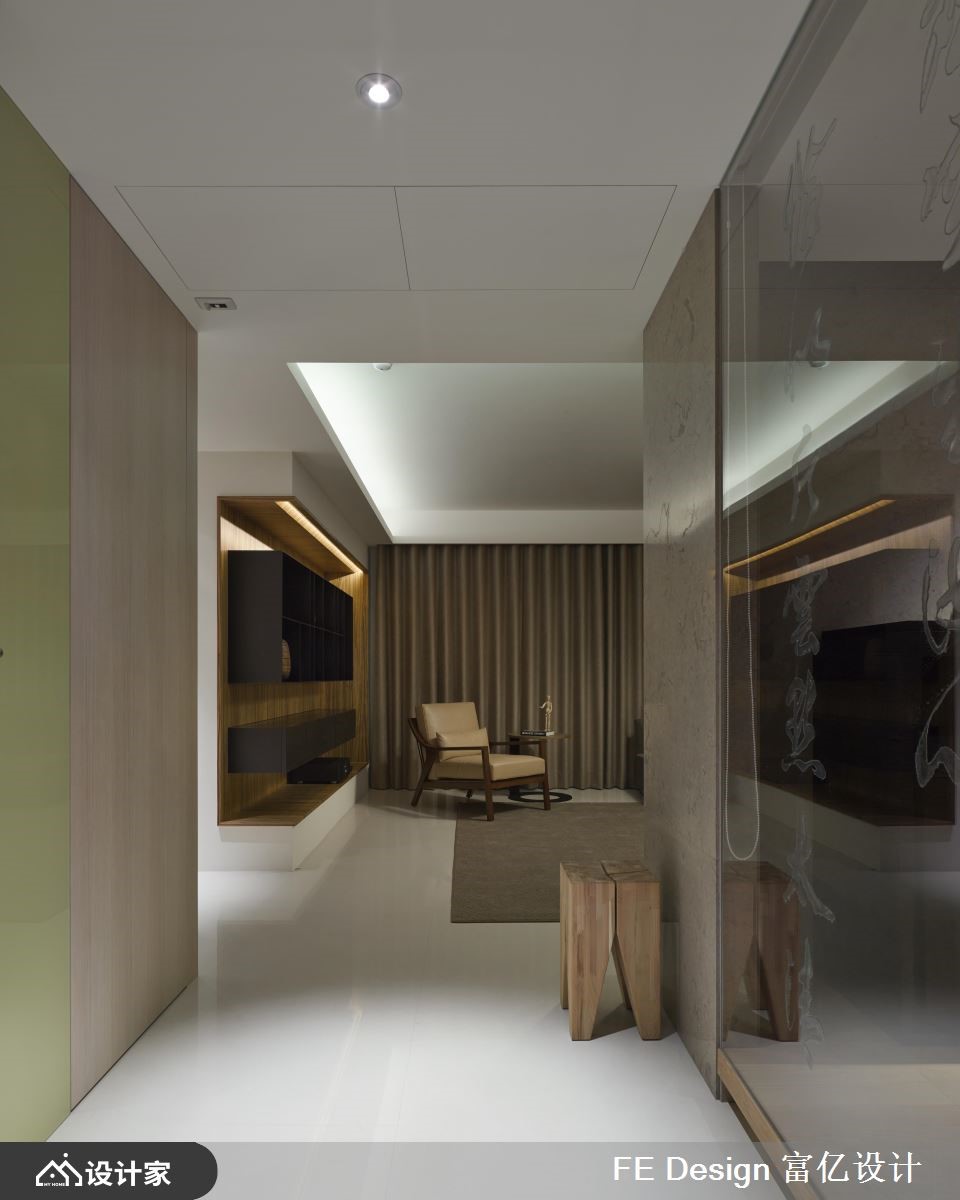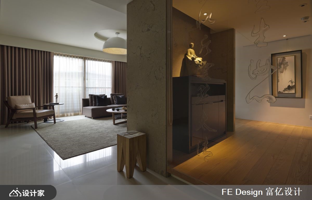 此案原为历经多年的老屋,185平米的空间经设计师重整翻新后,成为具有日系禅风且人文味道的私宅。【温润且具穿透力 营造安心静谧之地】自然光从落地窗走进室内,公领域里以简约的白色为基底,饰以大量的木纹肌理,增添些许温度;原室内中央无采光,藉由隔局重整,并拆除实体墙,大理石的电视墙后方更以玻璃隔断手法、架高地坪,创造一处礼佛区,穿透的材质让光可以透进来,些微的亮度引进,让该区提高视觉明亮度,同时还可保有静谧、安定的特质。【飘荡艺术人文气息 兼具东方圆满意象】客厅后方墙面以木作为基底,铁件勾勒出开放收纳,结和嵌灯照明,烘托陈列其中的雕塑品,一室感染艺术气息;餐厅更以圆形的设计语汇,利用圆桌结合圆形渐层灯饰,呼应东方的圆融团圆之意;通往厨房领域则以雾玻拉门隔断,让光自然流淌其中,形塑明亮、流动的居家品味。小编的最爱延续公领域弥漫着温润日系的特质,卧室里以木纹、大地色系的质感铺陈,搭佐简约造型的壁灯,以及安排衣柜、阅读空间等机能,营造美感与功能兼备的优质家屋。