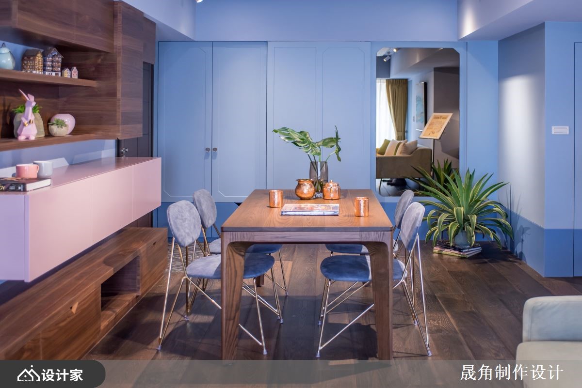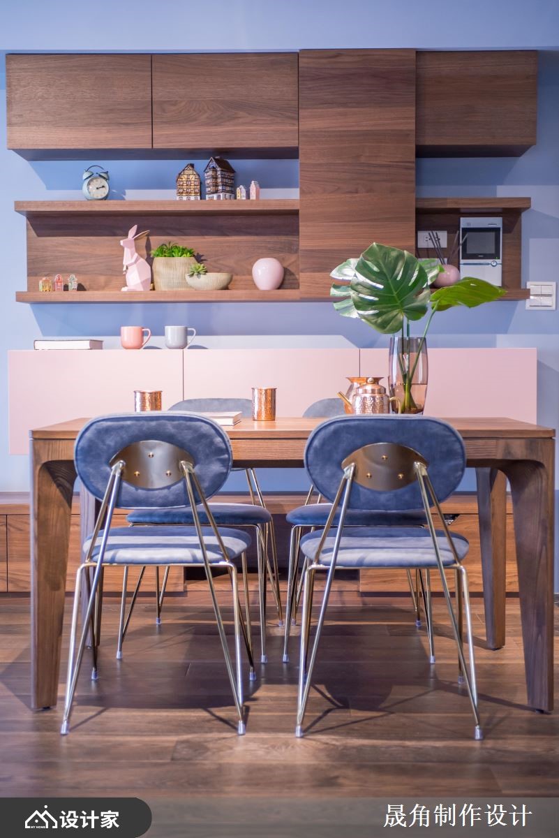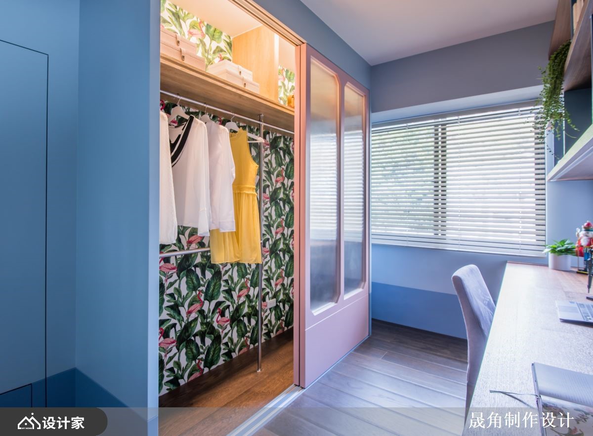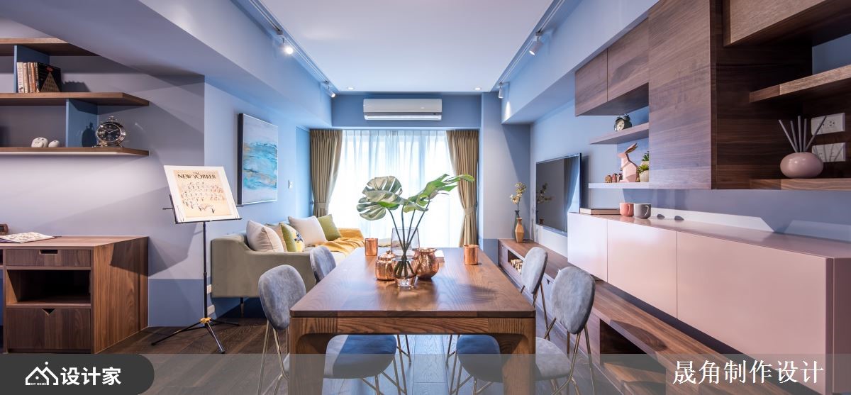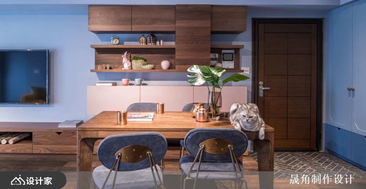 屋主身为乐团指挥家,蕴含浪漫自由的基因,长年旅行于欧洲并巡回表演,渴望这股异国文化涵养,因此希望将原有的二手房翻新,回到家也能沉浸在充满欧风国度的动人气息。【开放隔局与色调安排 营造轻爽宜人气息】从玄关鞋柜到客、餐厅里,壁面与柜体以碧天蓝和灰蓝色两种色系衔接,营造出梦幻且心旷神怡的清爽氛围;公领域里藉由跳色的运用,调和出新颖丰采,像是沙发上以跳色抱枕、针织毯摆设,电视墙旁的收纳柜佐入粉橘色调,以及展示柜上的缤纷对象妆点下,营造出视觉张力与丰富层次;电视柜结合餐柜形塑整体美感,固定柜体宽度并以不同的柜体深度与样式灵活运用,混搭收纳与展示机能,创造出相互连结的设计巧思。【丰富的美学视觉 渲染家居空间】拆除隔断墙,将书房纳入公领域里,墙面书柜以木作层板结合蓝色隔间板,随着物件的摆设,丰盈日常美学氛围;而后方的衣柜以玻璃材质伴随粉色木作门框,挹注粉嫩的甜美想象,敞开门片的空间内更以丛林红鹤壁纸铺陈,营造出热情奔放的自然意象。小编的最爱延续公领域的双色运用,主卧空间里揉合碧天蓝及粉橘色调,激荡出梦幻的甜美意象,交织温馨与柔美的休憩氛围。