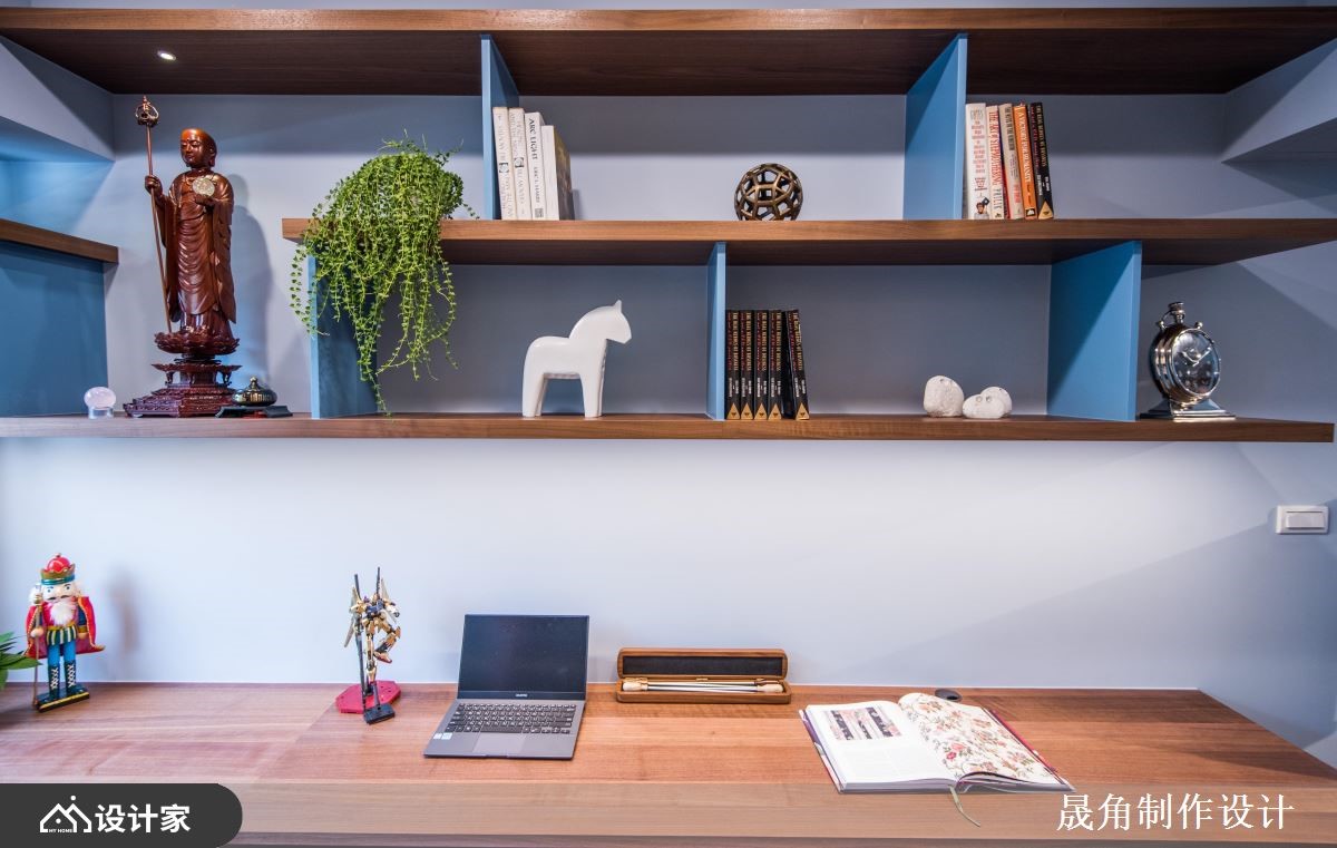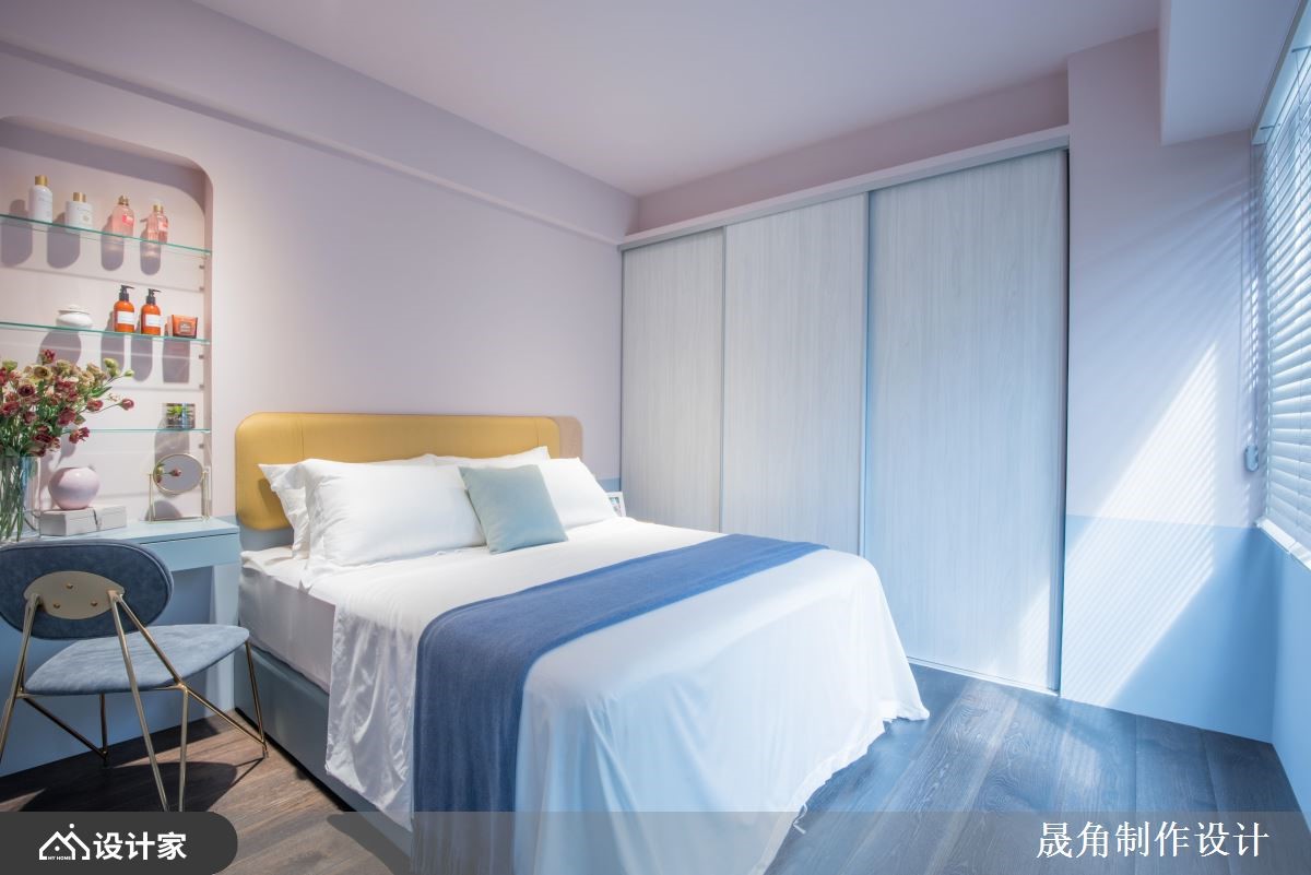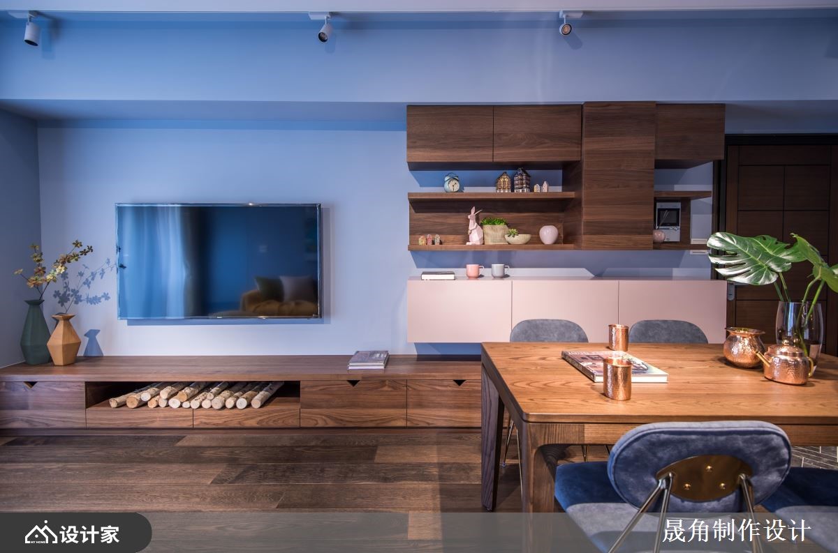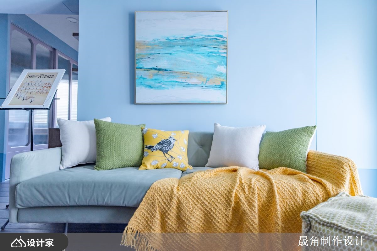 屋主身为乐团指挥家,蕴含浪漫自由的基因,长年旅行于欧洲并巡回表演,渴望这股异国文化涵养,因此希望将原有的二手房翻新,回到家也能沉浸在充满欧风国度的动人气息。【开放隔局与色调安排 营造轻爽宜人气息】从玄关鞋柜到客、餐厅里,壁面与柜体以碧天蓝和灰蓝色两种色系衔接,营造出梦幻且心旷神怡的清爽氛围;公领域里藉由跳色的运用,调和出新颖丰采,像是沙发上以跳色抱枕、针织毯摆设,电视墙旁的收纳柜佐入粉橘色调,以及展示柜上的缤纷对象妆点下,营造出视觉张力与丰富层次;电视柜结合餐柜形塑整体美感,固定柜体宽度并以不同的柜体深度与样式灵活运用,混搭收纳与展示机能,创造出相互连结的设计巧思。【丰富的美学视觉 渲染家居空间】拆除隔断墙,将书房纳入公领域里,墙面书柜以木作层板结合蓝色隔间板,随着物件的摆设,丰盈日常美学氛围;而后方的衣柜以玻璃材质伴随粉色木作门框,挹注粉嫩的甜美想象,敞开门片的空间内更以丛林红鹤壁纸铺陈,营造出热情奔放的自然意象。小编的最爱延续公领域的双色运用,主卧空间里揉合碧天蓝及粉橘色调,激荡出梦幻的甜美意象,交织温馨与柔美的休憩氛围。