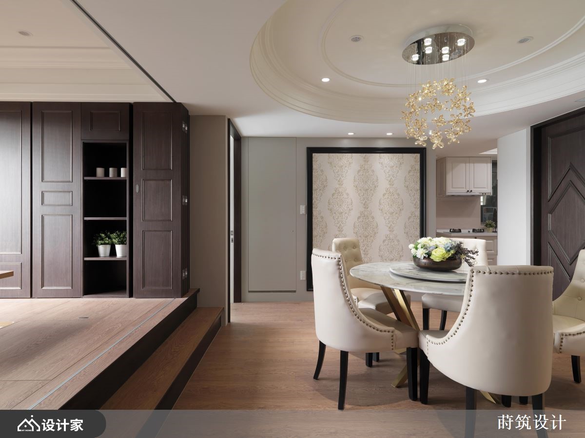 设计师于居家中加入细致却不铺张的新古典语汇,并辅以壁材、软件装点,赋予特别的风格质韵,同时着重光线及视线的互动汇流,创造奢华但温馨的舒适感受,快跟着小编一起来看看吧! 室内以层次线板堆栈细致层次,并在入口处安排深色厚实的木柜,划分玄关与迎宾空间;餐厅则打造向上挑高的天花,悬挂华美的水晶吊灯、佐以进口壁纸端景墙,替餐厅氛围增色不少;一旁规划一间和室,除了可以做为客房外,也加入大量的收纳空间,加以折门划分界定,维持与公共场域的分属关系,保有使用上的隐私性;书房内,铺陈清浅的淡雅灰色,呈现优雅柔和的场域风情,搭配金色的饰品画龙点睛,延续客餐厅所铺述的新古典调性;主卧室内,规划专属更衣室,并保留床头的通畅走道,引导步入卫浴与更衣间等路径,让空间使用更加流畅! 小编的最爱 空间衬佐风格独特的家饰单品,并铺陈带有优美花纹的壁纸与地毯,透过装饰语汇的带入,围塑典雅且不失大器的新古典氛围,让居宅视野更饶富变化!