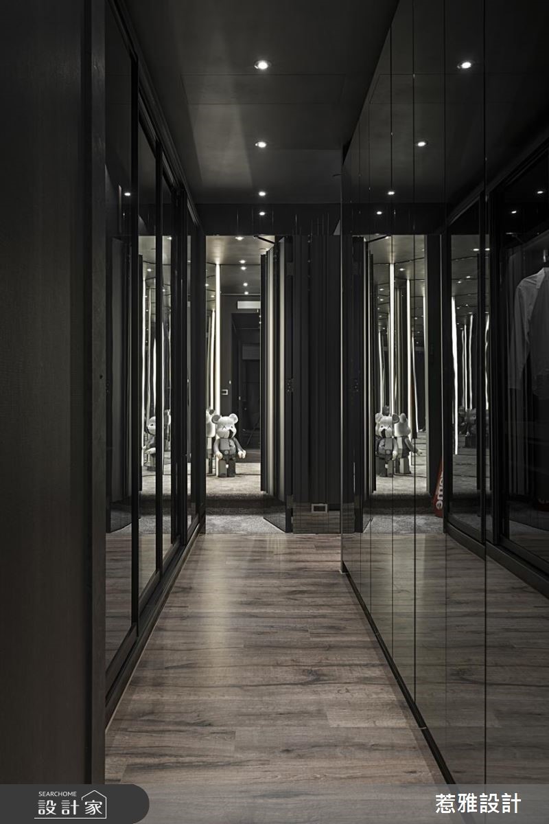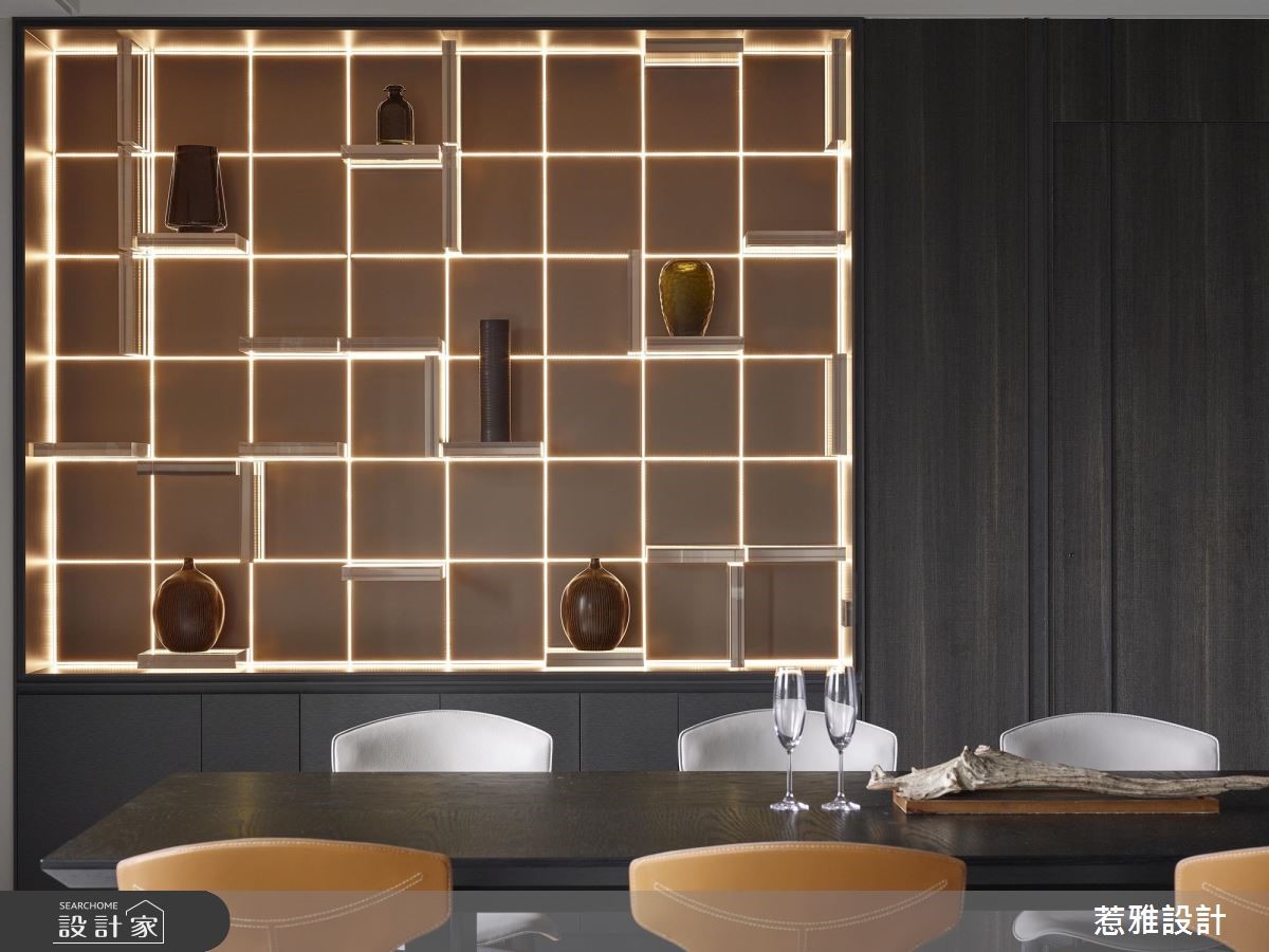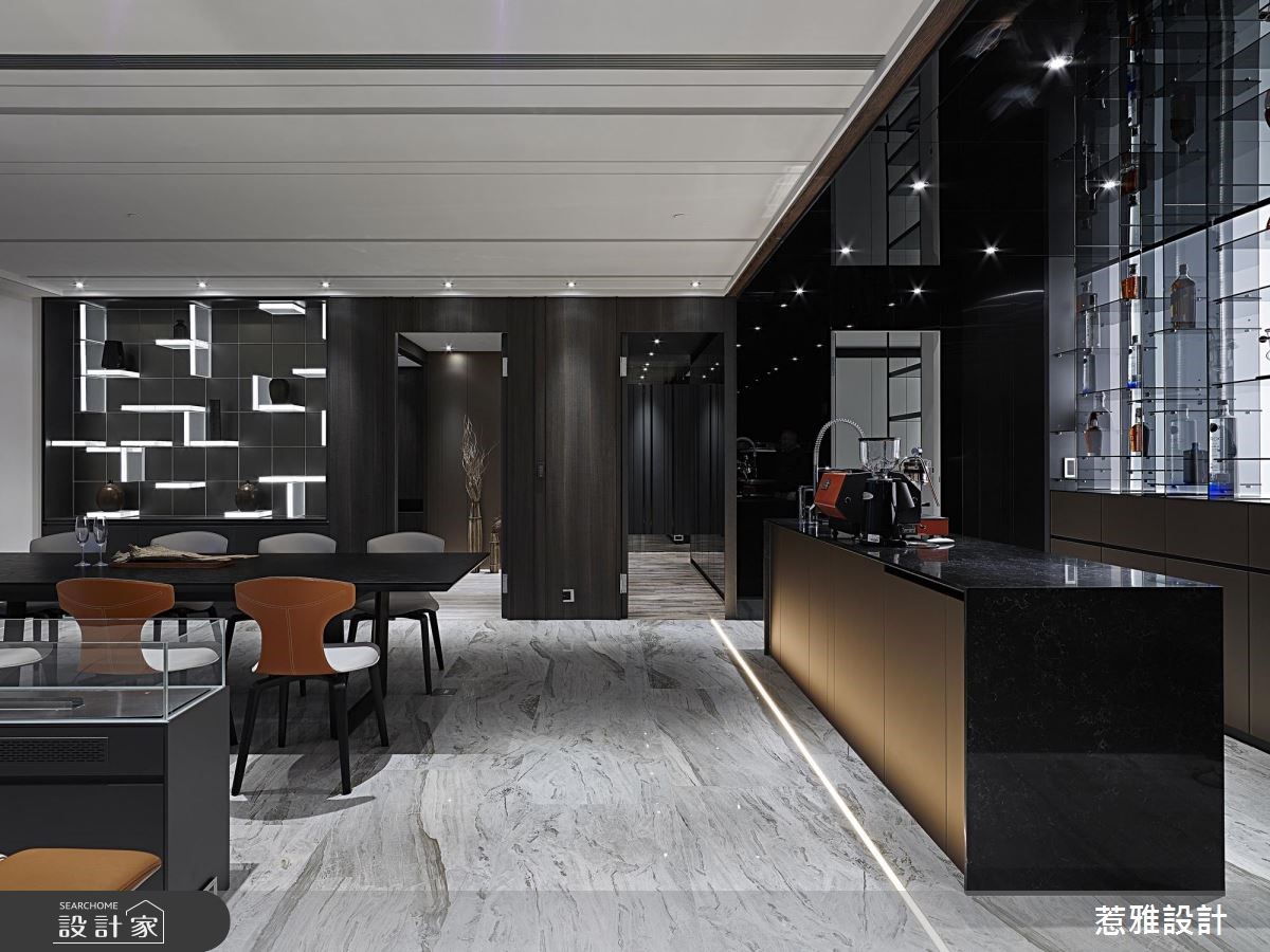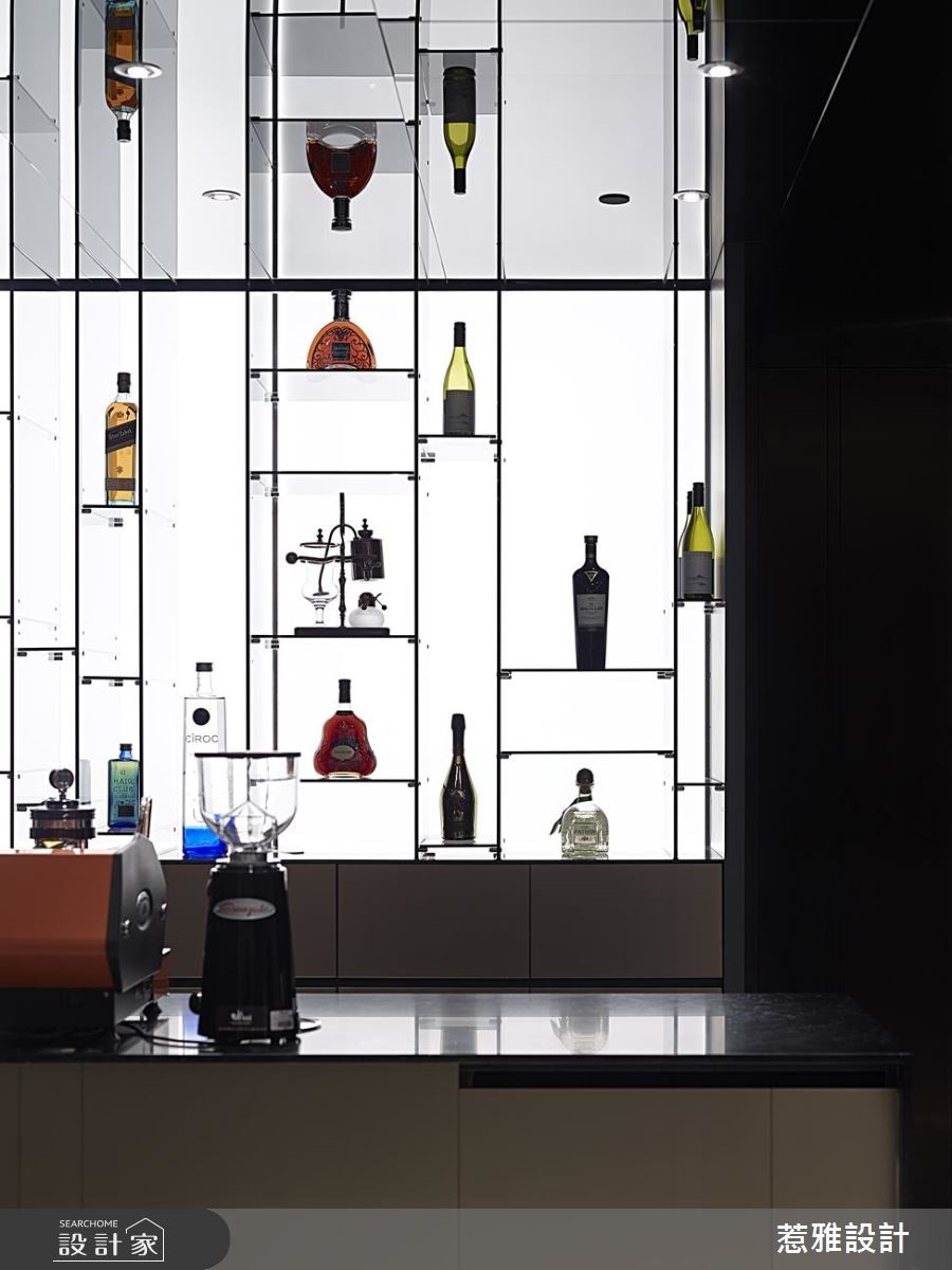 297平米的酒店风大宅,设计师采用开放式格局,让各种生活机能可以紧密连结,而且在低调奢华的风格底下,也特别增添令人玩味的元素,使得整体空间活泼又惊喜连连。【光与金属,打造酒藏的时尚舞台】从玄关延伸到吧台区域,钛金板构成的墙面,在崁灯的照射下,散发不凡的光泽;同时利用模块化的概念,将LED灯与厚片透明亚克力组合,并透过角度的变化,形成高高低低的收纳格状空间,让屋主的酒藏有个时尚的展示舞台。除了酒柜以外,餐厅旁的展示空间,也能透过灯光的变化,产生如俄罗斯方块或是棋盘的几何线条转换,全看家人当下的心境为何。再来,往空间深处走去,镜面与透明玻璃衣柜交织成更衣间,在视觉上放大了空间,而且柜内还能收纳一些业主喜爱的库柏力克熊,让较为沉稳的居家调性,多了可爱的元素。房间以几何线条搭配众多建材,包括钛金属、木皮、石材、冷烤漆、皮革等,呈现多元又统一的个性,尤其是梳妆台的镜子还以一个发光的线框,让美丽在白天与黑夜拥有不同的样貌。小编的最爱吧台区的金属板材与墙面的展示酒柜,在LED灯光的映照下,显示出业主的高雅格调,格状空间又保有变化性,收纳与品质兼具。