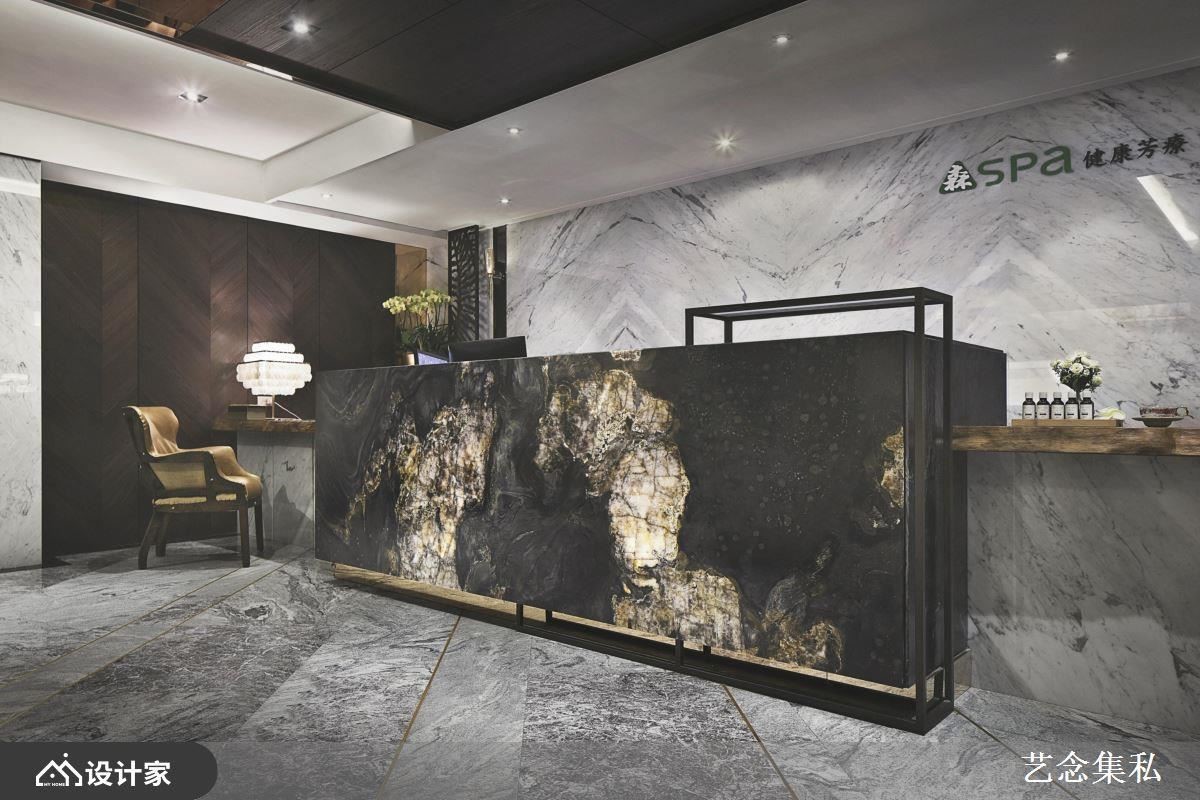 商业空间也需要艺术轻巧舒缓地置入,并且需与品牌调性相辅相成,进一步诠释高级消费场所的空间气氛。以此案高端 SPA 会所为例,为了呼应品牌舒适放松的消费性质,设计师在入口大厅两旁以奇岩、枯石作为迎宾之用,看似颓靡的朽木老石在光影之下,少却粗犷气息,取而代之的是平稳静谧、原始且沉郁的朴实意象。