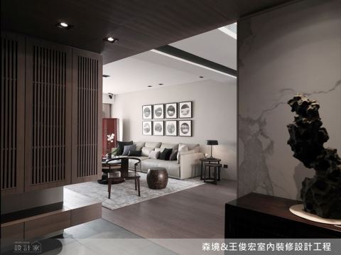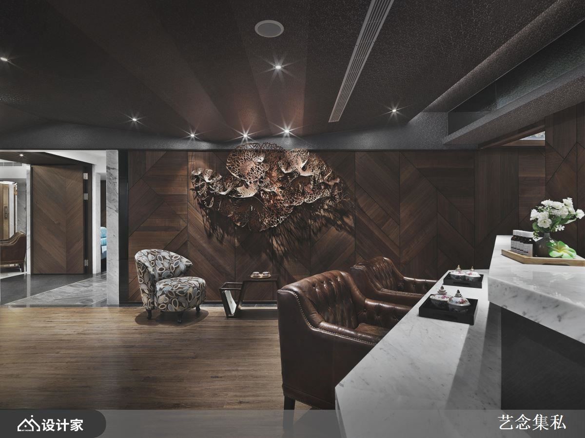 另外,有如泼墨山水画作的大理石柜台也散发浓厚东方意境,奔放不羁的金黄云纹微隐尊贵质感,暗靡冷调十分搭配整体色系,让空间有着沉稳内敛、都会时尚的品牌意境。步入其内,便可注意到细致精工的雕刻品悬于墙面,同为深棕木色,让看似冷峻的现代空间,搭配艺术品后便让环境瞬间有了视觉焦点,同时也酝酿沉淀出恢弘气势的场域空间。