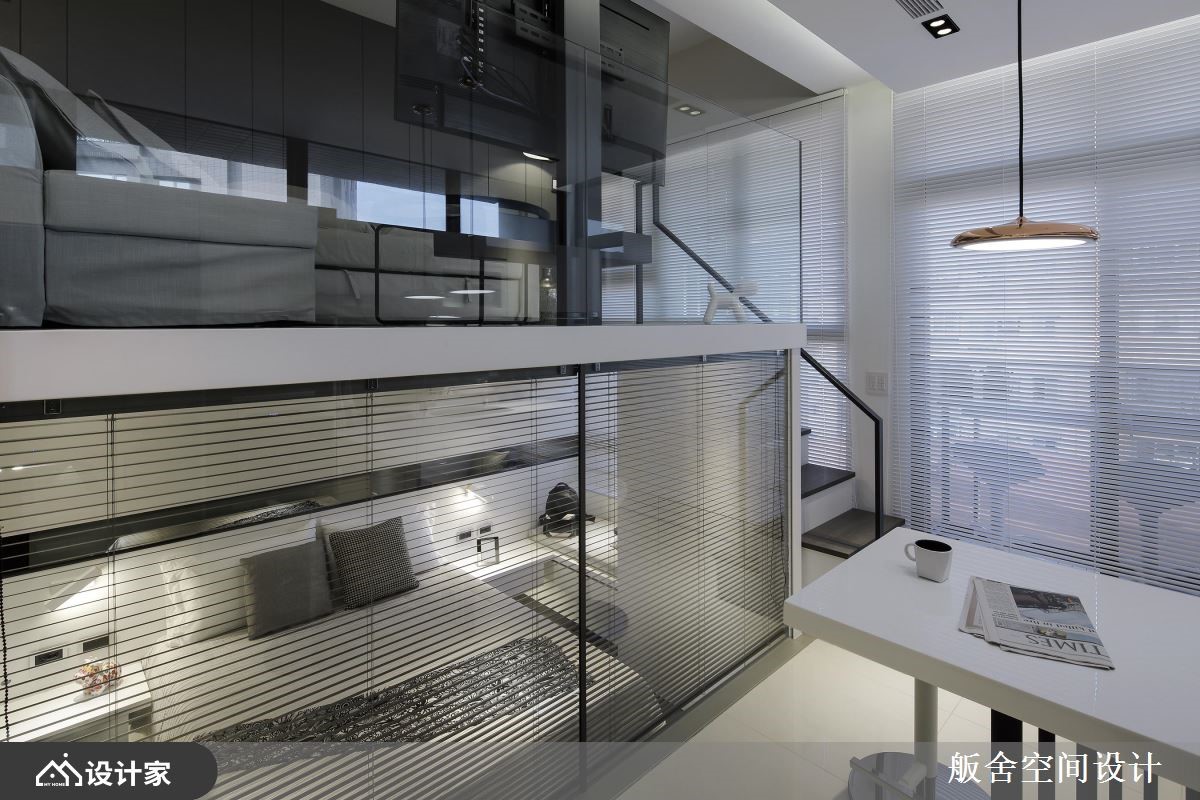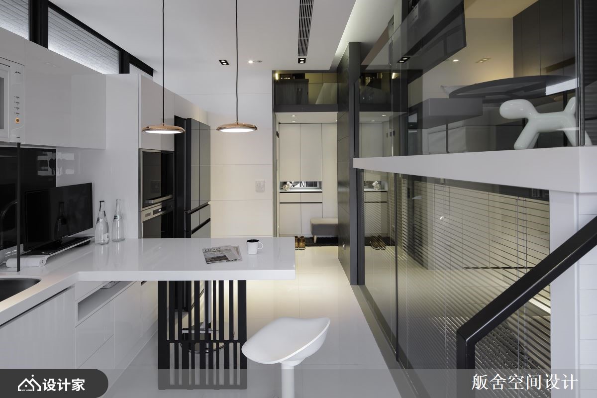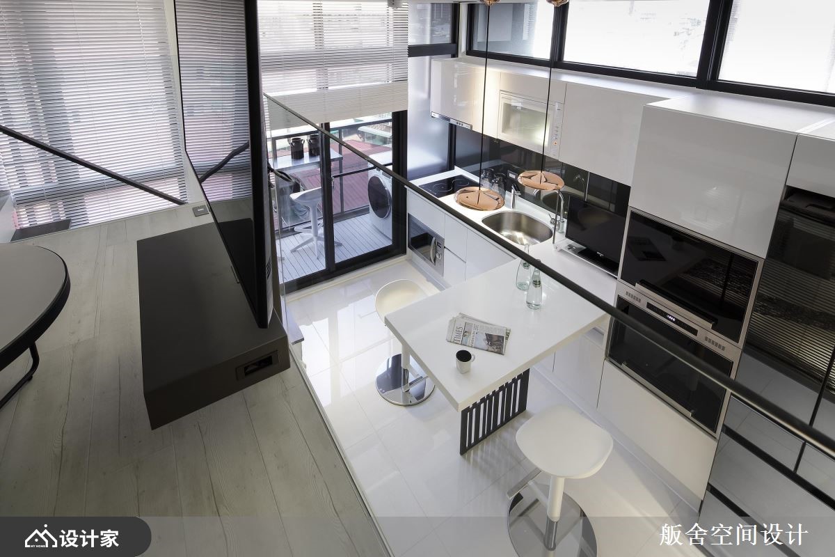 66 坪跃层宅屋主两人特别喜爱舨舍空间设计的跃层作品,且嚮往纯白时尚气氛及单纯线性空间的俐落,故这次颜善松设计师将光源调整较以往更为白亮,展现乾淨不囉嗦的极简现代风。 空间不大的 66 坪室内,区分为餐厨、客厅、卧房及卫浴四个场域。首先进入室内来到餐厨位置,厨房设备从大门的冰箱、流理檯一路安排至阳台区,整齐中蕴含使用次序的考量,从电器收纳至煮炒区的备餐檯过渡地带,向外延伸成为精緻小巧餐桌区,两人使用大小恰好,高脚椅的搭配能随时转换为微醺吧檯或清新早午餐咖啡馆;通往小阳台的两层楼高落地窗,顺势抬高空间高度,展现室内挑高优点;走上楼梯来到客厅休憩空间,由于大量镜面及玻璃材质的应用,摆上L型沙发及小茶几也不显侷促。 小编的最爱 较有隐私性的梯下区块规划私领域卧房,百叶窗帘加强隐私性外,左右对称的床头柜,不失公平机能的规划,还发挥靠窗地带加入飘窗小空间,完善发挥坪效。