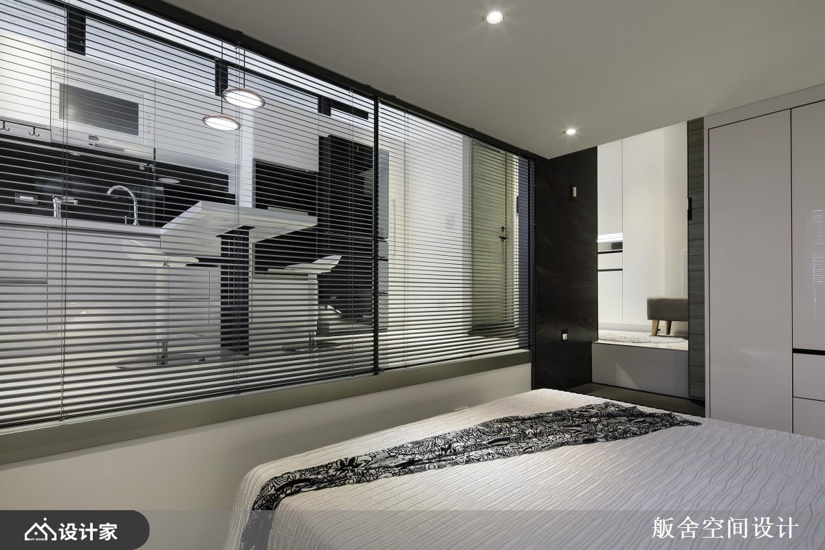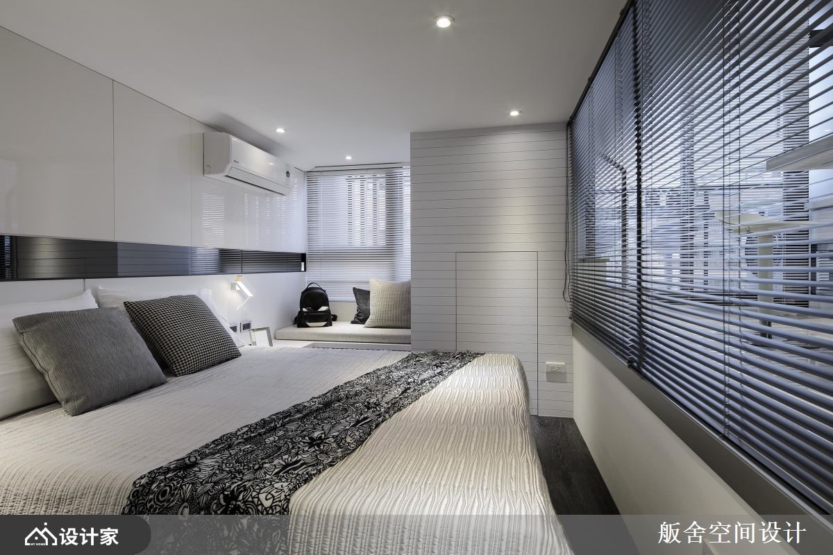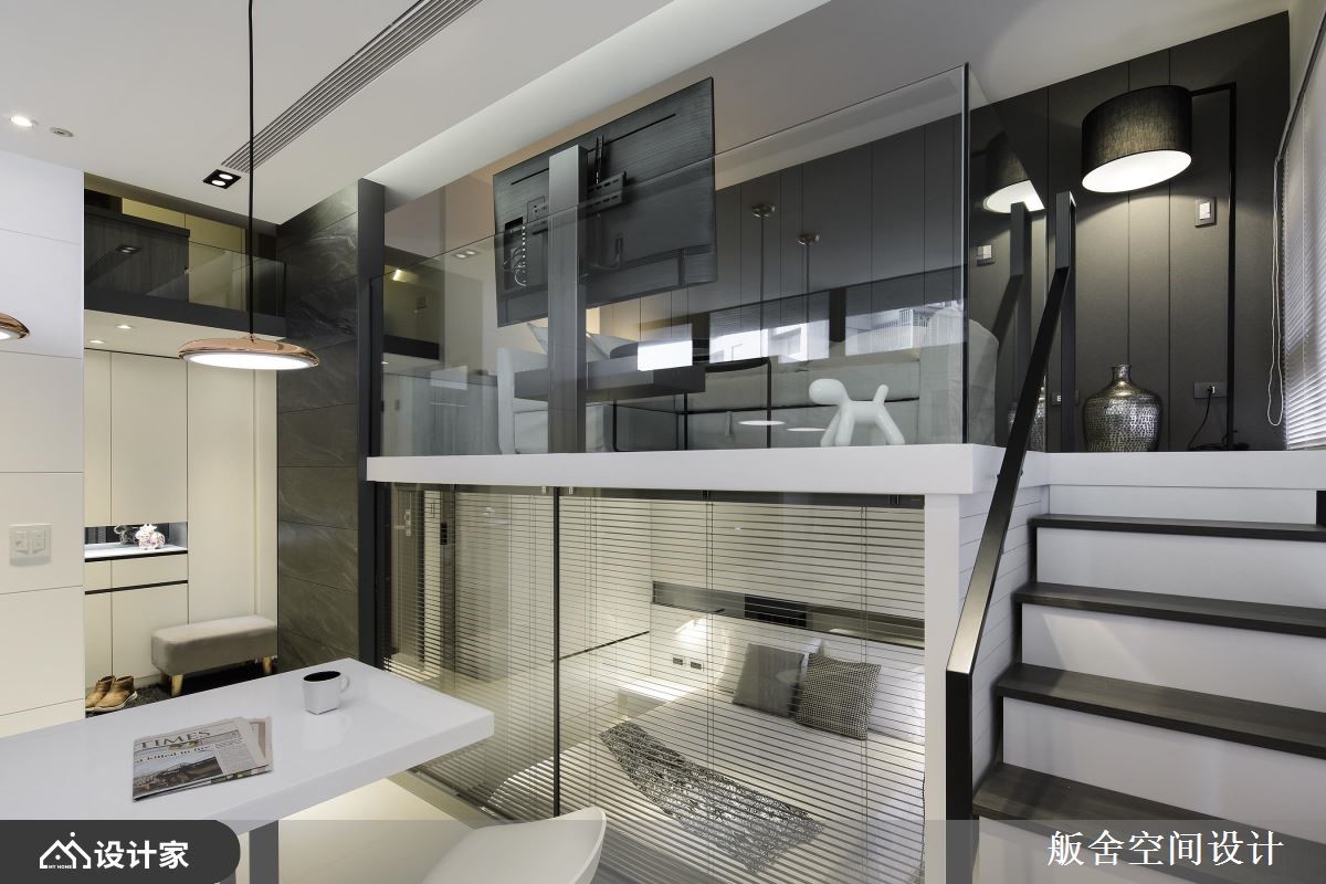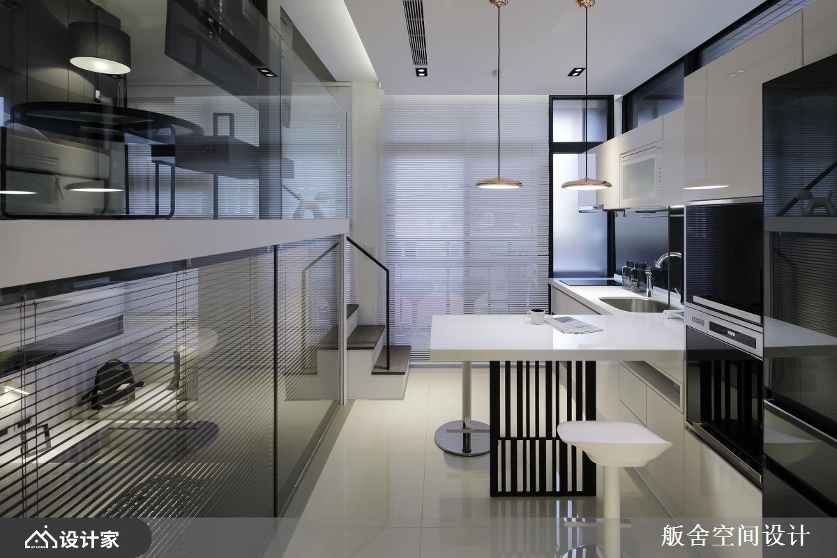 66 坪跃层宅屋主两人特别喜爱舨舍空间设计的跃层作品,且嚮往纯白时尚气氛及单纯线性空间的俐落,故这次颜善松设计师将光源调整较以往更为白亮,展现乾淨不囉嗦的极简现代风。 空间不大的 66 坪室内,区分为餐厨、客厅、卧房及卫浴四个场域。首先进入室内来到餐厨位置,厨房设备从大门的冰箱、流理檯一路安排至阳台区,整齐中蕴含使用次序的考量,从电器收纳至煮炒区的备餐檯过渡地带,向外延伸成为精緻小巧餐桌区,两人使用大小恰好,高脚椅的搭配能随时转换为微醺吧檯或清新早午餐咖啡馆;通往小阳台的两层楼高落地窗,顺势抬高空间高度,展现室内挑高优点;走上楼梯来到客厅休憩空间,由于大量镜面及玻璃材质的应用,摆上L型沙发及小茶几也不显侷促。 小编的最爱 较有隐私性的梯下区块规划私领域卧房,百叶窗帘加强隐私性外,左右对称的床头柜,不失公平机能的规划,还发挥靠窗地带加入飘窗小空间,完善发挥坪效。