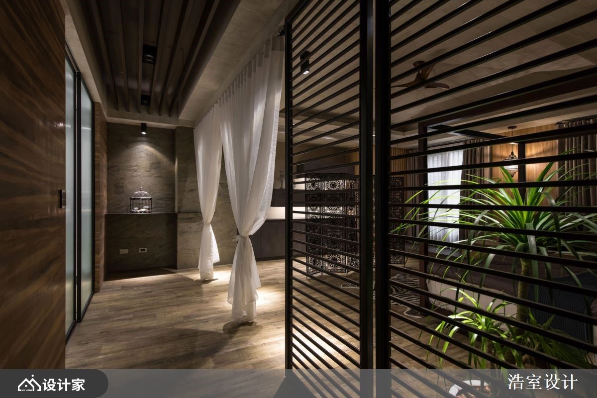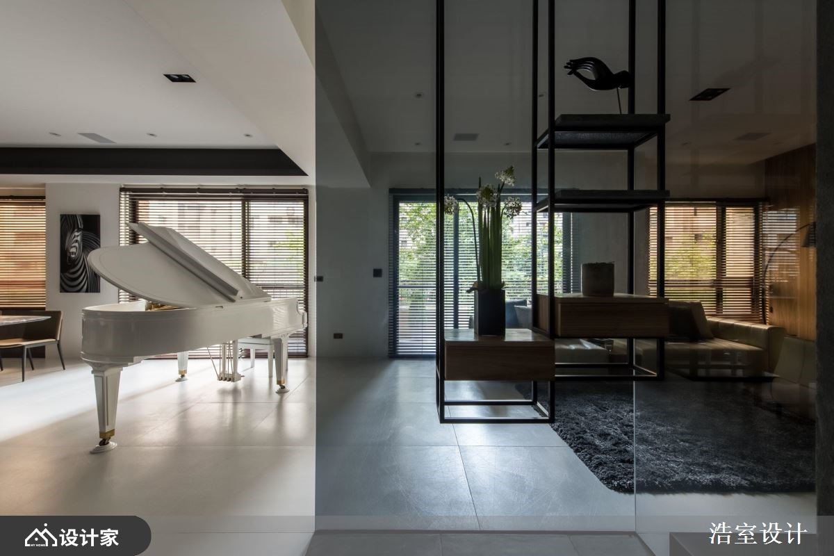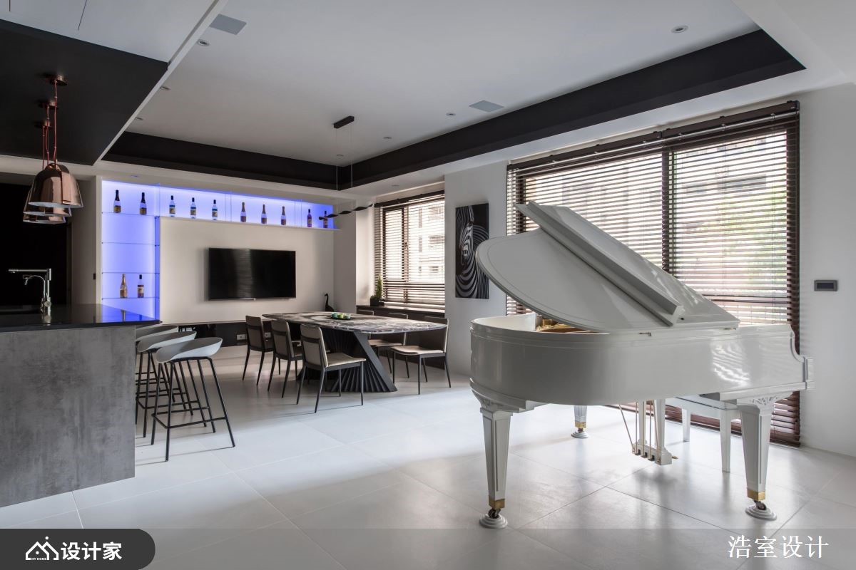 297 坪现代风豪邸,在宽敞而採光充沛的开放公领域,摆置摩登的镜面烤漆纯白三角钢琴作为主角,透过设计师精准的美学实力让各式建材用料融会贯通,并揉合自然光的层次变换,创造时髦与休閒并俱的生活享受。 通透而开放的玄关,先行划分公、私领域入口,一左一右贴心考量,让两空间使用者能尽情放鬆、互不干扰。左转进入以男屋主演奏兴趣为核心的狭长公领域,可看见摆置于空间中心的白色钢琴,除了成为串联长型格局的中枢地带外,客、餐厅选材及设计也以个性黑铁、灰质石材、雪白立面,呼应时尚高雅的视觉飨宴;而大面落地窗景引入的好採光、好风景,配合客厅背牆的天然木皮,加乘冷色调居家的放鬆力。穿越钢琴后迎接开放餐厨区,厨房与用餐区之间加入中岛吧檯设计,高脚椅的选配及电视牆的展示酒柜收纳造型,营造私人时尚 Lounge 风格,日夜用餐享有截然不同气氛,搭配悠扬琴声,成为一家人凝聚情感、交流谈天的享受天堂。 小编的最爱 玄关右转后,来到 Villa 度假般主卧空间,通透的隔断、落地植栽、轻透纱帘的搭配,创造充满峇里岛度假气息的高质量舒眠氛围,从公领域到私密空间,提供无微不至的顶级享受。