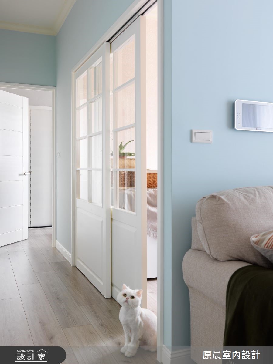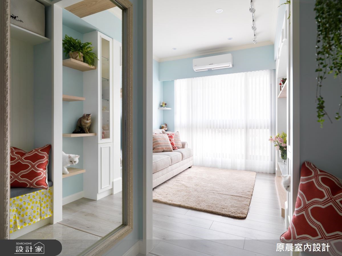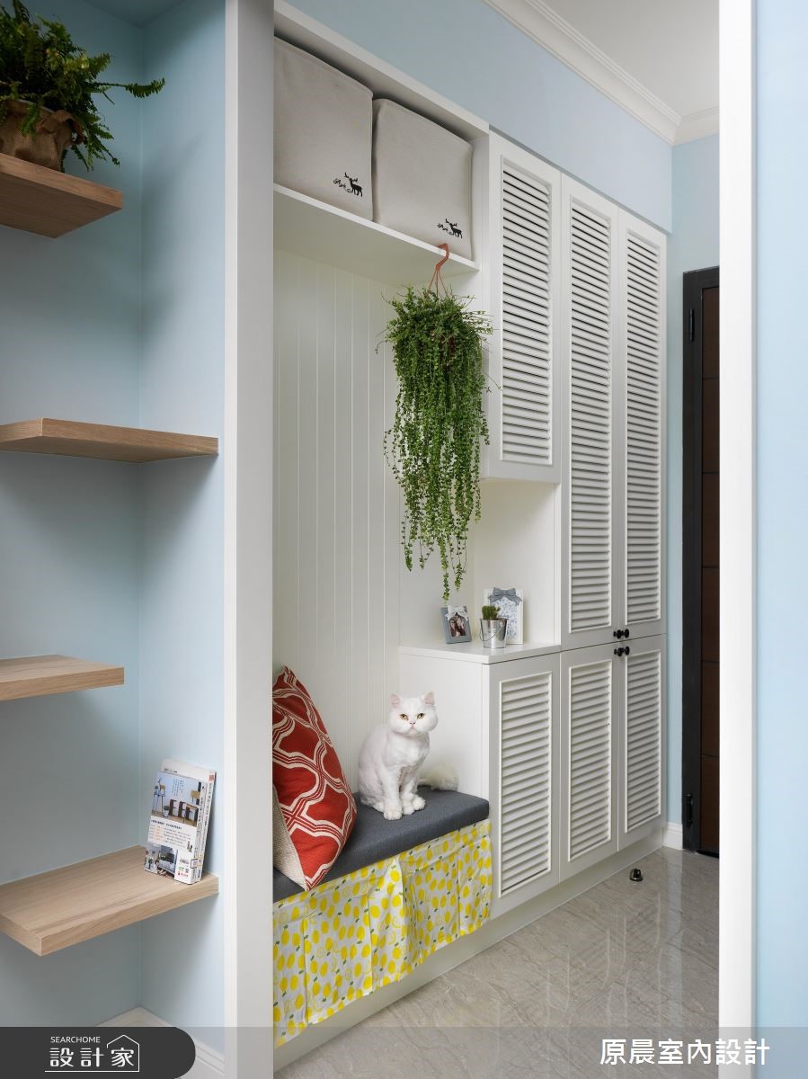 设计师替单身女性打造出美轮美奂的居住场域,除了高收纳空间与美型田园风以外,也针对猫咪们的习性、配置不少宠物专用的机能设计,快跟着小编一起来看看吧! 住宅引用轻柔的蓝天色调做为主轴,结合拱型门、壁炉造型等田园风的优美线条,呈现出符合屋主个性的柔和之美,并透过大面窗让采光广纳入室,缔造明亮好氛围;机能分布上,则将猫的活动方式也考虑进去,如墙面层板既是主人的展示空间,也是猫咪的跳台与休憩区,将人宠需求融洽地结合于设计之中;房间隔墙则改变实墙风貌,改规划大片格子窗的推拉门,不仅促成房内空间感延伸,也让自然光可洒入廊道,达成明亮感与放大效果;房内,则挥洒风格素雅的法式灰色调,陈列精巧细致的家具,重现了欧风的春日居家美感! 小编的最爱 玄关区,设计师善用坪效,将诸多机能加以整合,运用百叶造型统筹了上收纳柜、鞋柜等,再搭配穿鞋椅的实用配置,令入口空间富有层次!