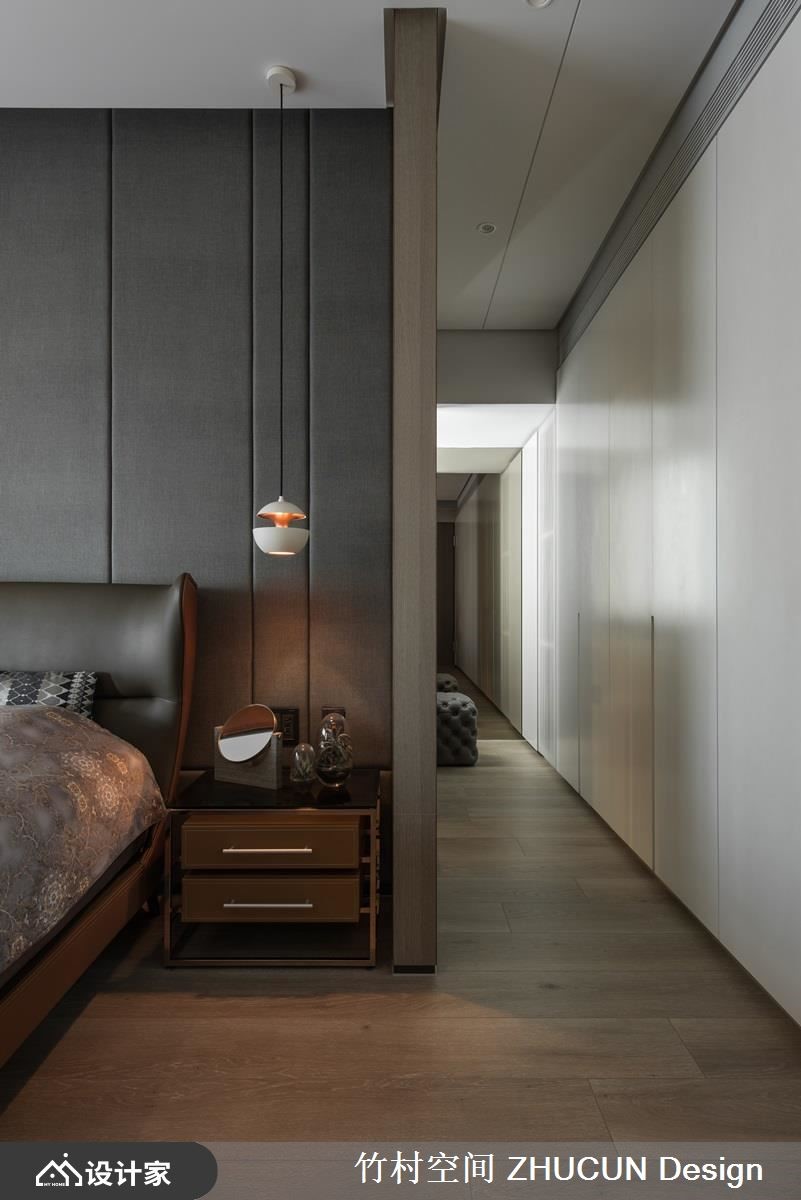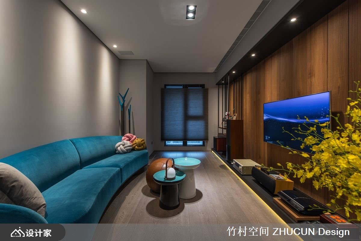 155平米的简约风宅邸,弱化各个格局的隔断,以黑白灰色系为空间主调,并透过彩度高的软件及家具点亮视觉,让两夫妻的生活悠闲自得,不必拘束于某个空间中。【轻盈隔断,创造回字形动线】客厅电视墙采用白色金属冲孔网,形成轻盈的客餐厅隔断,并创造空间的回字形动线。客厅舍弃传统的大沙发,改成两张主人椅与数颗球椅,使得生活更有弹性。餐厅主墙选择纽约纽约石材,和储物间的金属格栅门对比,激荡出不同建材间的奇妙火花。位于简约厨房旁,吧台区自天花板、墙面到地板都采取深色木纹,打造独立的休闲环境。一推开主卧的隐形门,就见到通道底端的穿衣镜,而一整面白色收纳柜,则赋予两人丰富的机能性。家庭影院以温润木质修饰电视墙面,搭配水蓝色沙发及家具,增添家居的活泼感受。小编的最爱由于窗外有良好的视野,因此阳台设置了长型座椅,让人可以在此阅读、欣赏美景。