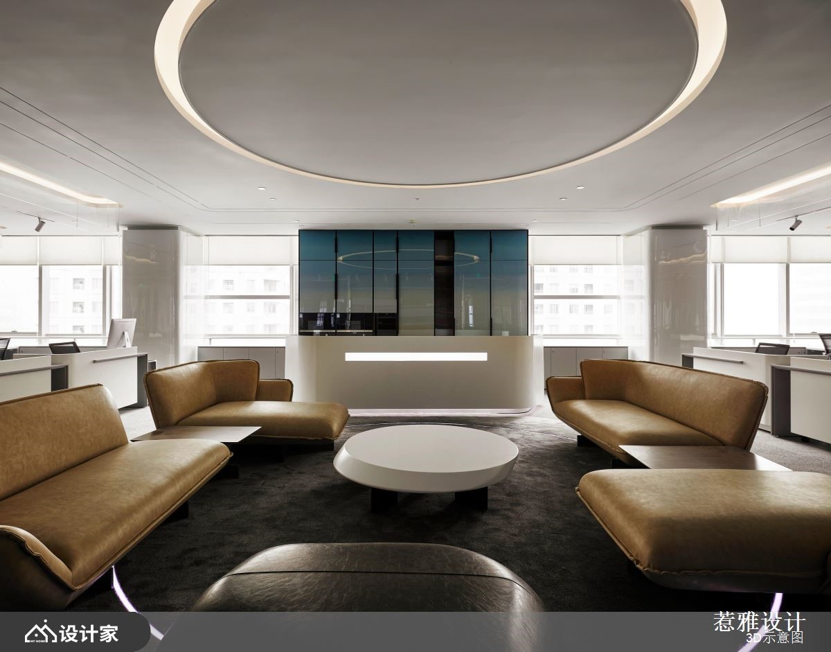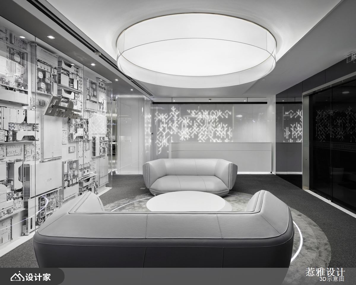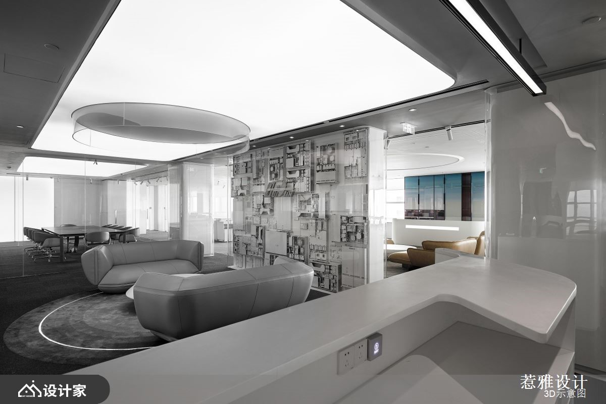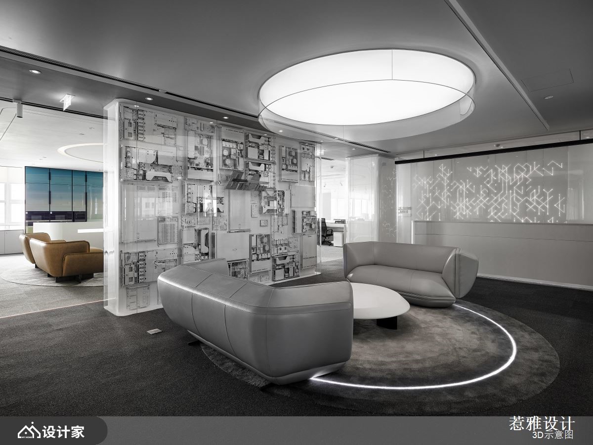 设计师针对挑高区域做出重点处理,运用软膜天花的设计巧思,营造磅礡大器的视觉感受,同时加入纯净白作为底调,让空间整体有如无杂质的素雅画布,快跟着小编一起来看看吧!设计师考虑到天花高度以及设备管线,在兼顾结构完整的同时,也打造独特的空间造型,刻意简化繁复元素的铺陈,维持素净与纯粹感,并加入圆形导角或弧形流线,修饰视觉可见的主要量体,搭配线型光芒的蔓延,串联空间的每一个角落;而入口处的主玄关,则是聚焦亮点所在,设置了一道兼具颓废与前卫感的立面,透过机箱体的堆栈,用以揭示 IT行业公司的发展进程,让电路板自由裸露,如同装置艺术般地展示在访客眼前;茶水间则呈开放格局,配置置中的弧型吧台,饰以彩色渐层电器柜、并搭配精品沙发家具,让休憩领域有如大器客厅般充满气韵!小编的最爱 空间内的白色柱体,于外层覆盖清透玻璃,兼具素净质地且保有通透性,成为颇具巧思的鲜明焦点!