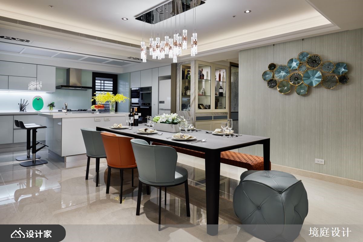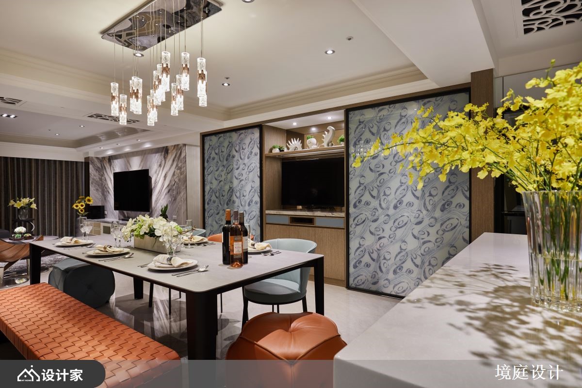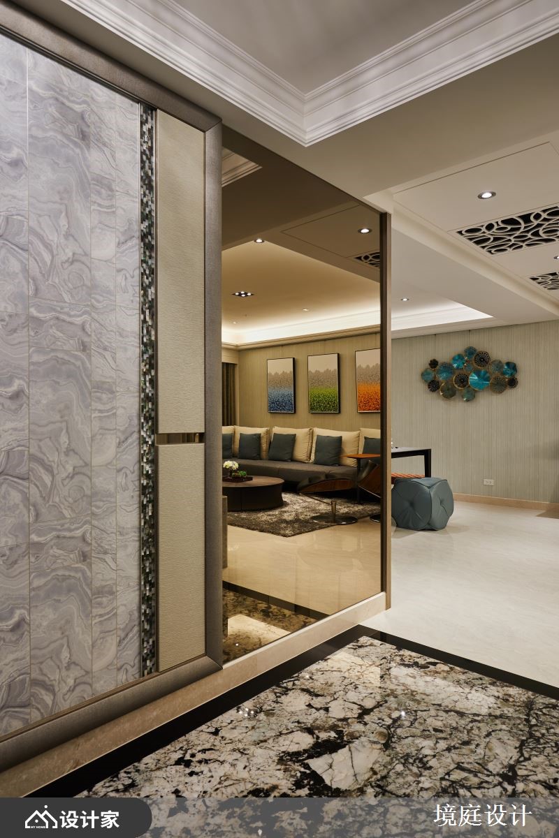 二十几年的老房,原先拥有格局差、采光不佳等问题,而设计师掌握视觉比例的要点,以大理石、贝壳板、镜面、皮革等多維建材,搭配跳色的家具软件,使一家三口能享有精品饭店的空间气度。【多维装饰,创造丰富的大宅视觉】玄关地面透过绿光森林大理石,揭开居家的高尚序幕,紧接着映入眼帘的是,两侧运用贝壳板修饰的菱形镜面,形成了放大公领域的优雅端景。而公领域采取开放式的规划,且在天花装饰雕刻板,隐藏空调主机的同时,又可以提升室内的典雅氛围。客厅电视墙运用石材纹理,表现空间的沉稳魅力,给人安心的生活感受。餐厅使用不同造型的蒂芙尼蓝与爱马仕橘餐椅,让用餐区域多了一些活泼的生命力,而一旁柜体的艺术夹纱玻璃推拉门,则营造和谐的视觉平衡。主卧藉由床头绷布及镜面的结合,加上衣柜的皮革花纹,打造宛如精品酒店的沉着气质。另外,分别隐藏于床头跟入口处,设计师细心规划储藏间和三面镜的更衣间,令人沉浸高级的穿搭体验。小编的最爱女儿房倚傍自然光,设置书桌与飘窗,让女儿拥有一处能够静心的场域,而化妆台则能够收整于推拉门后方,使睡眠质量不会受到镜面影响。