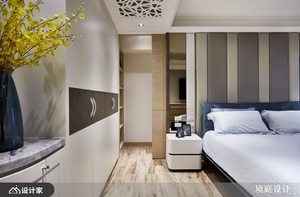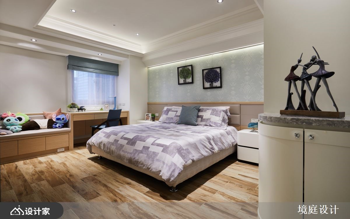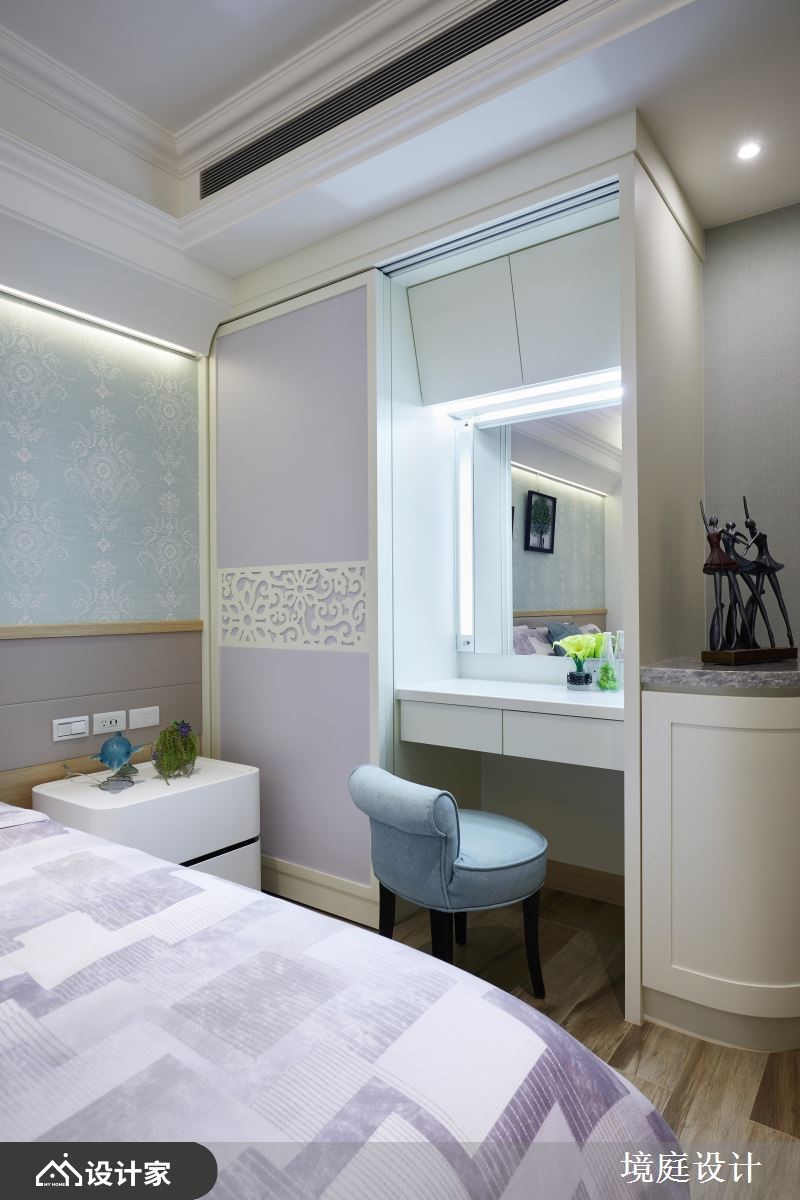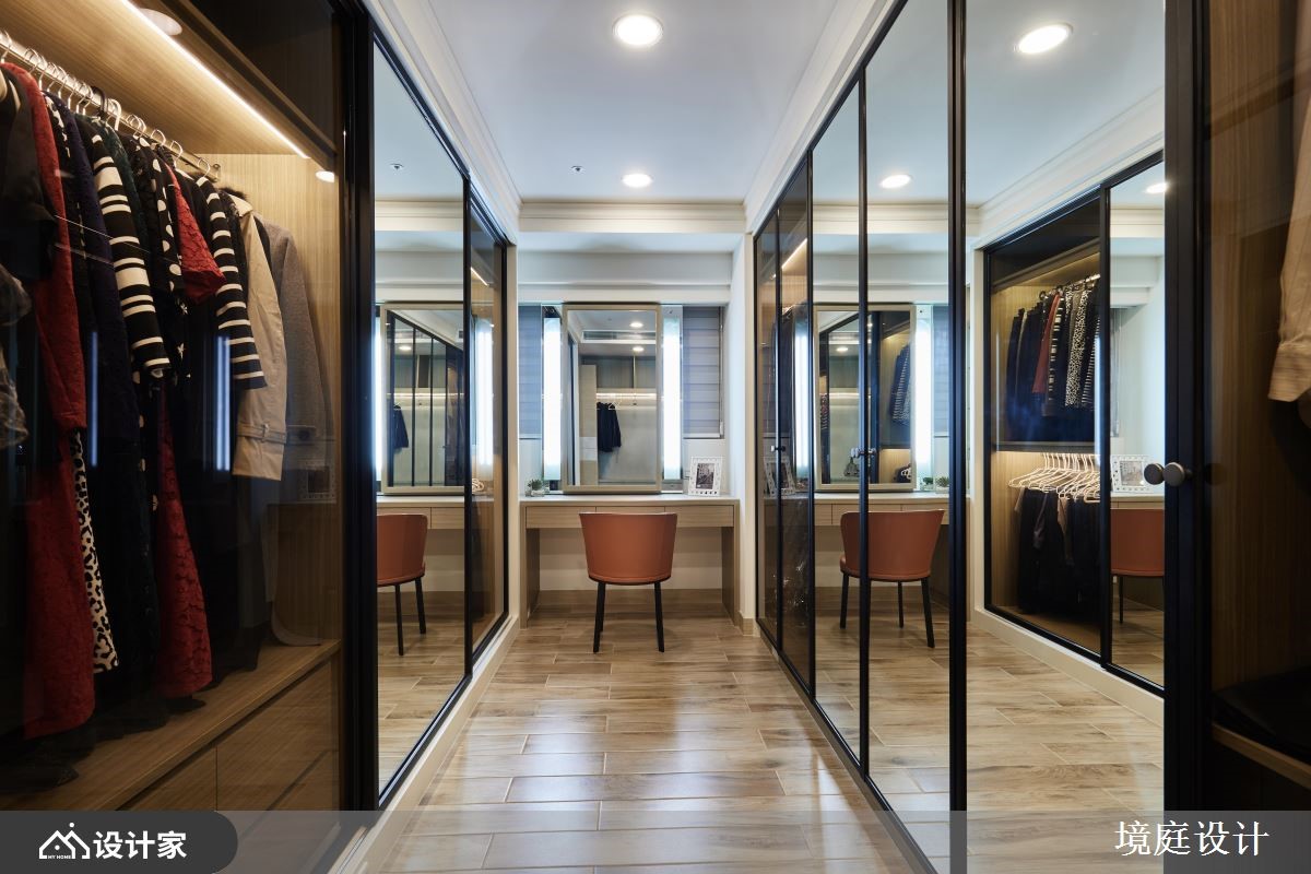 二十几年的老房,原先拥有格局差、采光不佳等问题,而设计师掌握视觉比例的要点,以大理石、贝壳板、镜面、皮革等多維建材,搭配跳色的家具软件,使一家三口能享有精品饭店的空间气度。【多维装饰,创造丰富的大宅视觉】玄关地面透过绿光森林大理石,揭开居家的高尚序幕,紧接着映入眼帘的是,两侧运用贝壳板修饰的菱形镜面,形成了放大公领域的优雅端景。而公领域采取开放式的规划,且在天花装饰雕刻板,隐藏空调主机的同时,又可以提升室内的典雅氛围。客厅电视墙运用石材纹理,表现空间的沉稳魅力,给人安心的生活感受。餐厅使用不同造型的蒂芙尼蓝与爱马仕橘餐椅,让用餐区域多了一些活泼的生命力,而一旁柜体的艺术夹纱玻璃推拉门,则营造和谐的视觉平衡。主卧藉由床头绷布及镜面的结合,加上衣柜的皮革花纹,打造宛如精品酒店的沉着气质。另外,分别隐藏于床头跟入口处,设计师细心规划储藏间和三面镜的更衣间,令人沉浸高级的穿搭体验。小编的最爱女儿房倚傍自然光,设置书桌与飘窗,让女儿拥有一处能够静心的场域,而化妆台则能够收整于推拉门后方,使睡眠质量不会受到镜面影响。