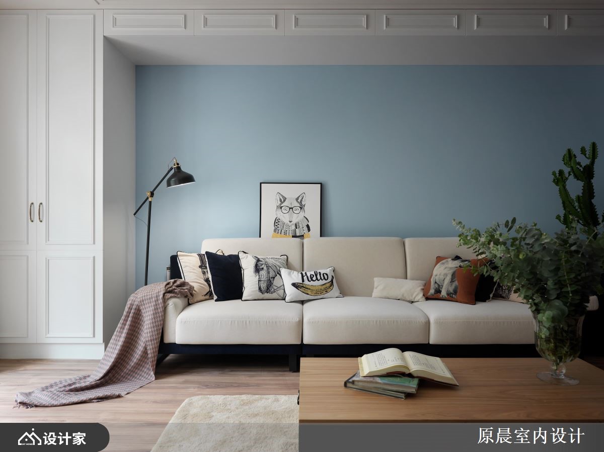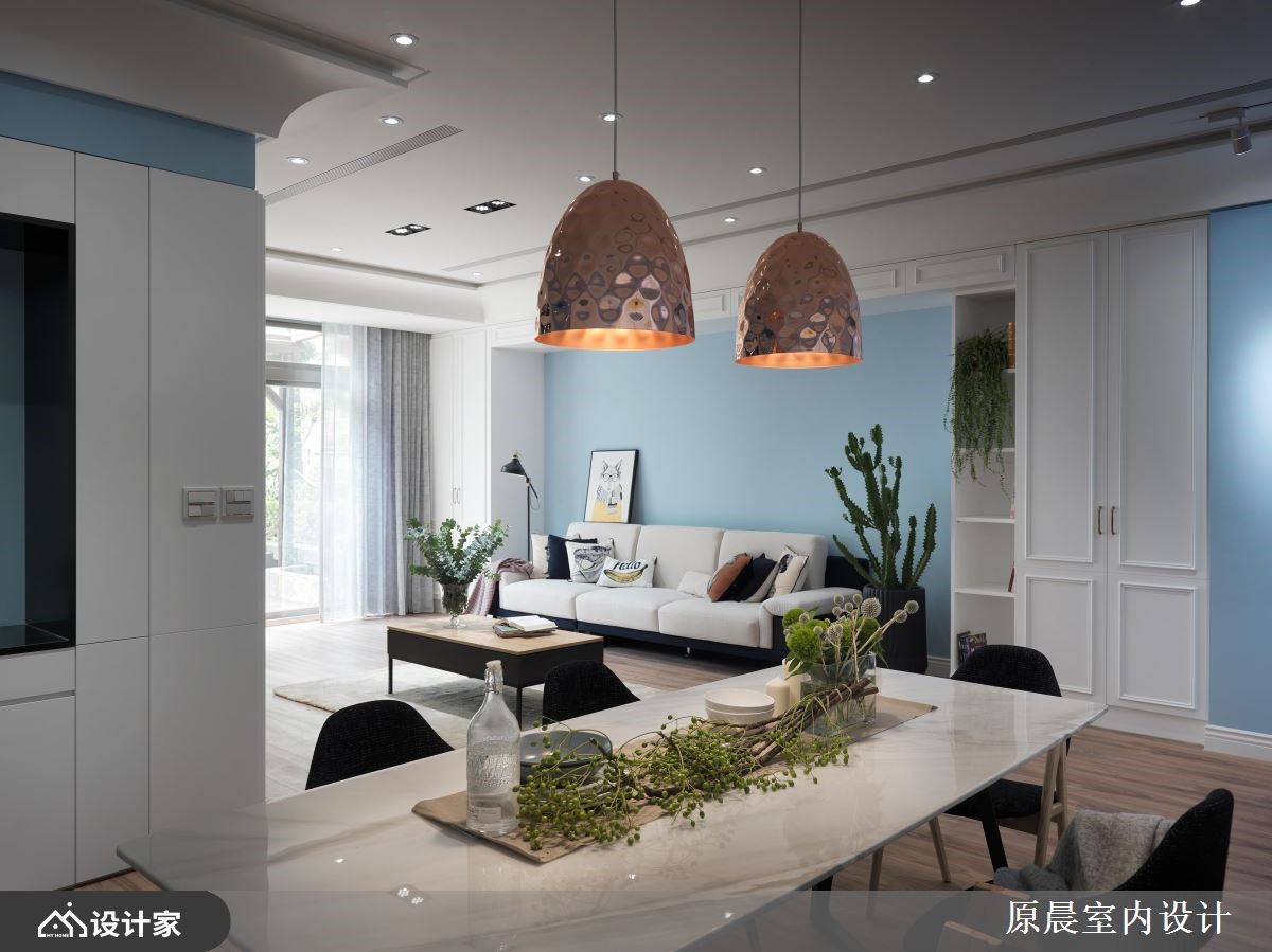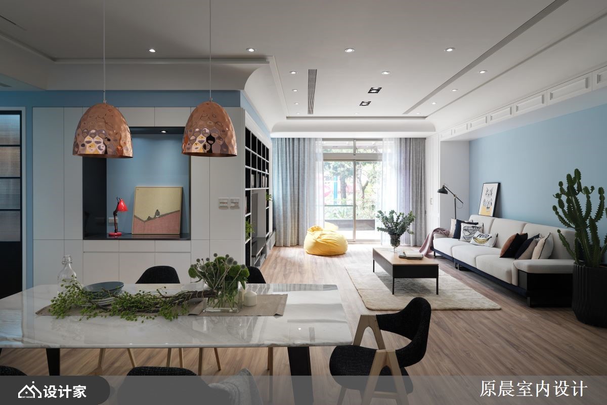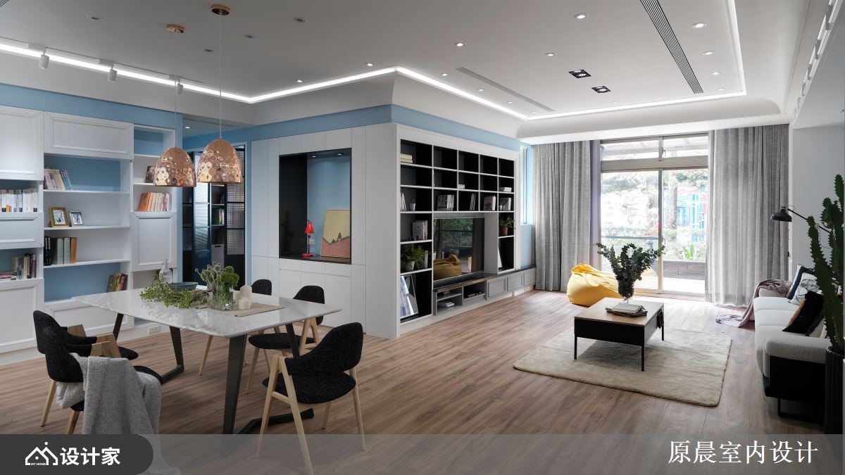 居住多年的老屋,经过设计团队的巧手安排下,实现男屋主喜爱蓝色与阅读、女屋主期待鹅黄色厨房,空间里并以收纳与展示融入藏书与旅行兴趣,交织出明亮、缤纷的美学生活。 从玄关走进室内,落地窗引入充沛自然光,开放公领域拥有的开阔视线映入眼帘,立即感受到心旷神怡。白色的天花板以弧形收边、挑高层次,搭配壁面以浅蓝色调饰底,轻盈的色彩调和让空间更显宽敞;电视墙结合展示收纳机能,让屋主大量的书籍、风格对象能够一次陈列,以线板美化梁柱结构,刚好将沙发纳入其中;客餐厅之间以 L 形壁面串连电视墙与书房区,采玻璃折门的方式界定书房与公领域,整面木作书墙飘送着浓浓书香气息,将折门敞开后,可引入更多自然光到餐厅区;拆除厨房隔间墙,并增设一道吧台,界定出餐厨领域,能随时欣赏女屋主优雅烹调的美丽身影,而藉由鹅黄色的厨房设计,也让料理时光充满无限活力。 小编的最爱 强化收纳机能是整体空间的设计重点之一,公领域里将电视墙、餐柜区到书房,皆打造大量的柜体与开放层板,更能烘托对象特色,转化为空间的风格装饰。