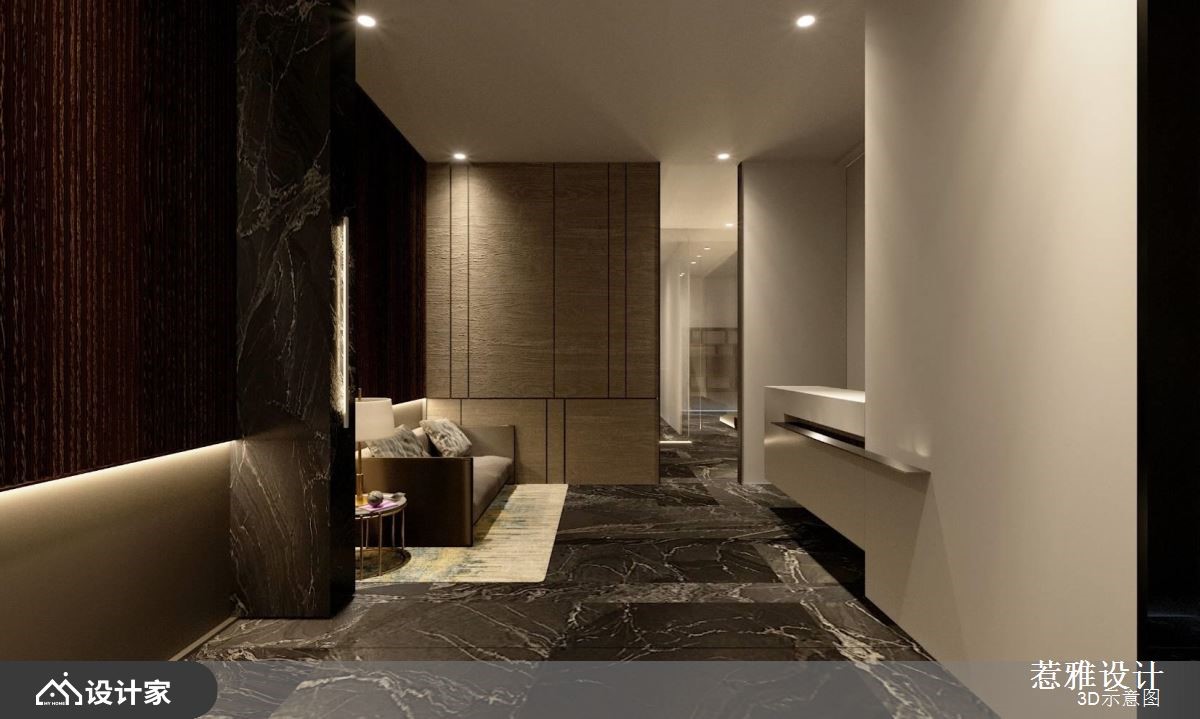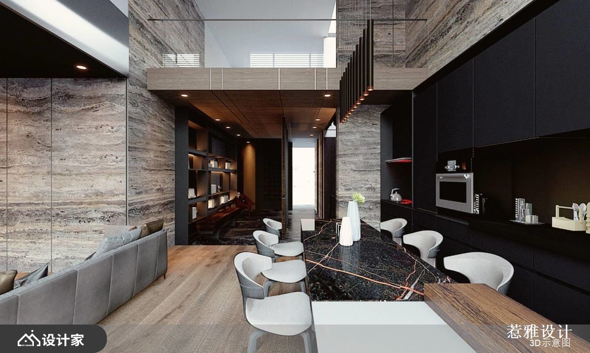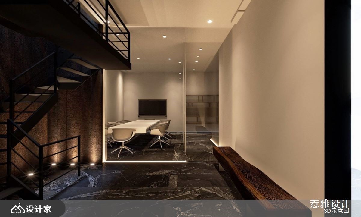 158平米的中式风写字楼,拥有室内挑高、格局工整、景观环绕等优势,而设计师采取低彩度的色彩运用,搭配石材与木质等自然素材,打造出沉稳大气的工作环境。【高雅石材,开拓空间大气感】入口处铺设泼墨山水的石材地面,并配置原木铁艺长椅及两张意大利品牌单椅,让客人能在大型铁艺书柜前,抢先感受公司的人文气韵。挑高区域则展开温润的木地板,佐以意大利银灰洞石的立面,使空间在木百叶透入的阳光下,表现出朴实又时尚的气质,一举一动顿时间优雅起来。客厅规划对坐的双主沙发,传递平衡的东方美学,给人对等的交谈气氛;餐饮区域则结合吧台与餐桌,创造明亮简约的机能场域,而大面积的黑色电器柜,满足了职员的日常所需。顺着阶梯向下,来到玻璃隔断的会议室及接待区,完整的机能划分,赋予公司更有弹性的使用空间。小编的最爱位于入门处的铁艺木质隔断,巧妙地导引动线进入吧台区和地下室,又能减少人来人往对等待客人造成的心理负担。