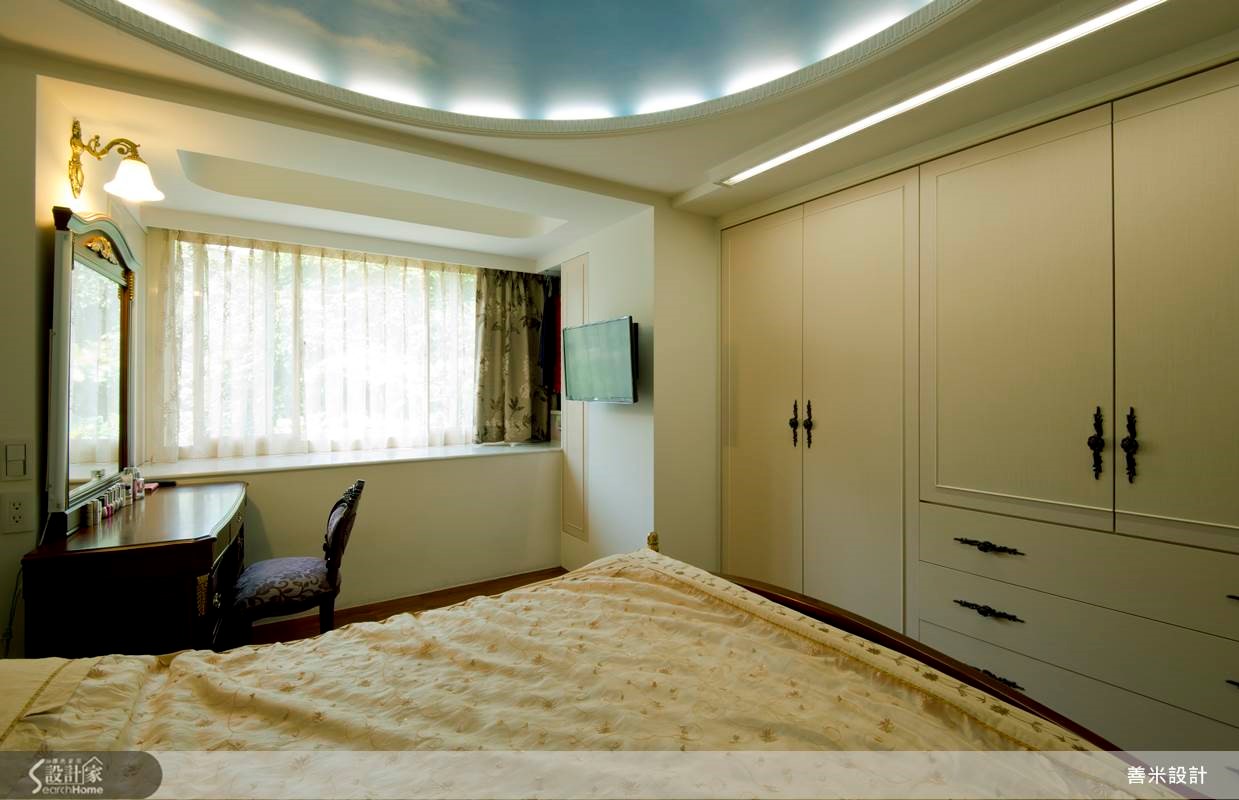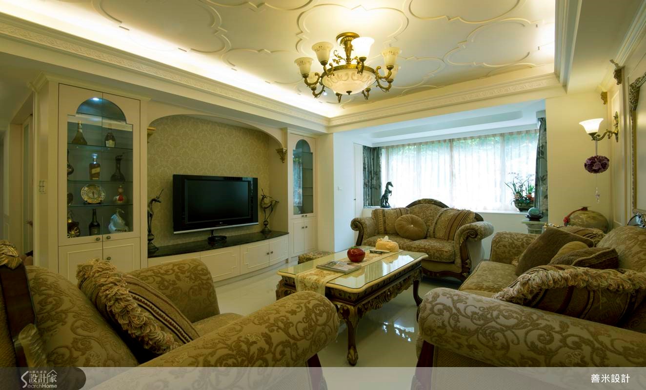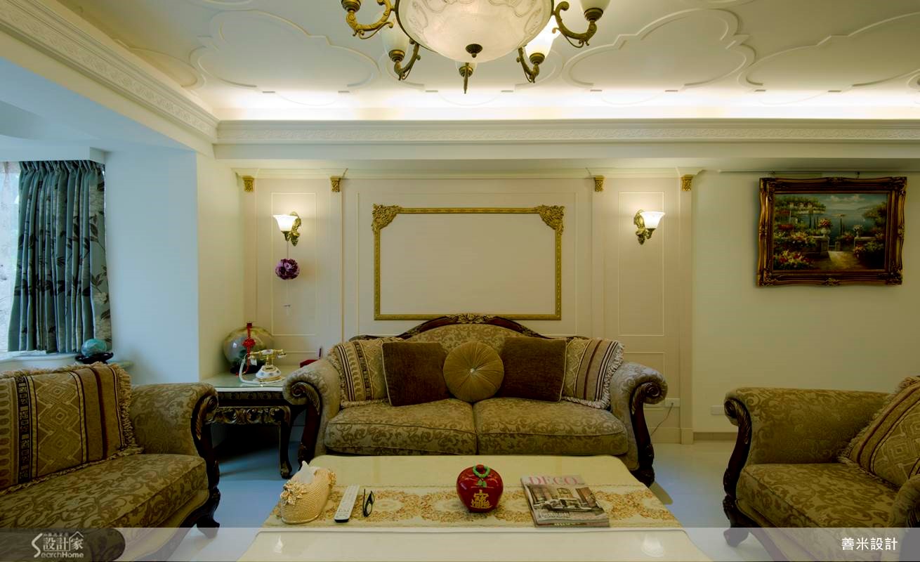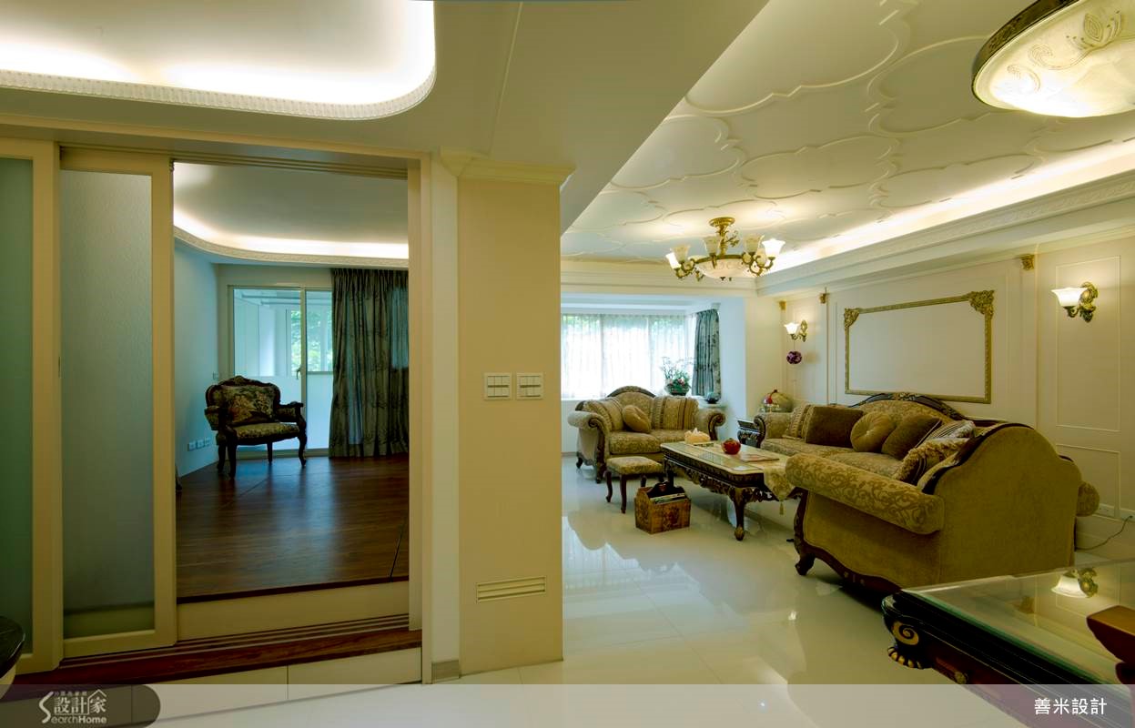 设计师以新古典风格重新改造老屋空间,从业主的角度着眼设计,考虑每一位居家成员,依照每个人的需求量身打造,经由细腻的线条比例、唯美的灯光与建材选搭,打造出纯正的欧式古典视野,快跟着小编一起来看看吧!入门以金框玄关镜搭配对称花纹地面,并配置收纳柜体与穿鞋椅,奢华风韵中不乏实用机能;客厅沙发背墙运用金框元素,打造画廊般的大器质感,并采用上照式吊灯与间接照明、呼应天花板图腾与精雕线板,使古典风味充盈满室,电视墙两侧则以透明收纳柜体呈现对称美感;开放式厨房台面向外延伸并结合吧台功能,上方配置了灯光、玻璃及高脚杯架,不只增添实用性,也让厨房天花维持通透美感;廊道侧墙可见以镜面为背景的端景台,展示屋主艺术品味,并以圆弧收边天花柔化格局线条!小编的最爱 主卧室的收纳柜体以花形门把展露欧式风情,在圆形天花板上添加蓝天白云元素,并搭配周边间接光源,引入宛如太阳般的温暖光晕,使人即使于室内也能仰看户外的辽阔美景!