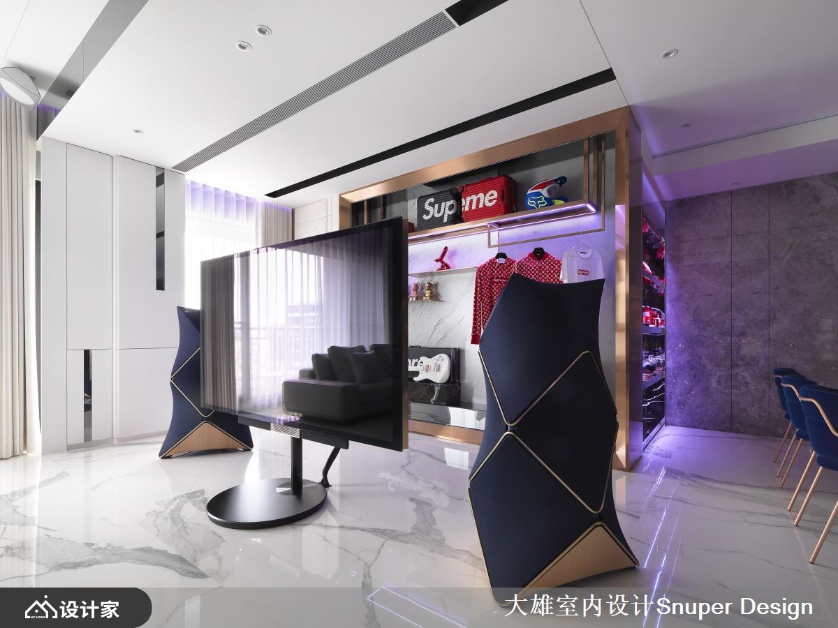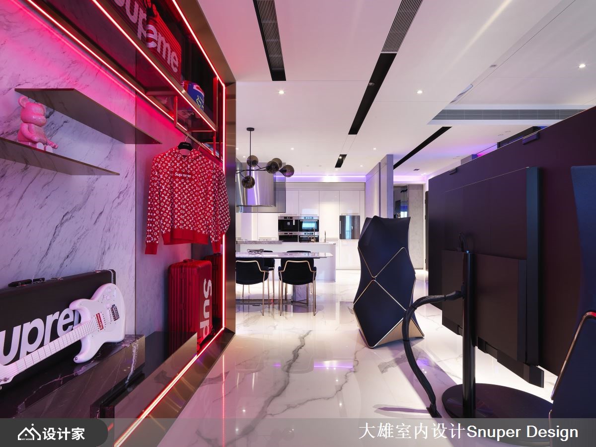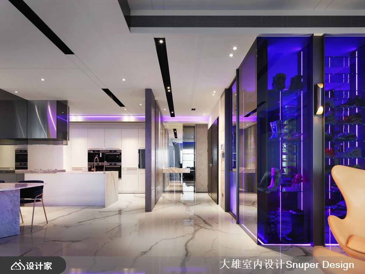 考量到业主夫妻从事时尚产业,设计师在215平米的现代风大宅,规划绚丽光带环绕的精品展示空间,让每个角落都诠释出不同的潮流焦点,突破家居的既定印象。【异建材混搭,打造前卫展示橱窗】一进到室内,光彩夺目的大型鞋柜摆放着两人收藏的经典鞋款,透过不锈钢、镀钛、玻璃及镜面等异建材搭配,结合情景控制设备,彷佛精品的展示橱窗,能够360度欣赏每一双鞋子的工艺设计。客厅在落地式家庭剧院的后方,同样采取光带、金属与镜面等建材,打造另一处显现夫妻品味的展示区域,使潮流配件成为空间的亮点。原有格局厨房封闭,在设计师拿掉一间卫浴之后,改为开放式厨房与餐厅连结,创造开阔的空间视觉,而中岛则满足两人喜爱轻食的生活习惯,让格局配置更加人性化。主卧不同于公领域的现代时尚,藉由纯白的线板与金色镀钛妆点,还给夫妻放松舒服的睡眠环境,同时带来法式古典的大宅浪漫。小编的最爱更衣间展现优雅的古典情怀,地面的镀钛金属引领着通往精品世界的动线,加上分门别类的收纳空间和化妆台,让人有种置身欧洲贵族豪宅的感受。