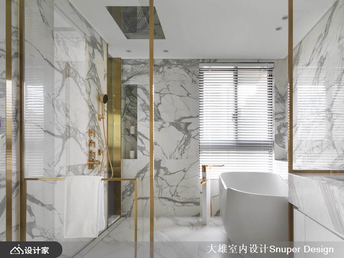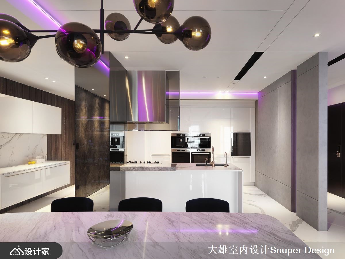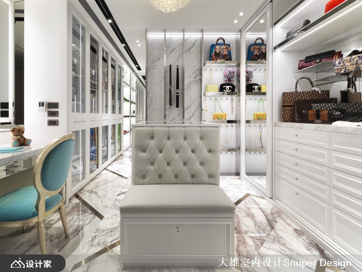 考量到业主夫妻从事时尚产业,设计师在215平米的现代风大宅,规划绚丽光带环绕的精品展示空间,让每个角落都诠释出不同的潮流焦点,突破家居的既定印象。【异建材混搭,打造前卫展示橱窗】一进到室内,光彩夺目的大型鞋柜摆放着两人收藏的经典鞋款,透过不锈钢、镀钛、玻璃及镜面等异建材搭配,结合情景控制设备,彷佛精品的展示橱窗,能够360度欣赏每一双鞋子的工艺设计。客厅在落地式家庭剧院的后方,同样采取光带、金属与镜面等建材,打造另一处显现夫妻品味的展示区域,使潮流配件成为空间的亮点。原有格局厨房封闭,在设计师拿掉一间卫浴之后,改为开放式厨房与餐厅连结,创造开阔的空间视觉,而中岛则满足两人喜爱轻食的生活习惯,让格局配置更加人性化。主卧不同于公领域的现代时尚,藉由纯白的线板与金色镀钛妆点,还给夫妻放松舒服的睡眠环境,同时带来法式古典的大宅浪漫。小编的最爱更衣间展现优雅的古典情怀,地面的镀钛金属引领着通往精品世界的动线,加上分门别类的收纳空间和化妆台,让人有种置身欧洲贵族豪宅的感受。