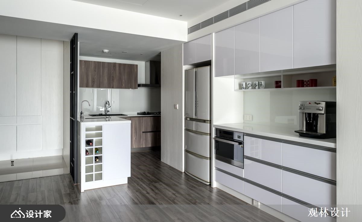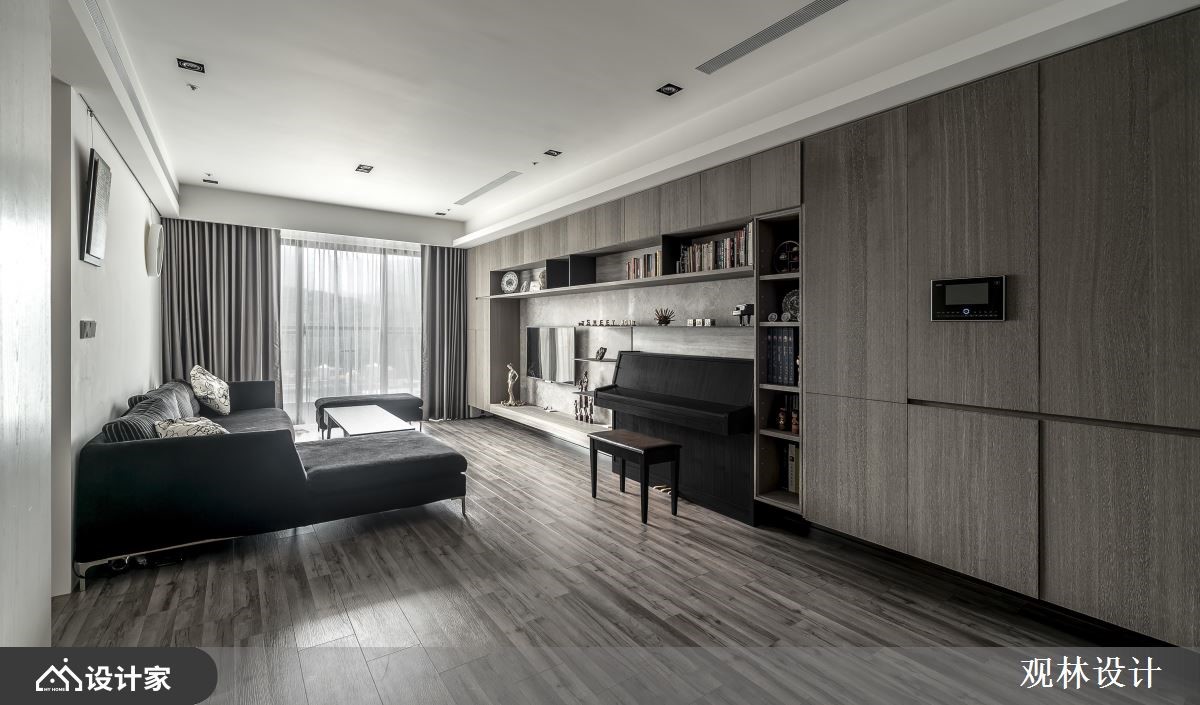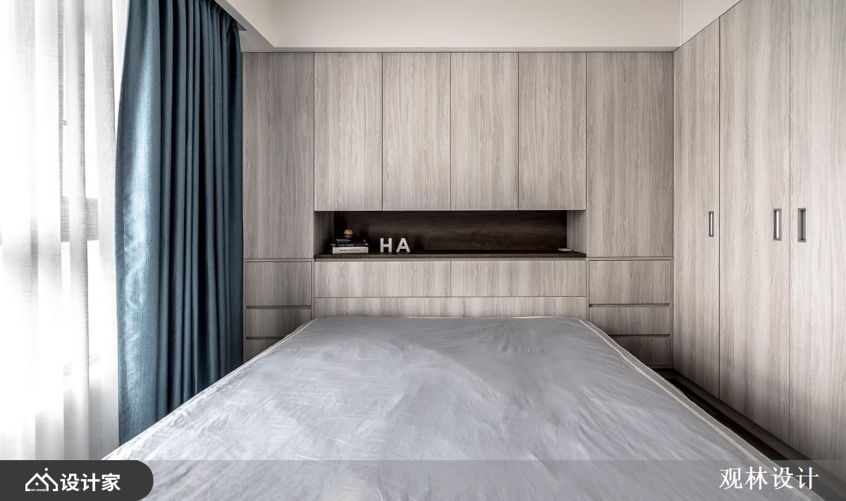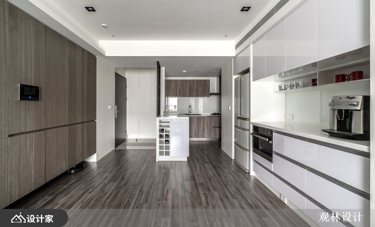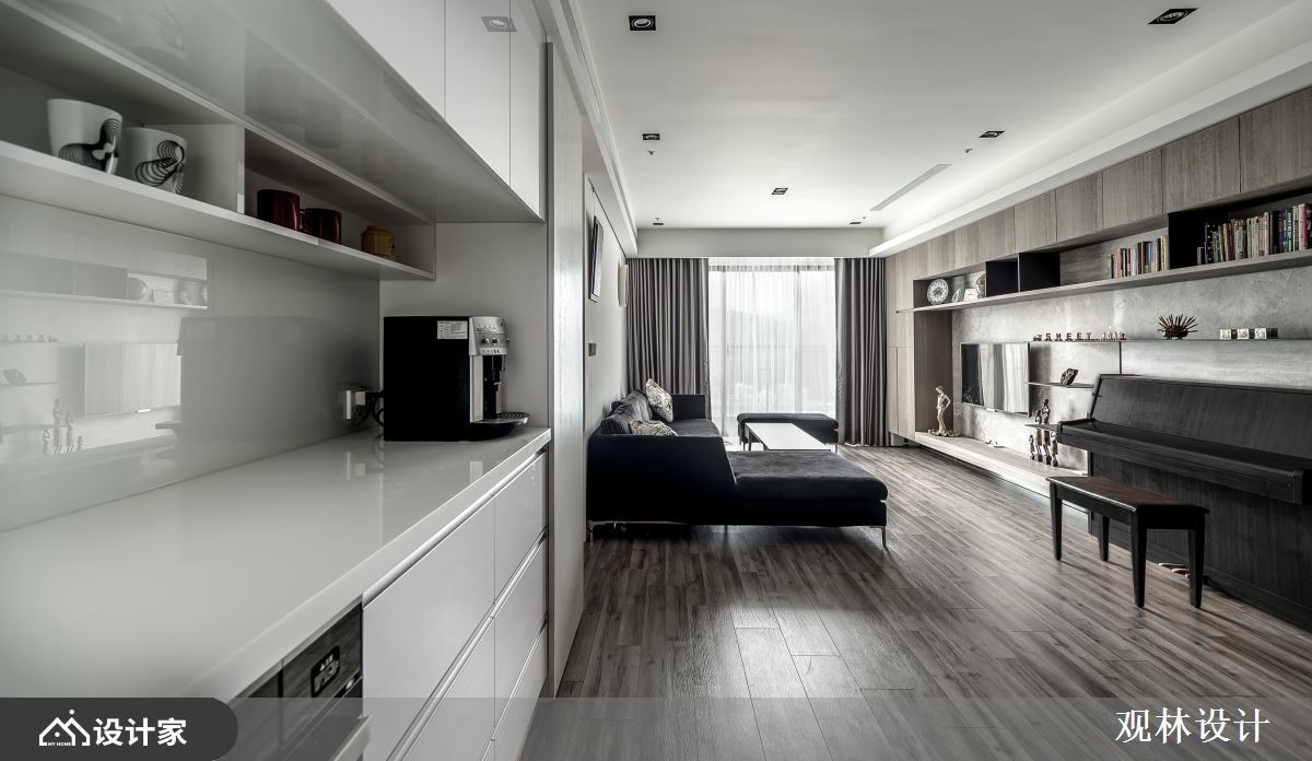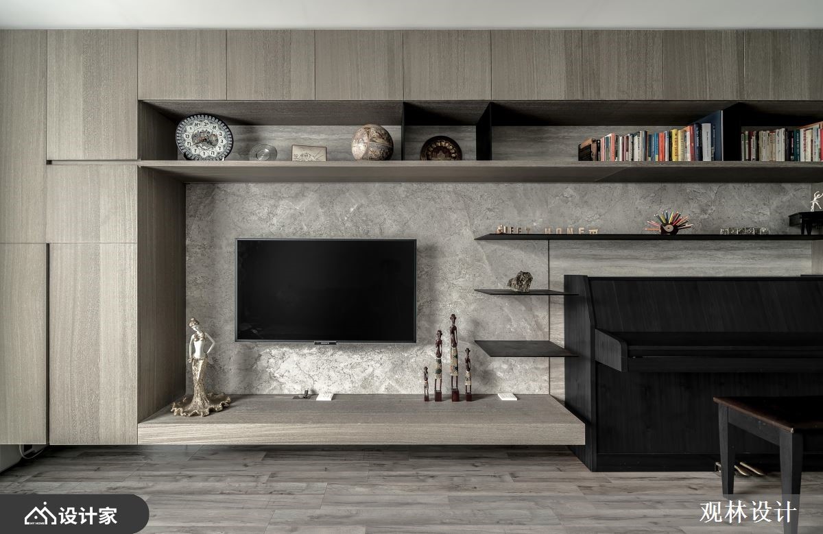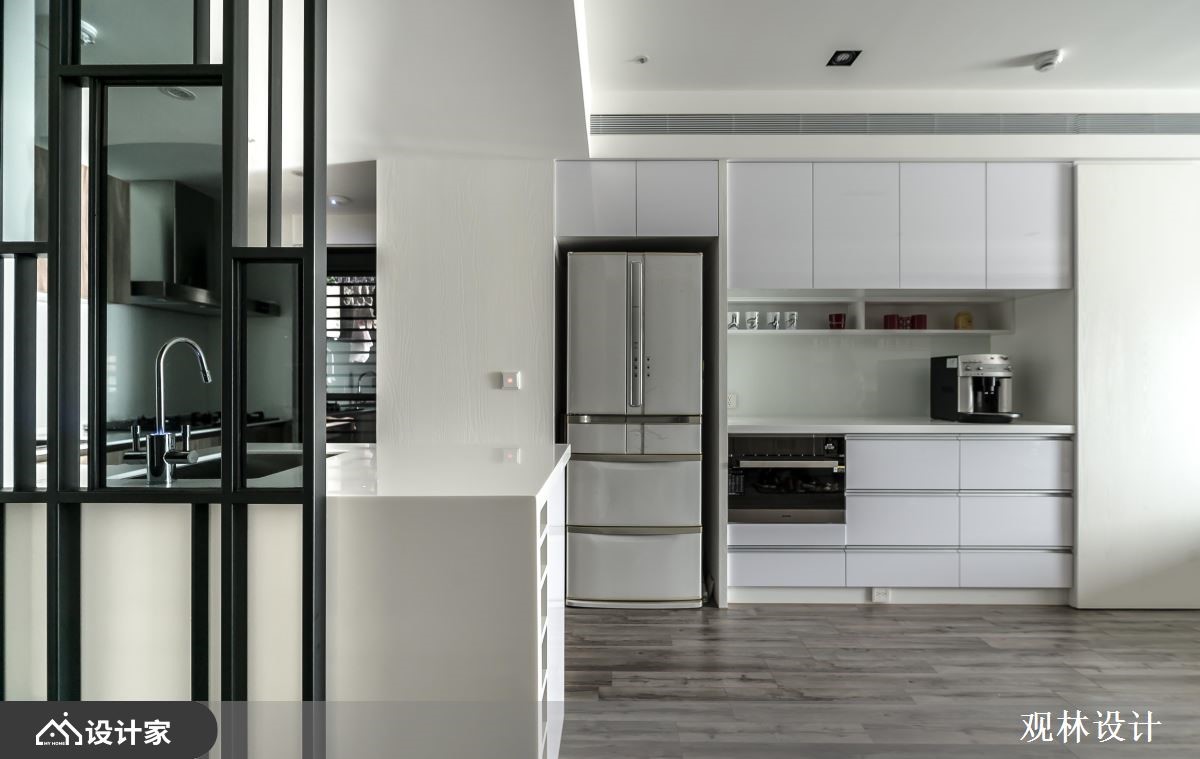 68平米混搭宅的业主夫妻从事科技产业,并育有一对子女,希望能够拥有简约利落、机能性高的家居空间,而设计师以灰阶的木纹妆点视觉,延揽窗外的湖景绿意入内,创造与孩子共同成长的快乐生活。【开放式公领域,机能及美感齐聚】玄关藉由铁件跟灰玻结合出通透屏风,划分出厨房的界线,而柜体自玄关沿着墙面,铺设至客厅窗边,加上安格拉珍珠大理石墙的层板配置,让孩子可以在宽敞明亮的公领域,拿书阅读、弹钢琴或是与父母一同聊天,使一家四口在日光和美景的陪伴下,共享温馨又充满机能的生活环境。厨房倚靠隔屏规划小型中岛,侧边融合红酒柜,让夫妻俩可以邀约亲友,来家中小酌聚会;冰箱一侧的电器柜,除了可以摆放咖啡机以外,还能整齐排列旅游带回来的马克杯,替沉稳的空间增添更多的生活温度。主卧在床头梁下设置收纳柜,且延展到另一边墙面,为夫妻营造机能强大的休息区域。小编的最爱设计师考虑室内面积不大,因此透过简洁的线条,搭配两侧的丰富收纳柜,替一家四口营造开阔的家居视野,促进亲子间的亲密谈话。