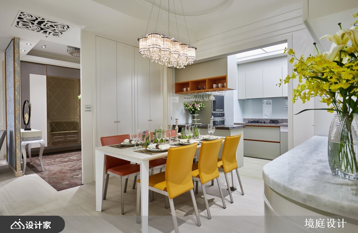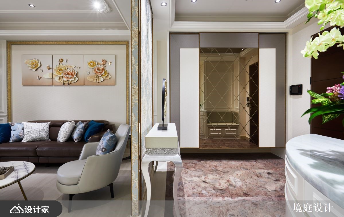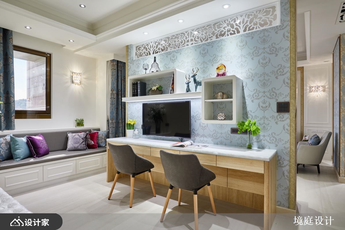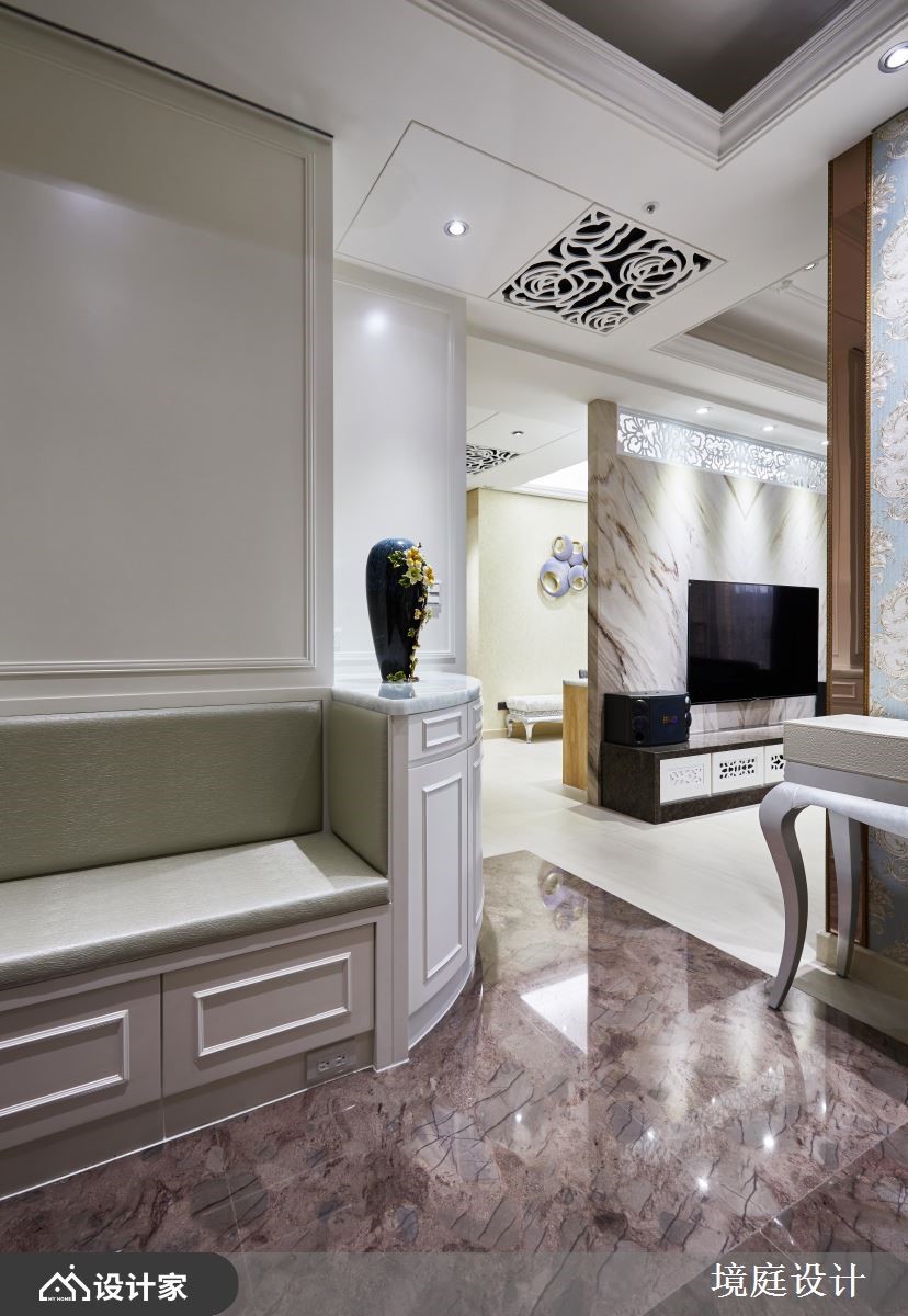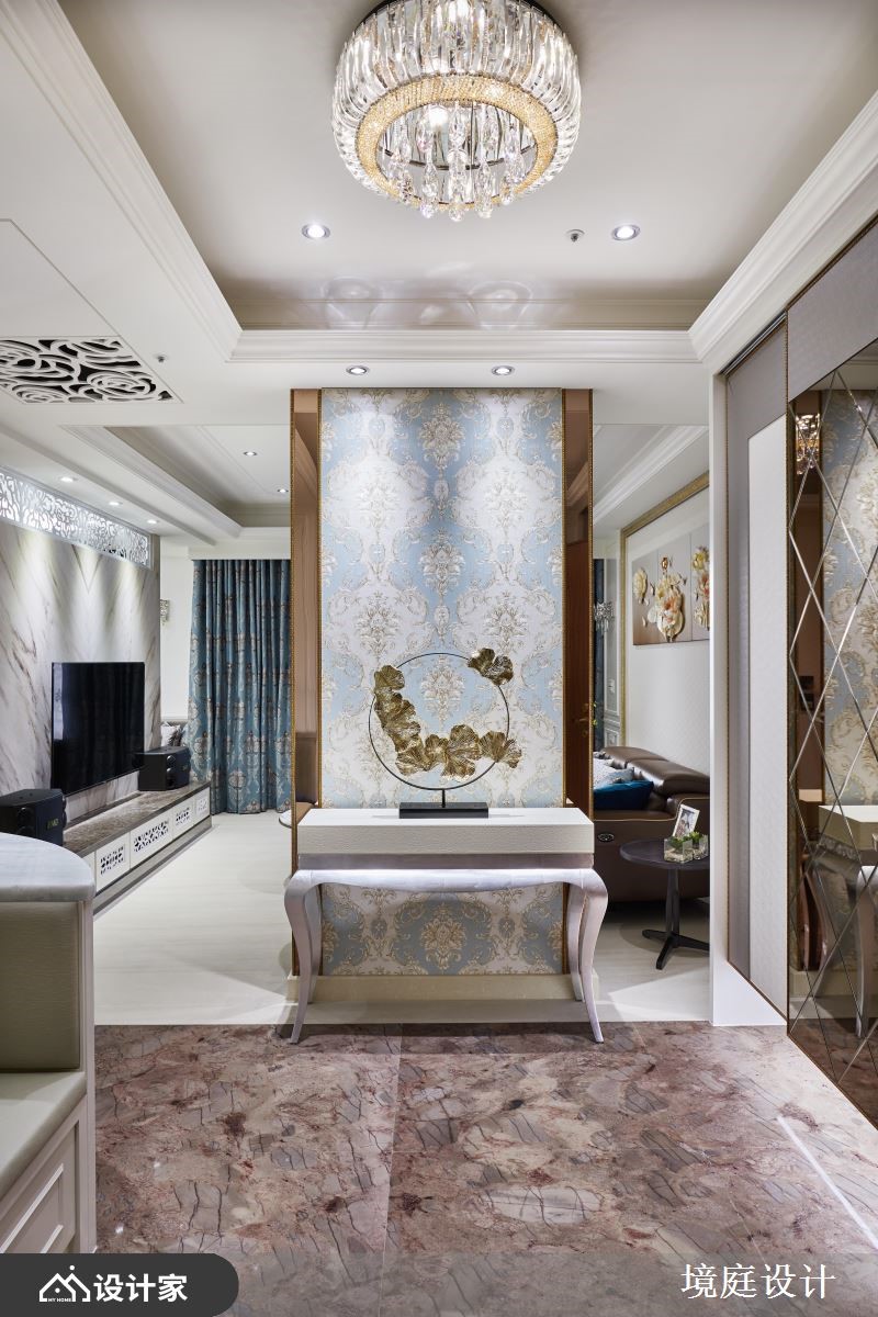 116平米混搭宅的业主喜爱大自然,因此设计师仔细挑选了不同的石材、木材,加上飞舞于立面的花卉图腾,完美融合了现代与古典的精髓,为四口之家堆砌出欧洲宫廷般的豪华气度。【善用高贵建材,营造典雅气氛】一进门右侧镶饰菱格镜面的玄关柜,结合左侧的装饰线板穿鞋椅,塑造完整的落尘区机能,而中间水晶石的展示台面,配合镀钛金属框定的古典花纹墙纸,打造出高雅不凡的质感屏风。客厅电视墙采取高贵的石材,以及墙面上方与柜体的镂空雕花妆点,提升整体的精致细节,减轻量体的视觉重量。石材电视墙的背面延续公领域的色彩配置,铺设婴儿蓝的华丽墙纸,并在墙面规划书柜及屏幕,再加上惬意的窗边飘窗,形成既开放又有区隔的阅读环境。餐厨空间藉由彩绘镶嵌玻璃推拉门,来避免油烟飘散,同时增加了空间的颜色变化。粉紫色的主卧整合衣柜与电视墙,并在床铺侧边设计更衣间入口,让夫妻俩享受宽阔的休息场域。小编的最爱设计师巧妙运用玄关跟餐厅、玄关与客厅、客厅和书房间的墙面及柜体,划分出家居的各个格局,却又保持动线的畅通,串联起空间的宽敞与家庭成员的好感情。