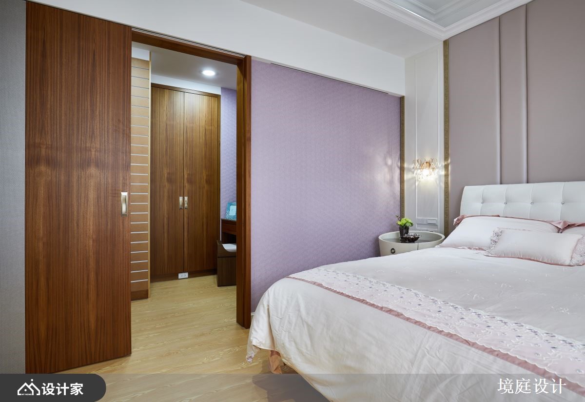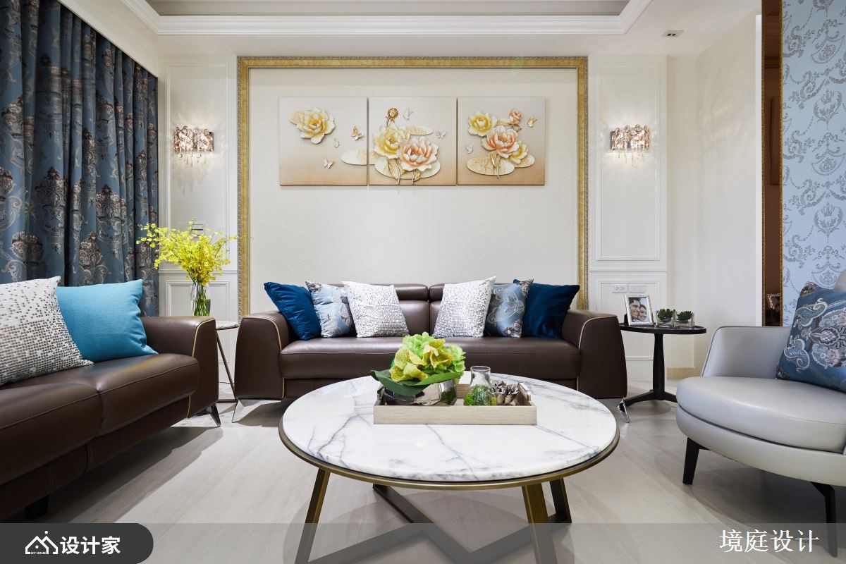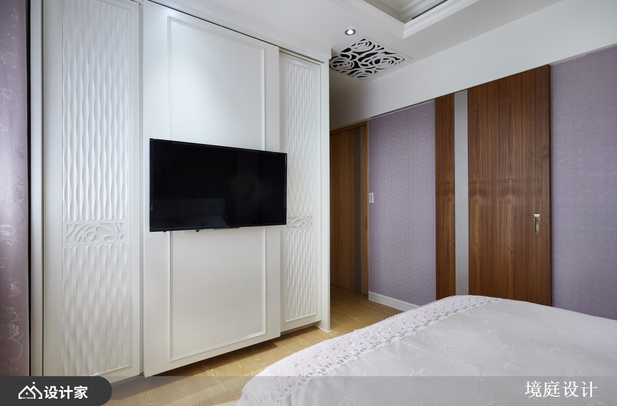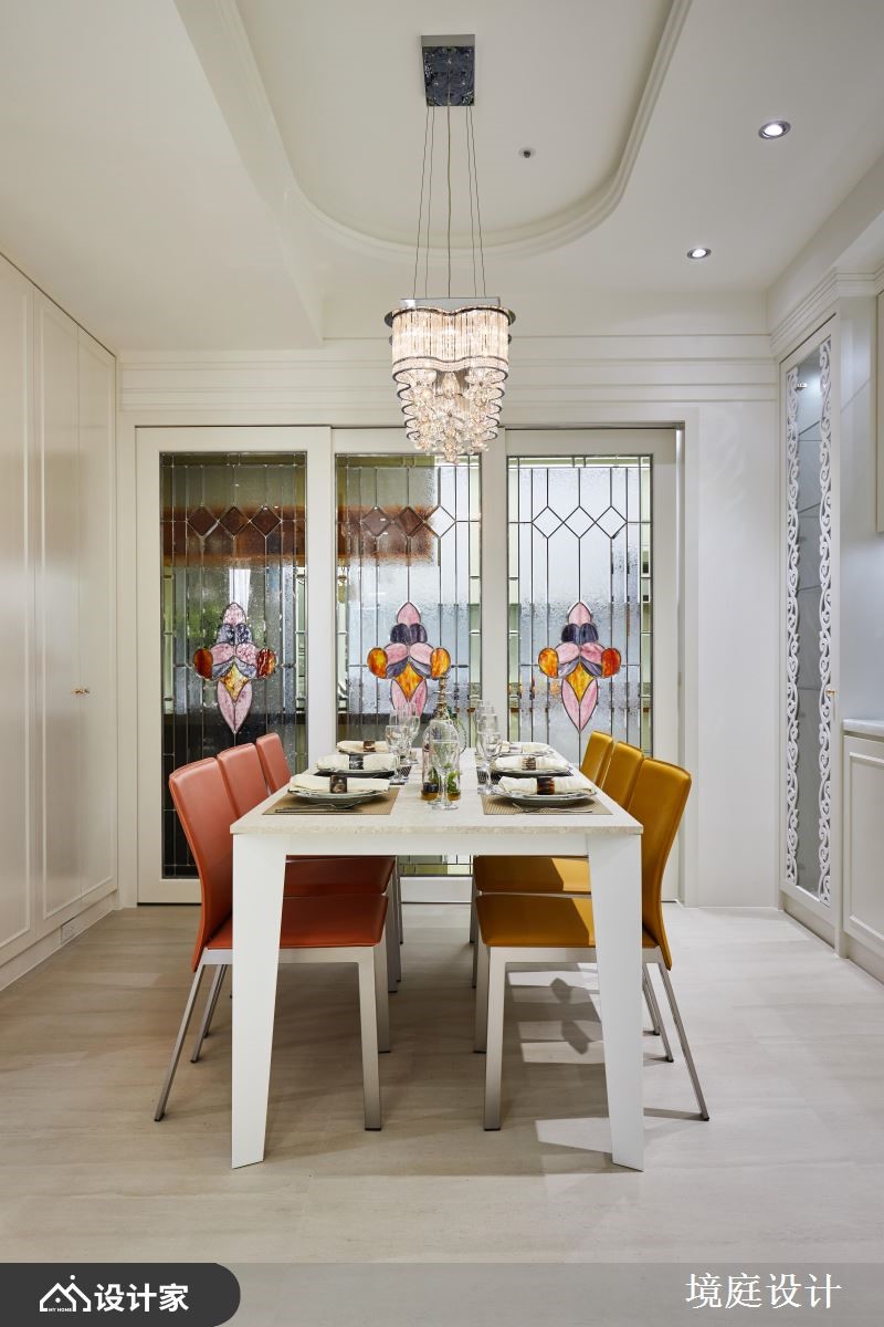 116平米混搭宅的业主喜爱大自然,因此设计师仔细挑选了不同的石材、木材,加上飞舞于立面的花卉图腾,完美融合了现代与古典的精髓,为四口之家堆砌出欧洲宫廷般的豪华气度。【善用高贵建材,营造典雅气氛】一进门右侧镶饰菱格镜面的玄关柜,结合左侧的装饰线板穿鞋椅,塑造完整的落尘区机能,而中间水晶石的展示台面,配合镀钛金属框定的古典花纹墙纸,打造出高雅不凡的质感屏风。客厅电视墙采取高贵的石材,以及墙面上方与柜体的镂空雕花妆点,提升整体的精致细节,减轻量体的视觉重量。石材电视墙的背面延续公领域的色彩配置,铺设婴儿蓝的华丽墙纸,并在墙面规划书柜及屏幕,再加上惬意的窗边飘窗,形成既开放又有区隔的阅读环境。餐厨空间藉由彩绘镶嵌玻璃推拉门,来避免油烟飘散,同时增加了空间的颜色变化。粉紫色的主卧整合衣柜与电视墙,并在床铺侧边设计更衣间入口,让夫妻俩享受宽阔的休息场域。小编的最爱设计师巧妙运用玄关跟餐厅、玄关与客厅、客厅和书房间的墙面及柜体,划分出家居的各个格局,却又保持动线的畅通,串联起空间的宽敞与家庭成员的好感情。