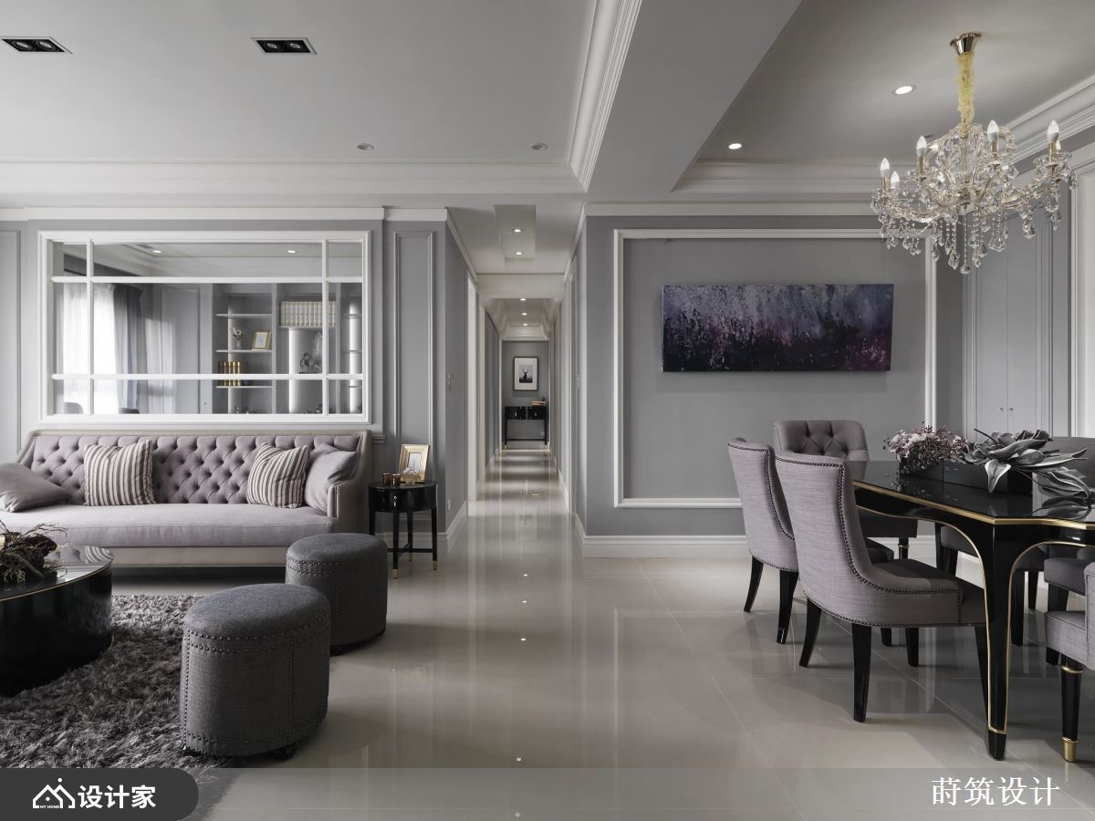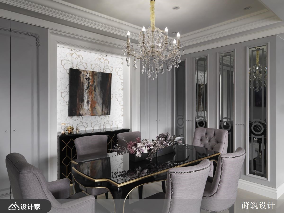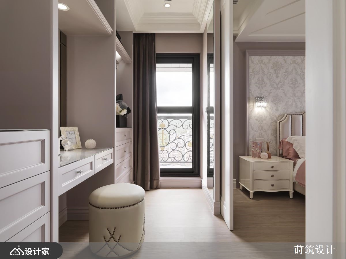 女人要的家是什么模样?简单大方的风格、舒适的家具软件、干净充足的柜体,以及一间专属的更衣间,所有的梦想清单都在这间99平米的法式古典住宅中被实现。【灰蓝色墙面,提供柔美视觉飨宴】室内采取优雅的灰蓝色为主调,并佐以利落的装饰线板,加上古典气质的进口墙纸,呈现柔和大度的空间氛围,让每个造访的亲友都惊呼眼前的奢华飨宴。客餐厅选择开放式的规划,使自然光能够照亮紫色沙发与璀璨的水晶吊灯,塑造家居的娴雅气氛,而餐厅柜体的喷砂玻璃建材,扩张了整体的空间感,提升视觉层次。主卧天花利用交错的简约线条,配合粉色系的视觉配置,界定出与公领域不同的质感;推开纯白的线板推拉门,长型的更衣间延续主卧风格,结合梳妆台、衣柜与穿衣镜,满足女主人的打扮需求。次卧则打造为中性的空间气质,且于梁下设置黑白配色的衣柜,以及善用畸零空间的开放式书柜,让人可以在寝卧度过悠闲的午后时光。小编的最爱设计师在客厅后方隔出一间书房,面向客厅的墙面开了一扇窗,串联起公共空间的采光,又能够放大家居的视野,使女主人彷佛恣意穿梭于薰衣草的芬芳之间,获得满满的疗愈力量。