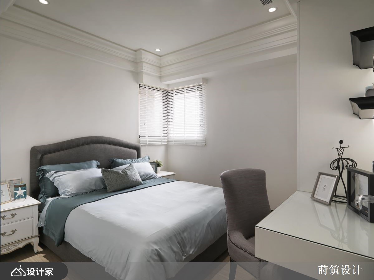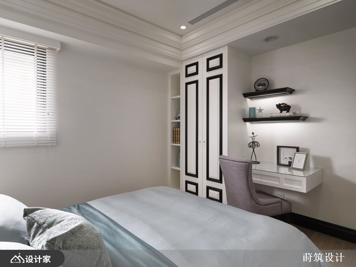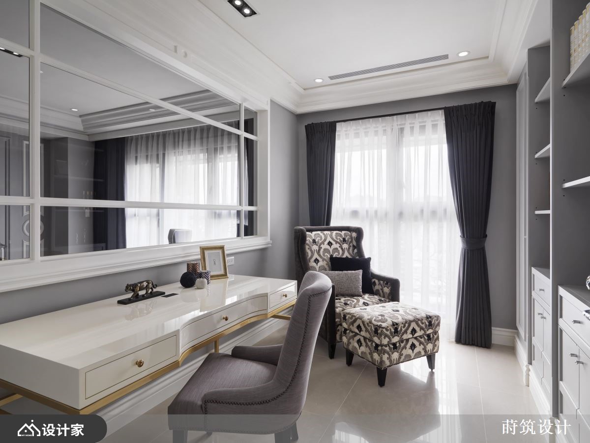 女人要的家是什么模样?简单大方的风格、舒适的家具软件、干净充足的柜体,以及一间专属的更衣间,所有的梦想清单都在这间99平米的法式古典住宅中被实现。【灰蓝色墙面,提供柔美视觉飨宴】室内采取优雅的灰蓝色为主调,并佐以利落的装饰线板,加上古典气质的进口墙纸,呈现柔和大度的空间氛围,让每个造访的亲友都惊呼眼前的奢华飨宴。客餐厅选择开放式的规划,使自然光能够照亮紫色沙发与璀璨的水晶吊灯,塑造家居的娴雅气氛,而餐厅柜体的喷砂玻璃建材,扩张了整体的空间感,提升视觉层次。主卧天花利用交错的简约线条,配合粉色系的视觉配置,界定出与公领域不同的质感;推开纯白的线板推拉门,长型的更衣间延续主卧风格,结合梳妆台、衣柜与穿衣镜,满足女主人的打扮需求。次卧则打造为中性的空间气质,且于梁下设置黑白配色的衣柜,以及善用畸零空间的开放式书柜,让人可以在寝卧度过悠闲的午后时光。小编的最爱设计师在客厅后方隔出一间书房,面向客厅的墙面开了一扇窗,串联起公共空间的采光,又能够放大家居的视野,使女主人彷佛恣意穿梭于薰衣草的芬芳之间,获得满满的疗愈力量。