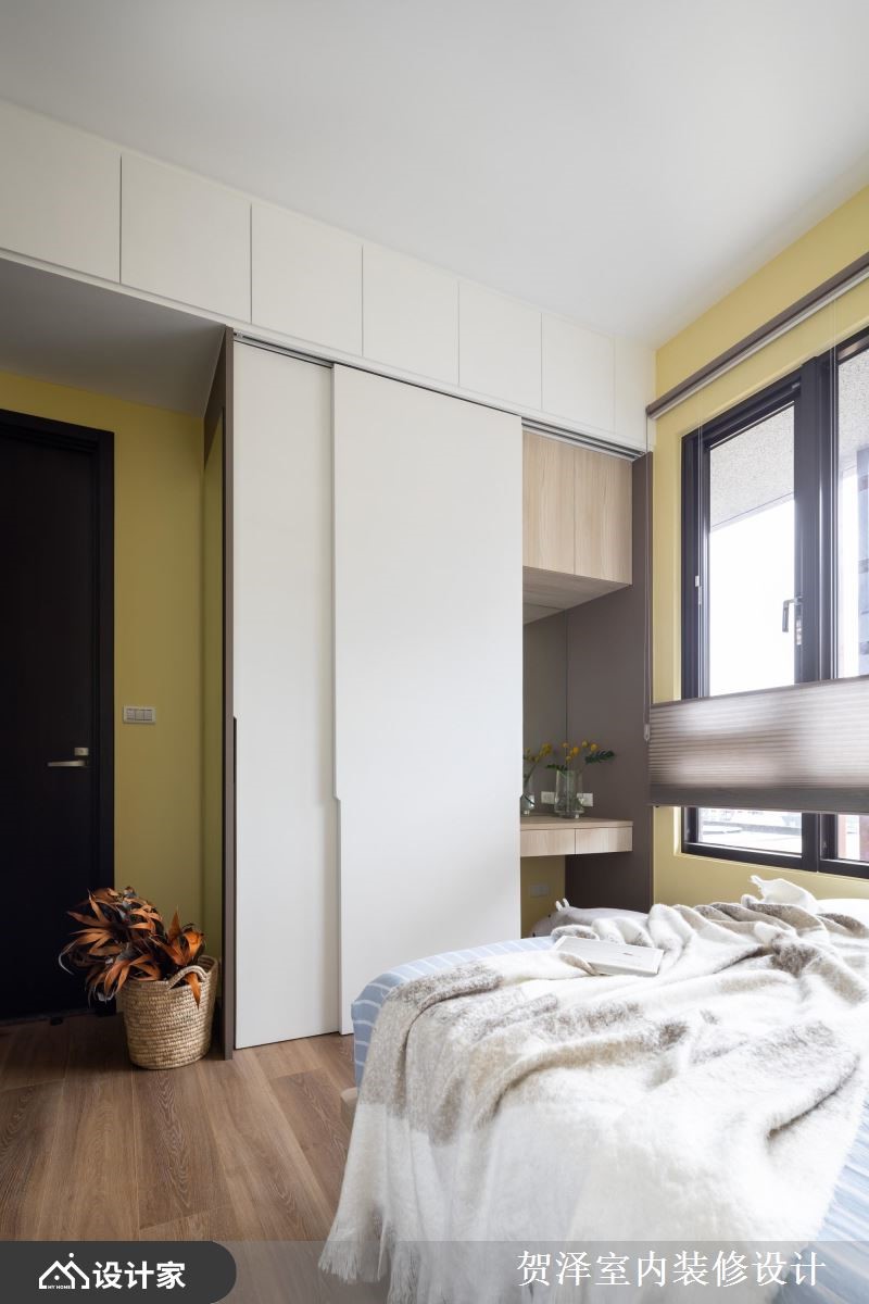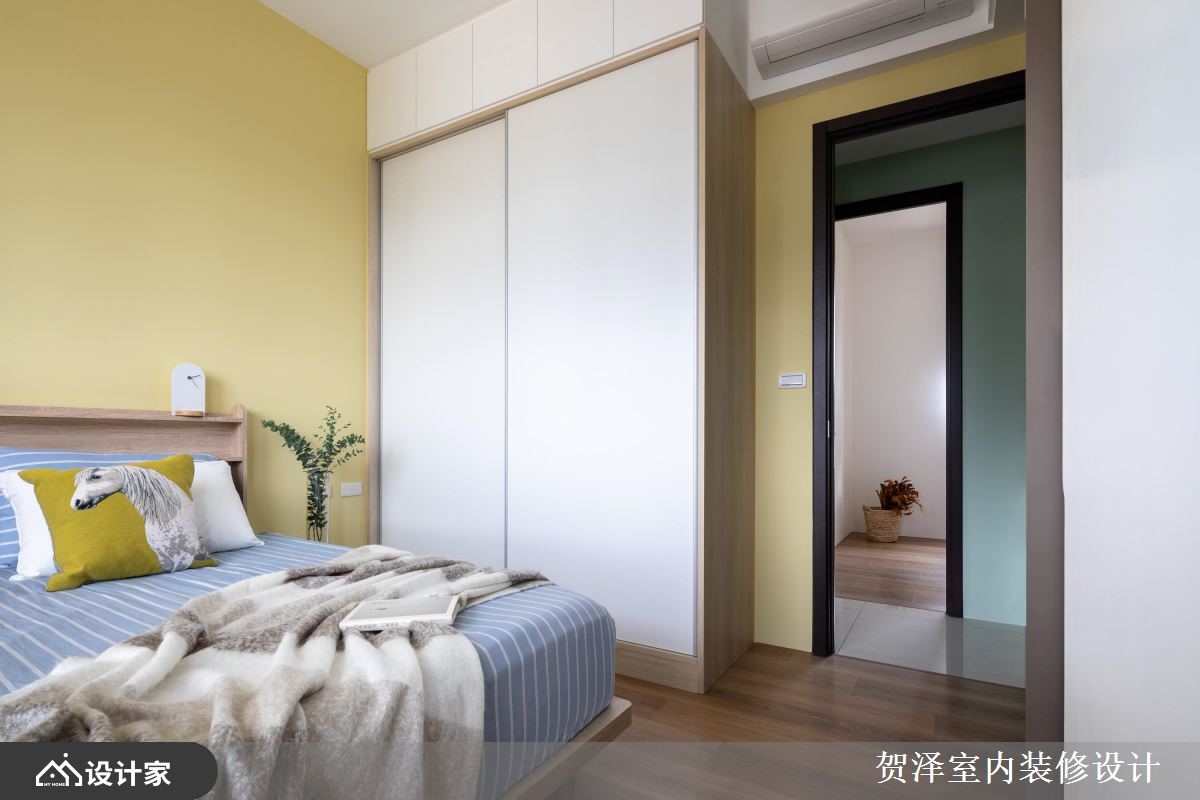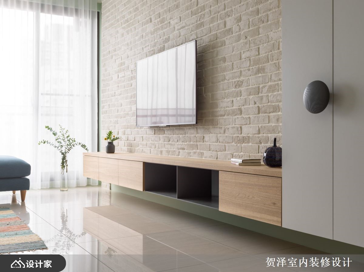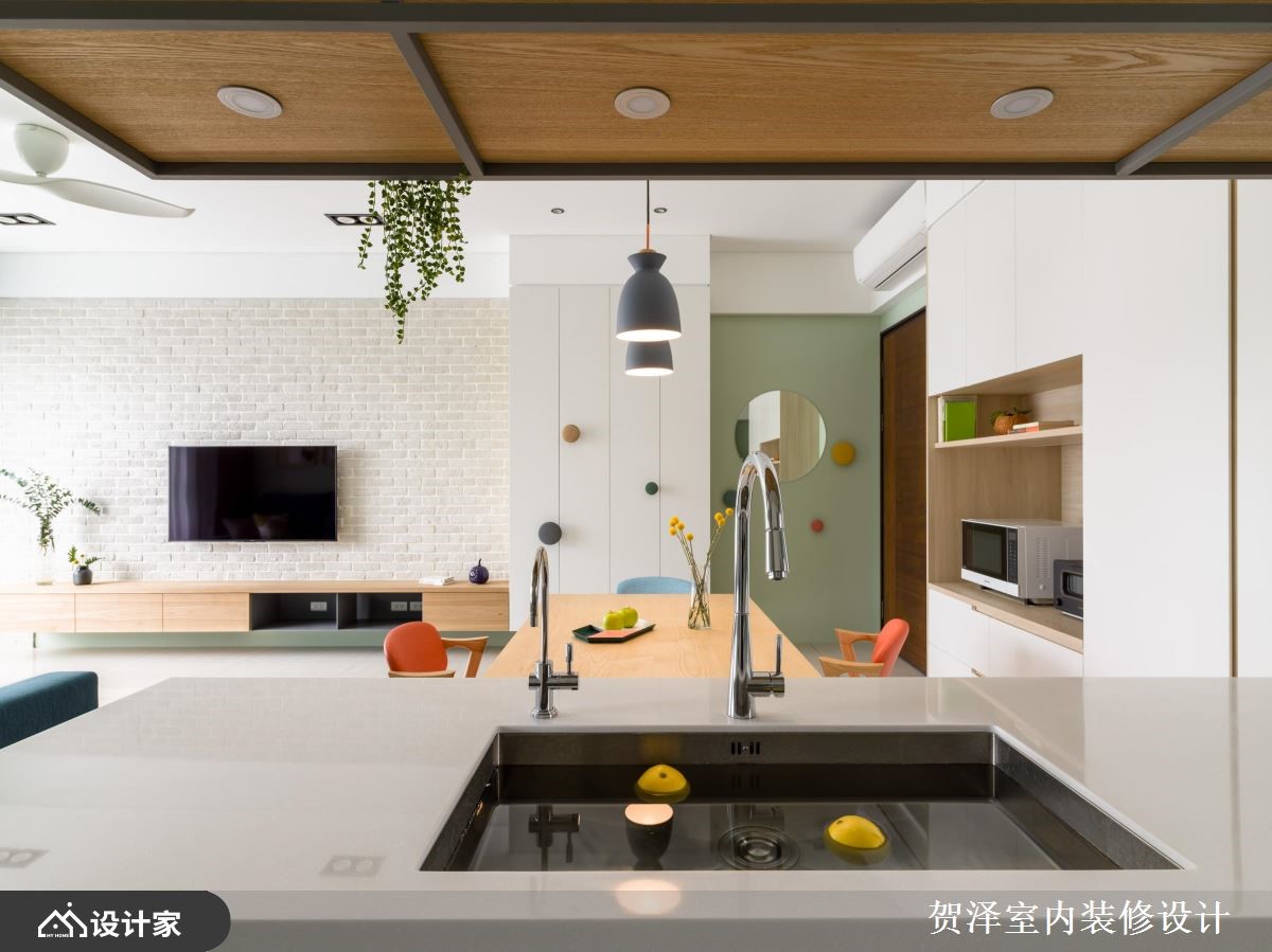 从事科技业的忙碌业主,希望能够拥有清新好整理的家居生活,因此设计师透过缤纷的色彩,为99平米的住宅注入青春活泼的北欧风格,回到家立刻放松紧绷的情绪。【缤纷色彩,塑造清新活泼氛围】一走进室内,右边一整排白色收纳柜,妆点着大大小小、错落有致的圆形把手,带来俏皮有趣的韵律感。公领域以浅绿色为主视觉,搭配蓝色的布质沙发、多色软件、清雅画作,让人可以沉浸于充足的自然光中,体会柔和惬意的自然美感。客厅选择白色文化石电视墙,配合木质柜体,提升整体的视觉层次,给人清丽隽永的家居感受。开放式的餐厨空间,透过中岛连结厨房与餐厅,让家人可以在此边准备餐点边凝聚情感。原木质感的餐桌椅加入蓝橘二色,点亮温馨的用餐时光,而沿着梁下设置的悬吊铁架,分层布置了特色摆件与酒杯,竭尽所能地利用空间。主卧采取鹅黄色为色彩主调,象征满满的疗愈能量,并于床尾配置能够隐藏化妆台的推拉门,提升睡眠环境的舒适度。小编的最爱充足的收纳机能、缤纷的色彩配置、开阔的格局规划,形成简单自然的家居模样,令人享受轻盈自在的休憩时光。