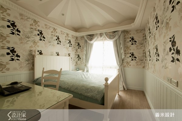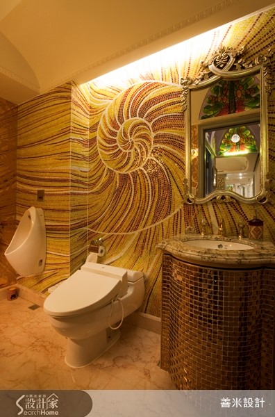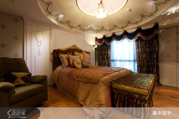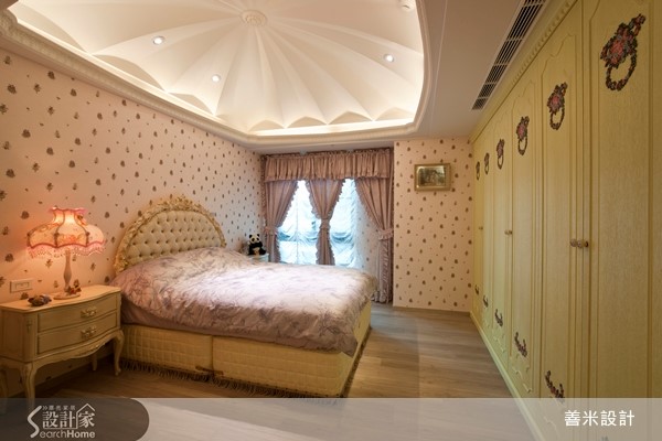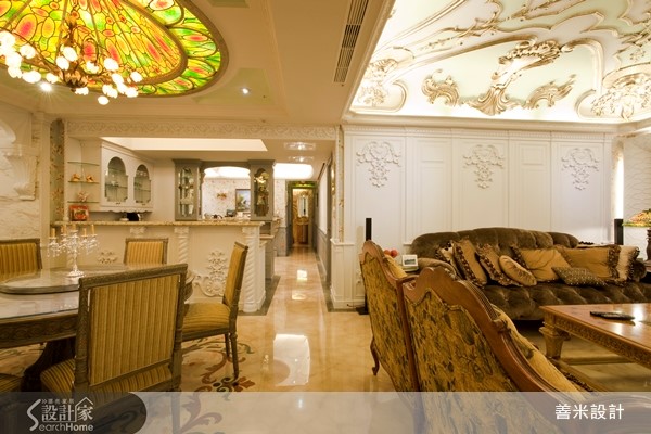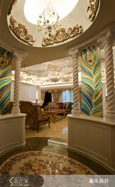 曾经幻想如果能住在城堡里,那该是多么梦幻浪漫的事?这间198平米的古典大宅,就满足了大家内心的渴望,从玄关到卧房匠心独运地铺排华丽装饰,俯仰皆是贵族般的高雅气息。【玄关椭圆天花板,置身凡尔赛宫】玄关透过弧形收纳柜结合实木雕刻立柱,界定出椭圆形的格局范围,而天井式的椭圆天花板饰以金色雕花,搭配彩色水晶灯,映照地板的花朵图腾,一进门就展现宛如法国凡尔赛宫的奢华大气。客厅同样在立面与天花板装饰雕花,配合细腻花纹的成套沙发及造型壁炉,衬托一家人团聚时的热闹模样。作为连结厨房与吧台区的轴心,餐厅运用锥形穹顶与灯光安排,以及地板的天然石材拼花,将重点围绕在用餐时的情感交流,让笑容为华美的家居锦上添花。另外,通向私领域及客卫的廊道,则在壁面妆点立体花卉雕饰,加上灰蓝色的门扉和花窗玻璃,彷佛一开门就会走入欧洲的知名大教堂。小编的最爱主卧天花藉由同心圆的设计,以向外辐射的折线塑造立体感,并在外缘滚上一圈手绘图案,让人像是身处童话中的旋转木马,化身爱丽丝来场梦游仙境。
