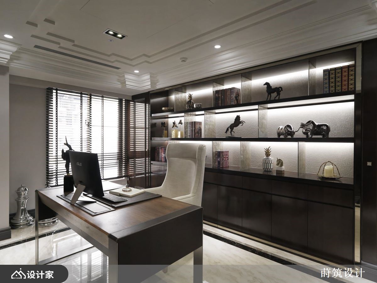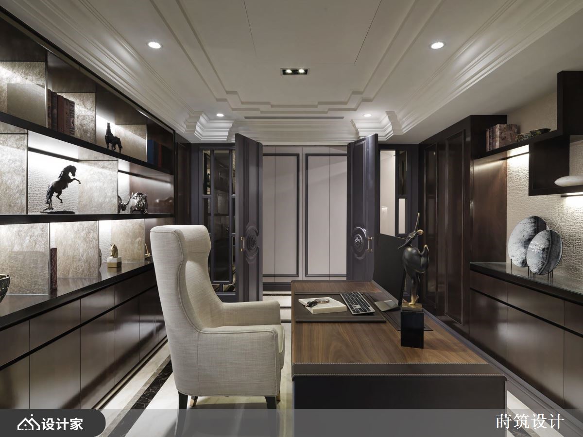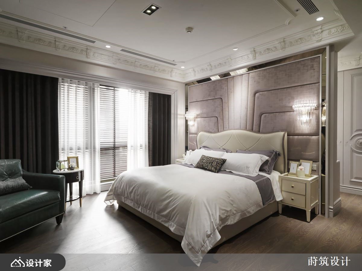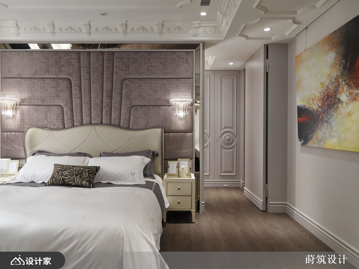 设计师运用古典风作为大户型底调,采以明镜、灰镜、大理石等材质做规划,并藉由深具层次的线条框架,搭佐贵气十足的淡紫铺陈,打造出符合屋主理想中的豪宅视野,快跟着小编一起来看看吧!客厅电视墙铺陈具自然纹理的大理石材,以同材质打造下方表示层板,并加入雕刻线板修饰,营造大器的主视觉画面,厅区天花板则赋与框架堆栈,不仅化解梁柱低矮的压迫问题,也界定各场域的使用范围;并在沙发背墙铺叙轻柔的淡紫色,成为画作与家饰品的绝佳衬底,与灰阶家具相得益彰,构筑典雅的公领域场景;餐厅领域,运用明镜及灰镜相互拼接,缔造透亮精致的立面表情,并延伸空间视觉感受,开放式的厨房,则选用发光玉石建构轻食吧台,形塑令人眼睛一亮的焦点;书房则配置双开门,于两侧加入通透玻璃,让室内可与廊道形成串连,内部引用大量深色木皮,搭配展示物装点,营造温润雅致的气息!小编的最爱 主卧室采熏衣草色做为床头主色,选用绷布为材质主体,周边佐以金属框边,在舒适与机能之中,替居室添入华丽品味!