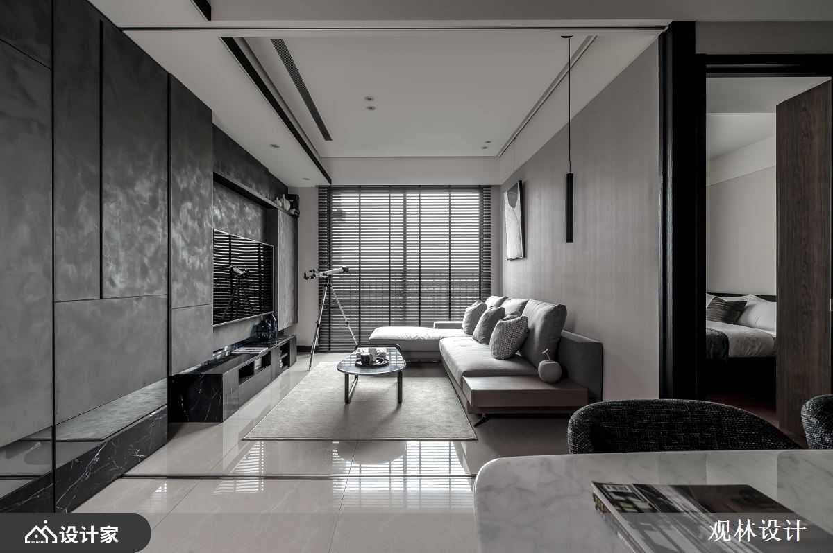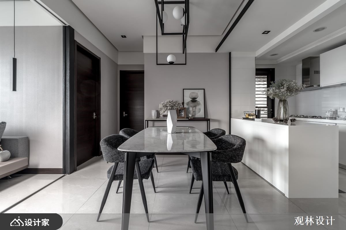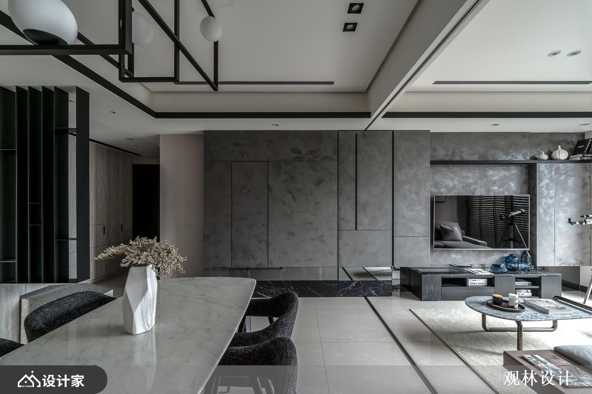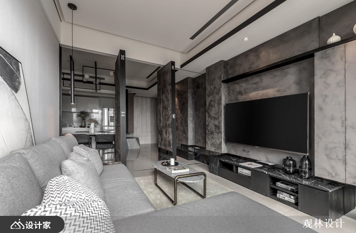 设计师运用线条比例、几何元素、低饱和色调、金属铁件、木百叶等,打造出充满人文质感的现代风视野,同时考虑到空间稍小,在客厅规划上运用拉折门串联场域、形成扩容作用,打造出弹性多变的生活情境,快跟着小编一起来看看吧!玄关区,摆放不规则的人造石、柜体做为端景,并连结黑色金属格栅,展现线性秩序之美,而柜体除了可摆放鞋子,同时也作为屋主高尔夫球具的收纳处;公领域,于客厅、餐厅之间加入拉折门拓展空间,不只利于屋主的私人时间运用,也让客厅身兼屋主亲友来时的客房;电视背景墙采用特殊的涂漆工法,绘制出如同油画般的艺术质感,底部则添加黑色大理石、镜面等,诠释内敛的低奢感;开放式的餐厅与厨房,透过弹性格局串联、与客厅产生交流对话,并于天花悬挂几何造型灯具,替空间勾勒利落线条,使视觉更具对称性!小编的最爱主卧室内,于墙面刻划细致线条,加以温润浅木色作基底,带来纾压的休寝氛围,软件搭配则符合屋主期待,选用皮革包覆的简约圆镜做妆点,符合实用性且不造成过多的视觉干扰!