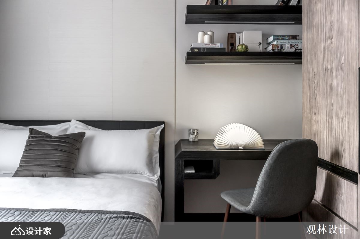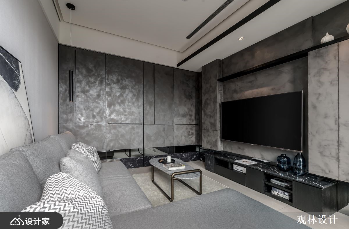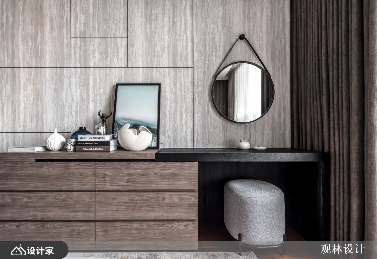 设计师运用线条比例、几何元素、低饱和色调、金属铁件、木百叶等,打造出充满人文质感的现代风视野,同时考虑到空间稍小,在客厅规划上运用拉折门串联场域、形成扩容作用,打造出弹性多变的生活情境,快跟着小编一起来看看吧!玄关区,摆放不规则的人造石、柜体做为端景,并连结黑色金属格栅,展现线性秩序之美,而柜体除了可摆放鞋子,同时也作为屋主高尔夫球具的收纳处;公领域,于客厅、餐厅之间加入拉折门拓展空间,不只利于屋主的私人时间运用,也让客厅身兼屋主亲友来时的客房;电视背景墙采用特殊的涂漆工法,绘制出如同油画般的艺术质感,底部则添加黑色大理石、镜面等,诠释内敛的低奢感;开放式的餐厅与厨房,透过弹性格局串联、与客厅产生交流对话,并于天花悬挂几何造型灯具,替空间勾勒利落线条,使视觉更具对称性!小编的最爱主卧室内,于墙面刻划细致线条,加以温润浅木色作基底,带来纾压的休寝氛围,软件搭配则符合屋主期待,选用皮革包覆的简约圆镜做妆点,符合实用性且不造成过多的视觉干扰!