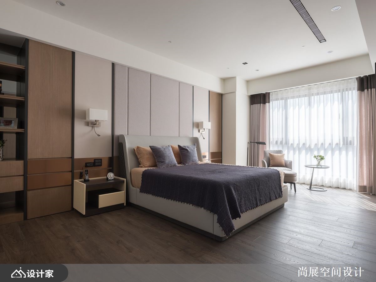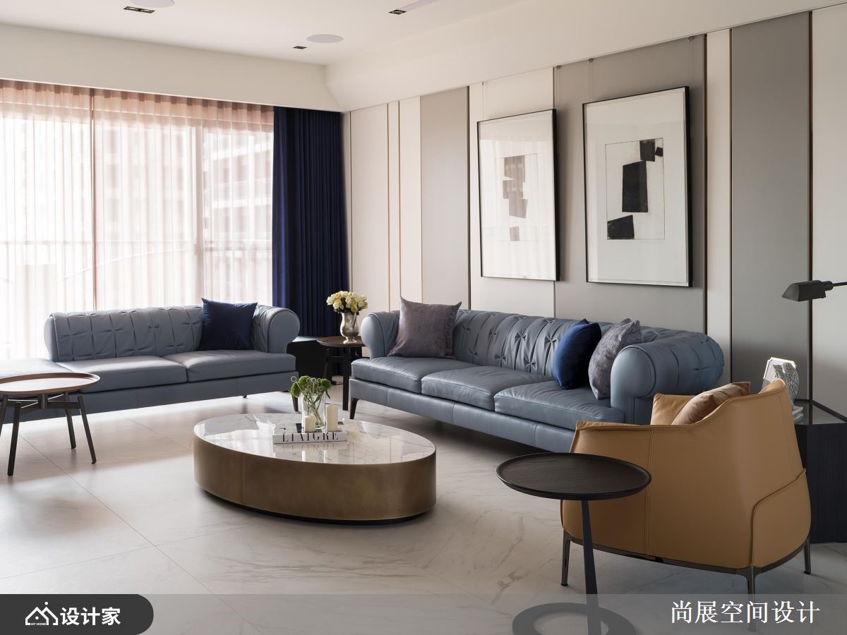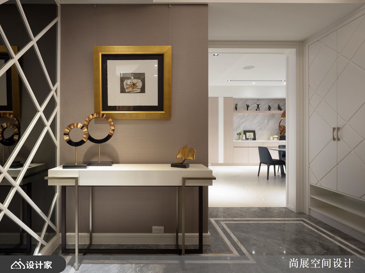 屋主一家原住在独栋楼,但因分层格局,有碍家人之间的交流,于是改换到此间单层大空间。经由尚展设计的空间规划,让新居延展出宽阔感,使家人更便于互动,同时妆点几何与线条元素,搭配精选的古铜元素,营造出美好的生活情境,快跟着小编一起来看看吧!从玄关开始,即可见古铜金黄灯饰与画框,呈现现代美式的时尚视野;厅区内,则导引落地窗外的日照流动全屋,结合利落线板与简洁的大理石电视墙,创造出具亲和力的品味场域,且梳理流畅动线,经由宽阔走道与留白配置,让家人之间更容易交流;餐厅区域,则配置高科技酒柜镶嵌在深色订制柜中,美感与机能兼具,古铜双餐灯除了提点温度,也带出微奢华的时尚焦点;主卧室作为男女主人的专属空间,除了兼具休憩睡眠机能,也在窗边创造一个多功能角落,安置单椅、桌几,围塑出适合阅读、思考、发呆的地方,并促成房间使用者的对话氛围!小编的最爱 小孩房,预先规划很大的收纳空间,并采取较中性的设计,让快速发育成长的孩子可在未来随时变更使用情境,只要更换少许软装,就能坐拥空间新风貌!